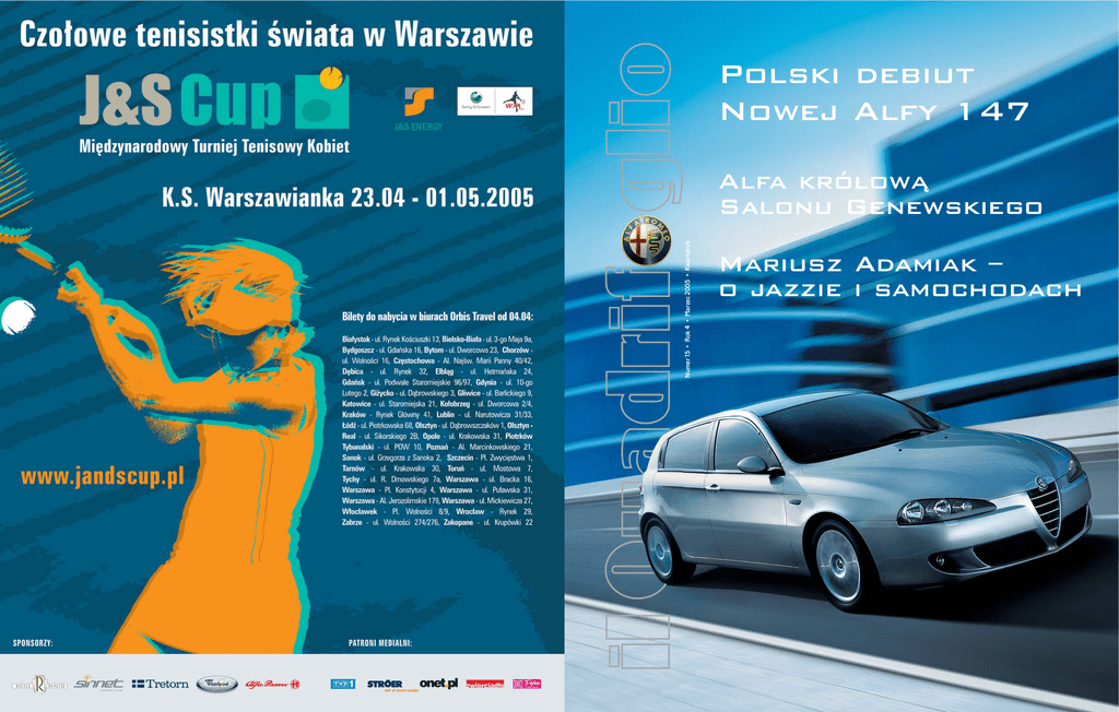 Polski debiut Nowej Alfy 147 Numer 15 • Rok 4 • Marzec 2005 • Kwartalnik Alfa królowà Salonu Genewskiego Mariusz Adamiak – o jazzie i samochodach od redakcji w numerze Szanowni Państwo Dla Alfy Romeo pierwsze miesiące roku obfitowały w ważne wydarzenia. Na rynku polskim była to podwójna premiera – nowej Alfy 147 oraz Alfy Crosswagon. Pierwszy z modeli to odnowiona i udoskonalona wersja samochodu, który zdobył na świecie uznanie zarówno 360 tysięcy klientów, jak i fachowców z dziedziny motoryzacji, nagradzających go najbardziej prestiżowymi tytułami z tytułem Samochodu Roku na czele. Nowa Alfa 147, zachowując atuty swej poprzedniczki, została wzbogacona agresywniejszym, a jednocześnie eleganckim designem i rozwiązaniami technicznymi. Crosswagon Q4 to model niezwykły, którym Alfa Romeo wraca do rodziny pojazdów z napędem na 4 koła. Właśnie nowatorski napęd zapewnia autu maksimum osiągów nawet w warunkach ekstremalnych. O obu modelach mogą Państwo przeczytać w tym numerze il Quadrifoglio. Piszemy w nim również o nowościach na skalę światową, czyli Alfie 159 oraz Brerze, które swą premierę miały podczas 75. salonu samochodowego w Genewie. W stoisku Alfy Romeo tłumy podziwiały piękne samochody zaprojektowane przez Giorgetto Giugiaro. To był ogromny sukces! Tym większy, że żadna europejska marka nie wprowadza na rynek w 2005 roku aż czterech nowych modeli. Stwarza to ogromne perspektywy na przyszłość i Alfa Romeo na pewno je wykorzysta. Z wizerunkiem producenta samochodów luksusowych wiąże się również zmiana wizerunku salonów sprzedaży Alfy Romeo. Cała sieć dealerska, również w Polsce, przybiera nowy wystrój według standardu Corporate Identity podkreślającego ekskluzywny charakter marki. Piszemy o tym w naszym magazynie, ale by ocenić i docenić te zmiany, zapraszamy Państwa do salonów Alfy Romeo! Maciej Zieƒ – tworzenie i pokaz kolekcji to wielkie Êwi´to dla projektanta strona Redaktor Naczelna Lucyna Bogusz 04 nr 15, rok 4 marzec 2005 WYDARZENIA 30 HISTORIA Założyciel marki Nazwisko Nicoli Romeo trwale związało się 06 MOTOR SHOW Alfa w Genewie ze sztandarową włoską marką samochodową Światowa premiera dwóch modeli Redaktor Naczelna Lucyna Bogusz Konsultacja Fiat Auto Poland Rafał Grzanecki Reklama Communication Manager Alfa Romeo Fiat Auto Poland ul. Szturmowa 2 02-678 Warszawa e-mail: [email protected] – Alfy 159 i Brery przyciągnęła tłumy 34 ROZMOWA Urzekła mnie włoska stylistyka Mariusz Adamiak opowiada o jazzie, 12 PREZENTACJA Oto nowa Alfa 147 samochodach i włoskich upodobaniach Zachowując atuty poprzedniczki, jest jeszcze Zespół redakcyjny Anna Borsukiewicz Filippo Gallino Jerzy Kozierkiewicz Mirosława Malich Konsultacja redakcyjna Francesco Novo Satiz srl Turyn Wydawca Satiz Poland ul. 11 Listopada 60/62 43-300 Bielsko-Biała tel 0 [33] 813 27 61 fax 0 [33] 813 41 76 www.satiz.pl [email protected] piękniejsza i bardziej nowoczesna 38 AKCESORIA Linea Alfa 20 TEST DRIVE Sardyńska próba 42 IDENTITY Napęd na 4 koła Alfy Crosswagon Q4 pokonał Alfy w nowej salonowej oprawie bezdroża podczas testowych tras na Sardynii Salony Alfy Romeo dopasowują się do ekskluzywnego charakteru marki Konsultacja graficzna makiety Jerzy Woszczyński 26 Dyrektor Artystyczny Maciej Feodorów Druk Dimograf ul. Legionów 83 43-300 Bielsko-Biała Studio DTP Satiz Poland Oddano do druku w dniu 21 marca 2005 r. Nakład 10 000 egz. Moda Najpierw trzeba zaciekawić… 46 KLUBY Urzeczeni Alfą Maciej Zień opowiada o modzie, swojej najnowszej kolekcji, a także o stylu, pieniądzach i samochodach 48 Dealerzy i KLUBY Dealerzy Alfa Romeo w Polsce 26 motorshow rozmowa Rubinowa i srebrna Alfa 159 oraz koralowa Brera – wspaniałe coupé zaprojektowane przez Giorgetto Giugiaro już w wersji seryjnej – przyciągały w Genewie do stoiska Alfy Romeo tłumy miłośników pięknych samochodów. Alfa w Genewie Dwie Êwiatowe premiery Francesca Rech S wymi kolorami auta znakomicie wpisywały się w wystrój stoiska Alfy Romeo na 75. Międzynarodowym Salonie Samochodowym w Genewie. Utrzymane w kolorach czerwieni i metalizowanej szarości – barw, które od zawsze podkreślały sportowy charakter i wyszukaną technologię samochodów Alfa Romeo – było znakomitym tłem dla dwóch światowych premier modeli 159 i Brera, stanowiących dla firmy początek nowej generacji samochodów. Światowa premiera to dla każdego producenta ukoronowanie wielu godzin prac projektantów i konstruktorów przy nowym modelu. To wielkie święto połączone z... odrobiną niepewności, jak wypadnie pierwsza konfrontacja z fachowcami z branży motoryzacyjnej oraz przyszłymi użytkownikami samochodu. Gdy ze szczelnie przykrytych aut zdjęto pomarańczowe zasłony i rozbłysły flesze aparatów fotograficznych, a stoisko Alfy Romeo wypełnił tłum ciekawych, niepokój prysł. Wiadomo było, że marka po raz kolejny odniosła sukces. Alfa 159 – nowa generacja sedana Ekspozycja Alfy Romeo w Genewie podzielona została na kilka części poświęconych poszczególnym modelom samochodów. Jej centrum zajęły dwa sedany – Alfy 159. Pierwsza z nich, koloru rubinowej czerwieni, mającym podkreślić klasyczny sportowy charakter auta, to wersja Q4, – z silnikiem 2.4 JTD o mocy 200 KM – „odziano” w srebrną karoserię, która wyróżnia nową generację samochodów Alfa Romeo. Nadwozie modelu 159, zaprojektowane przez Giorgetto Giugiaro we współpracy z Centrum Stylu Alfy, odwiedzający salon uznali za jedno z najpiękniejszych na całej genewskiej ekspozycji samochodów. 6 Fot. Witold Blady wyposażona w nowy silnik 3.2 V6 JTS 24v o mocy 260 KM. Drugą motorshow Fot. Witold Blady Mi´dzy przesz∏oÊcià a przysz∏oÊcià Przyciąga wzrok linia auta – sportowa w charakterze, wszystkie z bezpośrednim wtryskiem benzyny. Poza nimi są a jednocześnie elegancka. Jego agresywny przód w kształcie również trzy silniki d