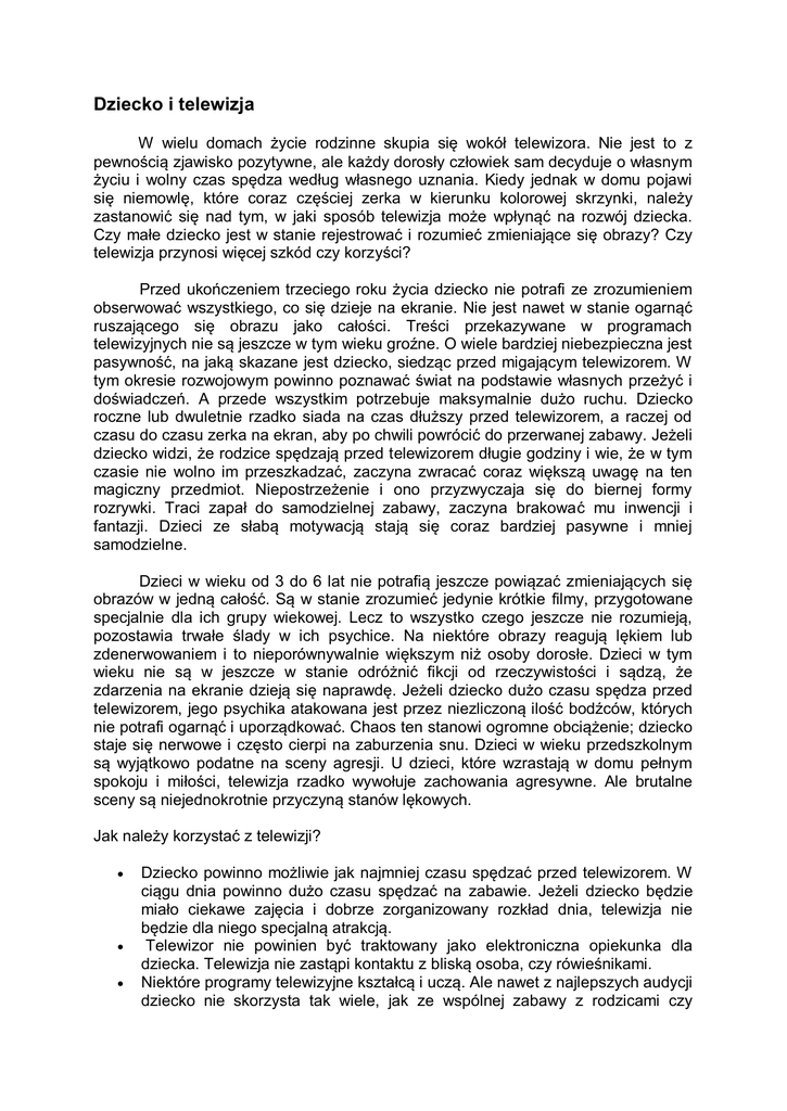 Dziecko i telewizja W wielu domach życie rodzinne skupia się wokół telewizora. Nie jest to z pewnością zjawisko pozytywne, ale każdy dorosły człowiek sam decyduje o własnym życiu i wolny czas spędza według własnego uznania. Kiedy jednak w domu pojawi się niemowlę, które coraz częściej zerka w kierunku kolorowej skrzynki, należy zastanowić się nad tym, w jaki sposób telewizja może wpłynąć na rozwój dziecka. Czy małe dziecko jest w stanie rejestrować i rozumieć zmieniające się obrazy? Czy telewizja przynosi więcej szkód czy korzyści? Przed ukończeniem trzeciego roku życia dziecko nie potrafi ze zrozumieniem obserwować wszystkiego, co się dzieje na ekranie. Nie jest nawet w stanie ogarnąć ruszającego się obrazu jako całości. Treści przekazywane w programach telewizyjnych nie są jeszcze w tym wieku groźne. O wiele bardziej niebezpieczna jest pasywność, na jaką skazane jest dziecko, siedząc przed migającym telewizorem. W tym okresie rozwojowym powinno poznawać świat na podstawie własnych przeżyć i doświadczeń. A przede wszystkim potrzebuje maksymalnie dużo ruchu. Dziecko roczne lub dwuletnie rzadko siada na czas dłuższy przed telewizorem, a raczej od czasu do czasu zerka na ekran, aby po chwili powrócić do przerwanej zabawy. Jeżeli dziecko widzi, że rodzice spędzają przed telewizorem długie godziny i wie, że w tym czasie nie wolno im przeszkadzać, zaczyna zwracać coraz większą uwagę na ten magiczny przedmiot. Niepostrzeżenie i ono przyzwyczaja się do biernej formy rozrywki. Traci zapał do samodzielnej zabawy, zaczyna brakować mu inwencji i fantazji. Dzieci ze słabą motywacją stają się coraz bardziej pasywne i mniej samodzielne. Dzieci w wieku od 3 do 6 lat nie potrafią jeszcze powiązać zmieniających się obrazów w jedną całość. Są w stanie zrozumieć jedynie krótkie filmy, przygotowane specjalnie dla ich grupy wiekowej. Lecz to wszystko czego jeszcze nie rozumieją, pozostawia trwałe ślady w ich psychice. Na niektóre obrazy reagują lękiem lub zdenerwowaniem i to nieporównywalnie większym niż osoby dorosłe. Dzieci w tym wieku nie są w jeszcze w stanie odróżnić fikcji od rzeczywistości i sądzą, że zdarzenia na ekranie dzieją się naprawdę. Jeżeli dziecko dużo czasu spędza przed telewizorem, jego psychika atakowana jest przez niezliczoną ilość bodźców, których nie potrafi ogarnąć i uporządkować. Chaos ten stanowi ogromne obciążenie; dziecko staje się nerwowe i często cierpi na zaburzenia snu. Dzieci w wieku przedszkolnym są wyjątkowo podatne na sceny agresji. U dzieci, które wzrastają w domu pełnym spokoju i miłości, telewizja rzadko wywołuje zachowania agresywne. Ale brutalne sceny są niejednokrotnie przyczyną stanów lękowych. Jak należy korzystać z telewizji? Dziecko powinno możliwie jak najmniej czasu spędzać przed telewizorem. W ciągu dnia powinno dużo czasu spędzać na zabawie. Jeżeli dziecko będzie miało ciekawe zajęcia i dobrze zorganizowany rozkład dnia, telewizja nie będzie dla niego specjalną atrakcją. Telewizor nie powinien być traktowany jako elektroniczna opiekunka dla dziecka. Telewizja nie zastąpi kontaktu z bliską osoba, czy rówieśnikami. Niektóre programy telewizyjne kształcą i uczą. Ale nawet z najlepszych audycji dziecko nie skorzysta tak wiele, jak ze wspólnej zabawy z rodzicami czy rówieśnikami. U dzieci starszych telewizja może spełniać funkcje edukacyjne przede wszystkim wówczas, kiedy jej programy ( treści) będą stanowić punkt wyjścia do samodzielnej pracy nad książką czy atlasem. Ustalamy wcześniej, jakie programy dziecko będzie oglądać w ciągu tygodnia. Dzieci w wieku od 3-6 lat mogą spędzać pół godziny dziennie przed telewizorem, głównie we wczesnych godzinach przedpołudniowych. Nie powinny oglądać telewizji przed pójściem spać, a zamiast tego rodzice powinni przeczytać dziecku bajkę lub porozmawiać o minionym dniu. Dziecko nie powinno samo siedzieć przed telewizorem, szczególnie w ciemnościach. Dzieci razem z rodzicami powinny oglądać programy. Niekiedy potrzebne są wyjaśnienia lub dziecko ma ochotę porozmawiać o tym, co dzieje się na ekranie. Jeżeli nie ma chęci samo mówić, zapytajcie je, co było szczególnie ciekawe lub co mu się najbardziej podobało. Jeżeli dziecko opowie zdarzenia, które widziało w telewizji, będzie je w stanie dokładniej zrozumieć, przetworzyć je lepiej i wieczorem szybciej zaśnie. Natomiast rodzice będą mogli zorientować się, czy program nie był zbyt trudny i czy nie wywołał uczucia strachu u dziecka. Programy telewizyjne nie powinny mieć wpływu na przewidziany rozkład dnia. Ciekawa audycja nie może być przyczyną odłożenia zaplanowanej np. wycieczki. Pory posiłków i innych stałych pozycji w harmonogramie dnia nie powinny być ustalone w zależności od programu telewizyjnego. Unikać należy spożywania posiłków przy włączonym telewizorze a już Szczególnie, kiedy przy stole zbiera się cała rodzina. Nierzadko jest to jedyna okazja, by porozmawiać o wydarzeniach dnia. Telewizja nie powinna być wykorzystywana w kategorii kary i nagrody. Jeżeli dziecko będzie wiedziało, że za dobre zachowanie może obejrzeć ciekawy program telewizja urośnie w jego oczach do czegoś wspaniałego i stanie się celem, do którego należy dążyć. Jeżeli rodzice zauważą, że dziecko ma kłopoty z koncentracją lub źle śpi, powinni na jakiś czas wyeliminować oglądanie telewizji. Nie może to być traktowane jako kara. Dzieci, które dużo czasu spędzają przed telewizorem mają zbyt mało ruchu. A dla małego dziecka ruch jest niezbędnym warunkiem prawidłowego rozwoju. Zły kąt widzenia i niewygodna pozycja podczas oglądania telewizji są przyczynami złego samopoczucia. Dzieci powinny leżeć przed telewizorem na brzuchu, siedzieć "po turecku" lub kucać. Te pozycje zapewniają większą swobod