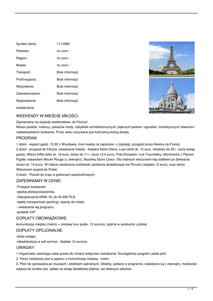 Symbol oferty: 111/2881 Państwo: no conv : Region: no conv : Miasto: no conv : Transport: Brak informacji Profil wyjazdu: Brak informacji Wyżywienie: Brak informacji Zakwaterowanie: Brak informacji Wyposażenie: Brak informacji świadczenia: WEEKENDY W MIEŚCIE MIŁOŚCI Zapraszamy na wyjazdy weekendowe, do Paryża! Miasto poetów, malarzy, pokazów mody, zabytków architektonicznych, pięknych parków i ogrodów, romantycznych skwerów i nadsekwańskich bulwarów. Przez wielu nazywane jest kulturalną stolicą świata. PROGRAM 1 dzień - wyjazd (godz. 15.30 z Wrocławia, inne miasta na zapytanie i z dopłatą), przejazd przez Niemcy do Francji. 2 dzień - przyjazd do Paryża, zwiedzanie miasta - Katedra Notre Dame, Luwr (bilet ok. 15 euro, młodzież do 25 r. życia wstęp gratis), Wieża Eiffla (bilet ok. 16 euro, dzieci do 11 r. życia 13,5 euro), Pola Elizejskie i Łuk Tryumfalny, Montmartre z Placem Pigalle, kabaretem Moulin Rouge (z zewnątrz), Bazyliką Sacre Coeur. Dla chętnych wieczorem rejs statkiem po Sekwanie (koszt ok. 14 euro). W trakcie zwiedzania możliwość zjedzenia obiadokolacji we Flunchu (dopłata 12 euro), czas wolny. Wieczorem wyjazd do Polski. 3 dzień - Powrót do kraju w godzinach popołudniowych. ZAPEWNIAMY W CENIE: -Przejazd autokarem -opiekę pilota/przewodnika -Ubezpieczenie NNW, KL do 40.000 PLN -opłaty transportowe (parkingi, wjazdy do miast) - zwiedzanie wg programu -podatek VAT DOPŁATY OBOWIĄZKOWE: komunikacja miejska (metro) + zestawy tour quide- 12 euro/os. (płatne w autokarze u pilota) DOPŁATY OPCJONALNE -bilety wstępu -obiadokolacja w self-service - dopłata 12 euro/os. UWAGA!!! 1.Organizator zastrzega sobie prawo do zmiany kolejności zwiedzania. Szczegółowy program ustala pilot. 2. Paryż zwiedzany jest w oparciu o komunikację miejską - metro 3. Pilot nie oprowadza po muzeach i obiektach sakralnych. Obiekty, podane w programie, zwiedzane są z zewnątrz, możliwość wejścia do środka (ew. opłata za wstęp dodatkowo płatna), we własnym zakresie. 1/2 4. Możliwość wykupienia ubezpieczenia od rezygnacji z wyjazdu za 4% wartości imprezy oraz chorób przewlekłych, szczegóły w biurze. 5. Na wyjazd wymagany dowód osobisty lub paszport (ważny min. 3 miesiące od daty powrotu z wycieczki). UWAGI DO PRZEJAZDU 1. Autobus podstawowy wyjeżdża z Wrocławia. Z pozostałych miast realizowane są tzw. połączenia antenowe przy min. 10 osobach (za dopłatą), realizowane różnymi środkami transportu: samochód osobowy, bus, pociąg, autobusy liniowe. Połączenia antenowe potwierdzane są na 72 godziny przed datą wyjazdu. Katowice, Gliwice (35 zł) Warszawa (120 zł), Kraków (70 zł), Łódź (120 zł). Inne miasta na zapytanie. 2. Przewozy antenowe są skomunikowane ze sobą, co może powodować oczekiwanie w miejscach przesiadkowych, zwłaszcza w terminach powrotu. TERMINY: CENNIK: Długość pobytu: dni Grupa cenowa: Waluta: PLN Aktualne ceny z systemu S.A.R.T. (-) - cena usługi, podatku kalkulowana przy osobie lub gratis (*) - kwota wliczona w cenę standardową 2/2