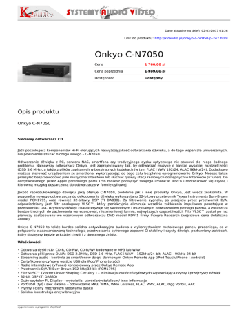 Dane aktualne na dzień: 02-03-2017 01:26 Link do produktu: http://k2audio.pl/onkyo-c-n7050-p-247.html Onkyo C-N7050 Cena 1 760,00 zł Cena poprzednia 1 999,00 zł Dostępność Dostępny Opis produktu Onkyo C-N7050 Sieciowy odtwarzacz CD Jeśli poszukujesz komponentów Hi-Fi oferujących najwyższą jakość odtwarzania dźwięku, a do tego wspaniale uniwersalnych, nie powinieneś szukać niczego innego – C-N7050. Odtwarzanie dźwięku z PC, serwera NAS, smartfona czy tradycyjnego dysku optycznego nie stanowi dla niego żadnego problemu. Najnowszy odtwarzacz Onkyo, jest zaprojektowany tak, by odtwarzać muzykę o bardzo wysokiej rozdzielczości (DSD 5.6 MHz), a także z plików zapisanych w bezstratnych kodekach (w tym FLAC i WAV 192/24, ALAC 96kHz/24). Dodatkowo możesz sterować urządzeniem ze smartfona, wykorzystując do tego celu bezpłatne oprogramowanie Onkyo. Możesz także przesyłać bezprzewodowo pliki muzyczne z telefonu lub słuchać tysięcy stacji radiowych dostępnych w Internecie (vTuner). Do certyfikowanego przez Apple przedniego portu USB możesz podłączyć swojego iPhone’a/ iPod’a i rozkoszować się czystą i klarowną muzyką dostarczoną do odtwarzacza w formie cyfrowej. Jakość reprodukowanego dźwięku jaką oferuje C-N7050, podobnie jak i inne produkty Onkyo, jest wręcz znakomita. W przypadku nowego odtwarzacza do dekodowania dźwięku wykorzystano 32-bitowy przetwornik Texas Instruments Burr-Brown model PCM1795, oraz również 32-bitowy DSP (TI DA830). Za filtrowanie sygnału, po przejściu przez przetwornik D/A, odpowiedzialny jest filtr analogowy VLSC™, który perfekcyjnie eliminuje wszelkie zakłócenia impulsowe powstające w przetworniku D/A. Uzyskany dźwięk charakteryzuje się swobodnym i muzykalnym odtwarzaniem pełnego pasma, a zwłaszcza bardzo trudnych do zachowania we wzorcowej, niezmienionej formie, najwyższych częstotliwości. Filtr VLSC™ został po raz pierwszy zastosowany we wzorcowym odtwarzaczu DVD model RDV-1 firmy Integra Research (wejściowa cena detaliczna 4000€). Onkyo C-N7050 to także bardzo solidna antywibracyjna budowa z wykorzystaniem metalowego panelu przedniego, co w połączeniu z zaawansowaną technologią przetwarzania cyfrowego zapewni Ci stabilny i czysty dźwięk, pozbawiony zakłóceń, który dostępny będzie w każdej chwili i z dowolnego źródła. Właściwości: • • • • • • • • • • • • Odtwarza dyski: CD, CD-R, CD-RW, CD-R/RW kodowane w MP3 lub WAV Odtwarza pliki przez DLNA: DSD 2.8MHz, DSD 5.6 MHz, FLAC i WAV – 192kHz/24-bit, ALAC – 96kHz-24-bit Streaming audio i kontrola ze smartfonów dzięki darmowym Onkyo Remote App (iPod Touch/iPhone i Android) Certyfikowane cyfrowe wejście USB dla iPod/iPhone (przód) Radio internetowe (vTuner) kontrolowany przez Onkyo Remote App Przetwornik D/A TI Burr-Brown 192 kHz/32-bit (PCM1795) Filtr VLSC™ (Vector Linear Shaping Circuitry ) – eliminacja zakłóceń cyfrowych zapewniająca czysty i przejrzysty dźwięk 32-bit DSP (TI DA830) Duży czytelny FL Display – wyświetla: utwór/artysta/album/ inne informacje Port USB (tył) i sieć lokalna – odtwarzanie MP3, WMA, WMA Lossless, FLAC, WAV, ALAC, Ogg Vorbis, AAC Płynny i cichy mechanizm ładowania dysku Solidna konstrukcja antywibracyjna wygenerowano w programie shopGold • • • • • • • • Pamięć 25-utworów, odtwarzanie losowe/powtórka Pamięć 3 stacji internetowych z funkcją vTuner Bookmark Funkcja Auto Standby 3 tryby jasności wyświetlacza (Normal/Dim/Dimmer) 2 wyjścia cyfrowe (koaksjalne i optyczne) Wyjście analogowe dźwięku Wejście Ethernet Wejście/wyjście RI Produkt posiada dodatkowe opcje: Kolor wykończenia: Black , Silver marka Onkyo Firma rozpoczęła swoją działalność pod nazwą Osaka Denki Onkyo KK w 1946 roku. Obecnie Onkyo Corporation obejmuje oddziały Integra i Integra Research , jak i również główny brand Onkyo. Obecnie na czele Onkyo Corporation stoi Naoto Othsuki. W początkach swojej historii, Onkyo silnie zaznaczyło swoją obecność w branży audio, dzięki czemu nazwa Onkyo stała się synonimem doskonałości w reprodukcji dźwięku produkując wysokiej jakości głośniki i ich komponenty. W latach 70 odbiorniki ONKYO zdobyły uznanie krytyków . Produkty z lat 80, w tym magnetofony kasetowe, wzmacniacze serii M, gramofony, AM / FM tunery, takie jak jak T-909 i T-9990 oraz odbiorniki zebrały uznanie krytyków i konsumentów. W 1993 roku Brand Onkyo stał się jednym z pierwszych i głównych podmiotów korporacyjnych, aby radykalnie zmienić sposób zarządzania przedsiębiorstwem przez filozofie "Cash flow first”" i "Simple and speedy" . Koncentrując się na reformie zarządzania korporacją pozwoliło zwiększyć rentowność całej grupy Onkyo. ☑ HISTORIA MARKI 1946 - 17 września Onkyo powstaje jako "Osaka Denki Onkyo", i zaczyna prace badawczye nad „pick-ups” i obudowami głośników. Zostaje utworzone Osaka Denki ONKYO KK i rozpoczyna się produkcja ramion do gramofonów. Onkyo CP-100 pierwszy produkt z logo Onkyo - wchodzi w handlu. Jego cena detaliczna: 300 Yenów - w czasach, w których średni miesięczny dochód wynosi do 500 jenów. 1948 - Rozwój technologii "nie wciśniętego stożka" (nie wciśnięty stożek membrany głośnika) rewolucjonizuje przemysł głośnikowy. Onkyo zabiera się za strukturę głośników i projektuje specjalne materiały dla membran. 1950 - Pierwszy sukces – prace nad „nie wciśniętym papierowym stożkiem” zostają zakończone. Głośnik Onkyo ED-100. Na rynku pojawia się 4-prędkościowy odtwarzacz stereo HiFi ONKYO OP-670. 1955 - Pojawia się wzmacniacz radiowy OS-88. 1956 - Koncentryczna obudowa głośnika zostaje wprowadzana do obrotu. Pojawiają się informacje o pierwszym głośniku z plastikowym stożkiem i pierwszym kompaktowym urządzeniu gramofonowym i odbiorniku. 1957 - Pierwszy głośnik w kształcie kuli ES-65 inspiruje cały dizajnerki rynek. Poj