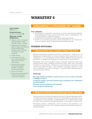 ROZDZIAŁ 3 | WARSZTAT 6 WARSZTAT 6 Czas trwania: 1,5 godziny Grupa docelowa: Dorośli i młodzież 15+ Materiały i środki dydaktyczne: • zdjęcia roślin, rosnących na plantacjach: kawy, herbaty, kakao i mango; • opakowania lub dobrej jakości zdjęcia produktów ze Sprawiedliwego Handlu: kawy, herbaty, czekolady i mango suszone; • mapa świata; • arkusz pomocniczy dla uczestników (patrz załącznik na końcu warsztatu); • dwie paczki herbaty: ze Sprawiedliwego Handlu i z handlu konwencjonalnego; • filmy na YouTube: • karteczki samoprzylepne i tablica lub flipchart z arkuszami papieru. KONSUMENCI A SPRAWIEDLIWY HANDEL Cele i założenia • Przybliżenie uczestnikom informacji na temat wybranych produktów Sprawiedliwego Handlu, takich jak herbata, kawa, czekolada itp., np. o ich pochodzeniu, składzie i jakości; • Przybliżenie uczestnikom zasad Sprawiedliwego Handlu. • Pomoc w zrozumieniu korzyści, jakie producentom i ich społecznościom w krajach ubogich zapewnia Sprawiedliwy Handel. PRZEBIEG SPOTKANIA 1. Skąd pochodzi kawa, herbata i kakao? 20 minut Rozdaj uczestnikom powielone arkusze z załącznika 1. Poproś ich, by dopasowali zamieszczone w arkuszu zdjęcia roślin uprawnych do pochodzących z nich produktów, których próbki (zdjęcia) przyniosłeś na spotkanie, a następnie by wskazali na mapie kraje ich pochodzenia. Następnie niech obliczą podział zysku z jednego kilograma kawy oraz jednej filiżanki kawy, ustalając przeciętne znane sobie ceny, pomiędzy rolników a supermarket i kawiarnię (x groszy/złotych oraz procent dla rolnika, dla supermarketu i dla kawiarni), używając arkusza z ceną kawy. Zakładamy, że rolnik w Etiopii za 1 kg ziarna kawy dobrego gatunku otrzymuje ok. 8,50 zł. Dyskusja Dlaczego niektóre produkty, używane przez nas na co dzień, pochodzą z odległych krajów? W którym miejscu łańcucha dostawczego uzyskiwana jest największa wartość dodana? Dlaczego zysk jest dzielony w ten sposób? Jakie są tego konsekwencje? 2. Badanie produktów Sprawiedliwego Handlu: 20 minut Daj uczestnikom do obejrzenia paczki herbaty ze Sprawiedliwego Handlu i z handlu konwencjonalnego. Poproś ich o zanotowanie, jakie informacje o produktach można znaleźć na opakowaniach (np. rodzaj herbaty, skąd pochodzi, kto ją uprawiał, jaka jest jej jakość, co się dzieje z zyskami itd.). Następnie poproś o wskazanie, czym się różnią oba produkty, oraz o wyszukanie informacji, które dotyczą wyłącznie produktów Sprawiedliwego Handlu. SPRAWIEDLIWY HANDEL ETYCZNA KONSUMPCJA I PORADNIK EDUKACYJNY ROZDZIAŁ 3 | WARSZTAT 6 Dyskusja Co z punktu widzenie konsumenta sprawia, że produkty Sprawiedliwego Handlu są atrakcyjne? Dlaczego kwestie etyczne są ważne dla niektórych konsumentów? Jakie inne czynniki wpływają na konsumentów przy wyborze produktu w sklepie? 3. Oglądamy filmy: 25 minut Obejrzyjcie wspólnie poniższe filmy na YouTube. Poproś uczestników, aby zwrócili uwagę, jakie korzyści przyniósł Sprawiedliwy Handel producentom oraz ich społecznościom. O Sprawiedliwym Handlu opowiada Mallamma Yalawar z Indii (2:11): www.youtube.com/watch?v=1IKRl-Ojpf4 O Sprawiedliwym Handlu opowiada Meera Bhattarai z Nepalu (3:07): www.youtube.com/watch?v=vWW2Hw_T6jc O Sprawiedliwym Handlu opowiada Shah Abdus Salam z Bangladeszu (2:54): www.youtube.com/watch?v=6LiGAqIO7Fc O Sprawiedliwym Handlu opowiada S.C. Mittal z Indii (2:46): www.youtube.com/watch?v=hZPnevHipcg Zachęć grupę do dyskusji na temat filmów i poproś, aby określili pięć korzyści, które przyniósł producentom Sprawiedliwy Handel. Poproś o określenie najważniejszej korzyści i uzasadnienie tego wyboru. Następnie poproś uczestników, by i oni odpowiedzieli na pytania, jakie postawiono bohaterom filmów: Czym jest dla Ciebie Sprawiedliwy Handel? Dlaczego ważne jest, aby chronić środowisko naturalne? W jaki sposób zmiany klimatu wpływają na Twoją społeczność? Gdybyś mógł porozmawiać z członkiem Parlamentu Europejskiego, co byś mu powiedział na ten temat? 4. Ruchoma debata na temat Sprawiedliwego Handlu: 20 minut Aby podsumować zdobytą wiedzę, grupa będzie uczestniczyć w ruchomym głosowaniu. Ustal, że jeden koniec sali oznacza „Zgadzam się”, a drugi - „Nie zgadzam się”. Powiedz, że będziesz czytać zdania poddawane pod głosowanie, a uczestnicy mają wybrać miejsce w skali od „Zgadzam się” do „Nie zgadzam się”. Jeśli są niezdecydowani, zostają na środku sali. Oto przykłady (możesz też opracować własne): Obecnie w Polsce ludzie za bardzo martwią się o swoje pieniądze, żeby przejmować się producentami w odległych krajach. Producenci mają prawo do uczciwej zapłaty za produkty, które uprawiają. Personelowi w zakładach gastronomicznych nie jest potrzebna wiedza, skąd pochodzą poszczególne produkty i jak są one wytwarzane. Produkty Sprawiedliwego Handlu w menu tworzą pozytywną atmosferę w kawiarni. Poproś kilku uczestników o wyjaśnienie, dlaczego wybrali takie, a nie inne miejsce na sali. Po wysłuchaniu wypowiedzi spytaj, czy ktoś zmienił swoją opinię i chce zmienić miejsce. Dyskusja Możesz zachęcić uczestników do formułowania własnych zagadnień, które zostaną wykorzystane w kolejnych rundach ruchomej debaty. ROZDZIAŁ 3 | WARSZTAT 6 5. Podsumowanie: 5 minut Daj każdemu uczestnikowi 2 karteczki samoprzylepne i poproś ich o zapisanie jednej rzeczy, jakiej się nauczyli, i jednej rzeczy, którą odtąd będę robić. Poproś, aby przykleili karteczki do tablicy i zapoznali się z kartkami innych uczestników, zanim opuszczą salę. Zadanie dla grupy po zakończeniu warsztatu Zachęć uczestników, aby nakręcili własne krótkie filmy, adresowane do posłów, senatorów oraz członków Parlamentu Europejskiego, w których zawrą swoje wypowiedzi, wzorowane na filmach obejrzanych w trakcie warsztatu. Następnie takie filmy mogą zamieścić na YouTube i zawiadomić adre