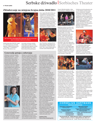 3 I Theater plus Serbske dźiwadło I Sorbisches Theater Zhladowanje na minjenu hrajnu dobu 2010/2011 nimo, wopyta dźiwadło tež hižo zaso swój publikum na hornjoserbskich wjeskach, a to w adwentnym času ze swójbnym předstajenjom „Woł a wosoł” wot awtora Norberta Ebela. 1325 přihladowarjow w Dźiwadle na hrodźe a na serbskich wjeskach dožiwi na 15 předstajenjach tutu njewšědnu hodownu stawizničku. Hladajo na dobru rezonancu wobeju inscenacijow bě to tuž přewšo wuspěšny start do se- Die Texte dieser Seite können Sie in deutscher Sprache im Internet unter www.theater-bautzen.de nachlesen Serbska hrajna doba 2010/2011 zahaji so w zašłej nazymje raz cyle hinak, mjenujcy z delnjoserbskej premjeru „Tucna lubosć”, 24.septembra w Hochozy. Dźiwadło je z tym wuwzaćnje swój turnus změniło, wšako měješe za nalěćo wosebitu narodninsku překwapjenku za delnjoserbske dźěći planowane. Lědma běchu delnjoserbske předstajenja zony. Zwjeselace a spokojace bě tež dźěło wokoło del-njoserbskeje inscenacije klankohry „Bremenske muzikanty” lětsa w aprylu składnostnje 50. narodnin našeho klankodźiwadła. Generacije putaja a zabawjeja Zhladujemy wróćo na wuspěšnu hrajnu dobu 2010/2011 – wosom serbskich premjerow, z toho tři delnjoserbskich. Mały rekord ¬ a tak natwarjamy z elanom našu přichodnu hrajnu dobu połnu zabawneho a putaceho dźiwadła. „Generacije“ rěka hesło a wopisuje žro toho, štož smy sej za wulkich a małych přihladowarjow předewzali. Startować chcemy ze serbskej inscenaciju, kotruž předstaja dźiwadło po starodawnej tradiciji ducy po serbskich wsach. „Marathon“ – za sportowcow te wužadanje, běh žiwjenja, bój wo dopóznaće, dobyće, přetraće, připóznaće. Francoza Claude Confortès je hru před nimale 40 lětami napisał. W Čěskej bě wona we 80tych lětach přewšo znata a wuspěšna. Za naš serbski publikum smy aktualnu wersiju nadźěłali z pomocu přełožowarki Měrany Cušcyneje. Wjeselić móžeće so na komediantiske, hnujace a zdobom sportiwne dźiwadłowe dožiwjenje, na grotesknu stawiznu wo žiwjenju a smjerći, přećelstwje a zawisći, kiž wjedźe běharjow na swoje hranicy a publikum na žro našeho towaršnostneho byća. Při woprawdźitym marathonje rěka tež častohdy: „Pódla być, je wšo!“ W tutym zmysle widźimy so we wašej wjesnej žurli. A nimale móžemy tam tež hnydom wćipni na přichodne předewzaće sedźo wostać. Na serbsce wuknjace dźěći měri so naša stawizna wo małym njetopyrje „Stellaluna“. Wona je z njebja runu smuhu do ptačeho hnězda padnyła. Njerěči jenož hinak, hač małe wroble, ně, wona je tež hinaša hač ptački. Wisa na hłowje, spi wodnjo a nježerje poprawom žane wački. Małe wroble nawuknu serbske słowa njetopyrja. Žiwjenje je dyrdomdej a kóždy wostanje swój. Najwažniše pak je přećelstwo. Z tutej inscenaciju budźemy runje tak po puću, kaž z našej hodownej stawiznu za serbske dźěći a jich swójby. Po tym, zo běštaj loni „Woł a wosoł“ swoju werziju hodowneho zboža w Betlehemje powědałoj, pokazamy lětsa w sćinowej hrě stawiznu wo małym Jězusku, w kotrejž wjerći so spěwajo, hrajo a powědajo wšo dokoławokoło „Dźěsća w žłobju“. Z tym takrjec lěto 2011 zakónčimy a podamy so po nowym lěće z połnej paru do hry, kotruž je JěwaMarja Čornakec składnostnje 100. narodnin Domowiny napisała. Serbske ludowe dźiwadło bě prěnja serbska institucija po 2. swětowej wójnje, kotraž bu na wosebite prócowanje Domowiny załožena. Smy hižo wjace hač 60 lět ducy po Łužicy spjelnjo naš narok kubłanja a zabawy po serbsku. A tak nałožujemy w tutym padźe wosebje wjele kreatiwnych mocow na to, našej 100-lětnej narodnej organizaciji a posrědnicy gratulować móc. „ZA sydom durjemi“ rěka nowa hra, w kotrejž pletu so dramatiske nitki wokoło swójby Lisakec a zdobom wšelake generacije cyłoserbskeje zhromadnosće. Swójbna stawizna w napjatosći mjez němskimi a serbskimi stawiznami je přinošk k 100. jubilejej Domowiny. Wjele zboža a do dźěła zdar do dalšeho lětstotka, w kotrymž chcemy so tež dale prócować wo spokojenje hornjo- a delnjoserbskich wočakowanjow na dźiwadło. Do Dolneje Łužycy pojěźomy klětu zasej w nalěśu. Ingrid Hustetowa jo nam pśestajiła graśe „Šansa pó slědnej“ (Die Chance nach der letzten) wót Raoula Biltgena. Źo wó eksistencu, wó bój mjazy młodej ženskej a muskim w nejlěpšych lětach. Wóna jo 18 lět stara. Šulu jo chyśiła. Staw: mimo źěła. Wón jo šef jadneje firmy za pódwoblacenje a na kóńcu pśedstajeńskego rozgrona groni toś tu znatu sadu: My pón na Was zazwónijomy. Dwa luźa w pśeśiwnej poziciji. Pśi tom njejźo daniž wó dobre daniž wó złe, ale jano wó luźowu. A tej wisytej na nitkach, na kótarychž samej južo njeśěgatej. Zachopiś comy našu turneju pó starej tradiciji w Hochozy a cyle w zmysle našego graśa „Wy pón wót nas słyšyśo“. Telko k našim dotalnym planam. Hač so tež w tutej hrajnej dobje hišće ta abo tamna přidatna překwapjenka k tomu wukuli? Naš serbski hrajerski přichod – Serbske činohrajne studijo – so tež lětsa zaso w powołanju „na deskach swěta“ wuspyta, tuž: Wostańće wćipni a wašemu dźiwadłu swěrni! Madleńka Šołćic Waša serbska dramaturgowka Nimale 1000 dźěći přijědźe w běhu dweju tydźenjow z Delnjeje Łužicy do Budyšina a móžeše tu raz dom a cyły ansambl klankodźiwadła zeznać. Dodajo praji disponentka za serbske dźiwadło Gabriela Korchowa: „Běch połneje nadźije, zo ze wšěmi serbskimi inscenacijemi takle dale póńdźe.” Z połnej paru započa so nowe lěto 2011: 14.januara měješe Serbske młodźinske dźiwadło při NSLDź swoju premjeru a w měrcu Serbske dźěćace dźiwadło. Dźiwadło je wšak wjele zajimaweho planowało a přihotowało. Bohužel pak njeje so wšitko tak zwoprawd