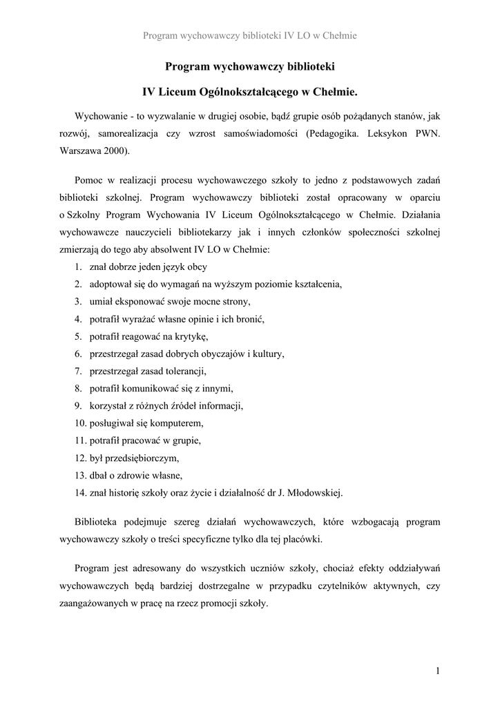 program wychowawczy biblioteki - Chełm