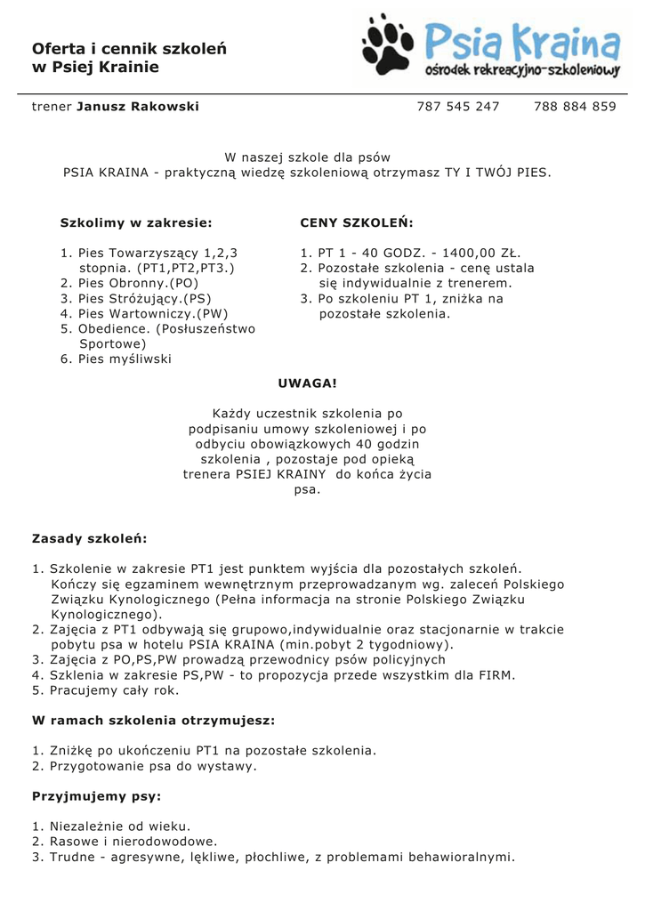 Oferta i cennik szkoleń w Psiej Krainie trener Janusz Rakowski 787 545 247 788 884 859 W naszej szkole dla psów PSIA KRAINA - praktyczną wiedzę szkoleniową otrzymasz TY I TWÓJ PIES. Szkolimy w zakresie: CENY SZKOLEŃ: 1. Pies Towarzyszący 1,2,3 stopnia. (PT1,PT2,PT3.) 2. Pies Obronny.(PO) 3. Pies Stróżujący.(PS) 4. Pies Wartowniczy.(PW) 5. Obedience. (Posłuszeństwo Sportowe) 6. Pies myśliwski 1. PT 1 - 40 GODZ. - 1400,00 ZŁ. 2. Pozostałe szkolenia - cenę ustala się indywidualnie z trenerem. 3. Po szkoleniu PT 1, zniżka na pozostałe szkolenia. UWAGA! Każdy uczestnik szkolenia po podpisaniu umowy szkoleniowej i po odbyciu obowiązkowych 40 godzin szkolenia , pozostaje pod opieką trenera PSIEJ KRAINY do końca życia psa. Zasady szkoleń: 1. Szkolenie w zakresie PT1 jest punktem wyjścia dla pozostałych szkoleń. Kończy się egzaminem wewnętrznym przeprowadzanym wg. zaleceń Polskiego Związku Kynologicznego (Pełna informacja na stronie Polskiego Związku Kynologicznego). 2. Zajęcia z PT1 odbywają się grupowo,indywidualnie oraz stacjonarnie w trakcie pobytu psa w hotelu PSIA KRAINA (min.pobyt 2 tygodniowy). 3. Zajęcia z PO,PS,PW prowadzą przewodnicy psów policyjnych 4. Szklenia w zakresie PS,PW - to propozycja przede wszystkim dla FIRM. 5. Pracujemy cały rok. W ramach szkolenia otrzymujesz: 1. Zniżkę po ukończeniu PT1 na pozostałe szkolenia. 2. Przygotowanie psa do wystawy. Przyjmujemy psy: 1. Niezależnie od wieku. 2. Rasowe i nierodowodowe. 3. Trudne - agresywne, lękliwe, płochliwe, z problemami behawioralnymi. SZKOLENIE - PIES TOWARZYSZĄCY PT1 - obejmuje następujące komendy: 1. chodzenie psa przy nodze na lużnej smyczy 2. chodzenie psa przy nodze bez smyczy 3. przychodzenie psa do nogi opiekuna 4. aportowanie 5. wykonywanie na odległość komendy - STÓJ, SIAD, WARUJ 6. pozostawanie psa w pozycji - SIAD, WARUJ 7. nie przyjmowanie podrzuconego pokarmu 8. pokazywanie uzębienia WAŻNE! szkolenie PT1 obejmuje 40 godzin SZKOLENIE - PIES TOWARZYSZĄCY PT 2 - obejmuje następujące komendy: 1. chodzenie psa przy nodze bez smyczy 2. przywołanie do mnie i do nogi 3. aportowanie wlasnego koziołka 4. skok przez przeszkodę 5. zmiana pozycji STÓJ / SIAD / WARUJ 6. STÓJ z marszu i powrót do psa 7. SIAD z marszu i powrót do psa 8. WARUJ z marszu i przywołanie psa 9. pozostawanie w pozycji SIAD 10. pozostawanie w pozycji WARUJ SZKOLENIE - PIES TOWARZYSZĄCY PT 3. 1. chodzenie przy nodze bez smyczy 2. przywołanie psa z zatrzymaniem WARUJ 3. aportowanie koziołka obcego 4. aportowanie koziołka obcego przez przeszkodę 5. rozpoznanie i przyniesienie własnego koziołka 6. zmiana pozycji STÓJ / SIAD / WARUJ 7. STÓJ / SIAD / WARUJ z marszu 8. wysyłanie naprzód z warowaniem 9. szczekanie na komendę 10. pozostawanie w pozycji SIAD na komendę ( 2 min.) 11. pozostawanie w pozycji WARUJ na komendę ( 4 min.) SZKOLENIE - PIES OBRONNY. W trakcie szkolenia należy zaszczepić psu bezwzględne posłuszeństwo,polegające na wykonywaniu rozkazu za pierwszym razem. Pies obronny to taki ,który na rozkaz lub bez rozkazu wystąpi w obronie swojego pana (przewodnika). Musi go cechować ; odpowiednia siła fizyczna wrodzona agresywność bojowość i odwaga odporność na odgłosy strzałów oraz inne bodżce akustyczne. Pies obronny może być także stróżującym, po odpowiednim wyszkoleniu. SZKOLENIE - PIES STRÓŻUJĄCY. Ważnym elementem szkolenia jest; nauka nieprzyjmowania pokarmu od osób obcych oraz znalezionych na podłożu. Musi go cechować ; bojowość,czujność,nieufność do obcych, nieustępliwość , nieprzekupność przywiązanie do własnego terytorium umiejętność rozpoznawania prawdziwego niebezpieczeństwa SZKOLENIE - PIES WARTOWNICZY. Psy wartownicze w trakcie szkoleń uczą się; - posłuszeństwa - pokonywania przeszkód ćwiczebnych - obrony przewodnika - pościgu za uciekającym - przeszukiwanie terenu - przeszukiwanie pomieszczeń - samodzielnej służby wartowniczej - nie przyjmowania pokarmów znalezionych i podanych przez obce osoby SZKOLENIE - PIES MYŚLIWSKI. W ramach szkolenia jest układanie: płochacza, posokowca, dzikarza, norowca oraz szkolenie psów gończych.