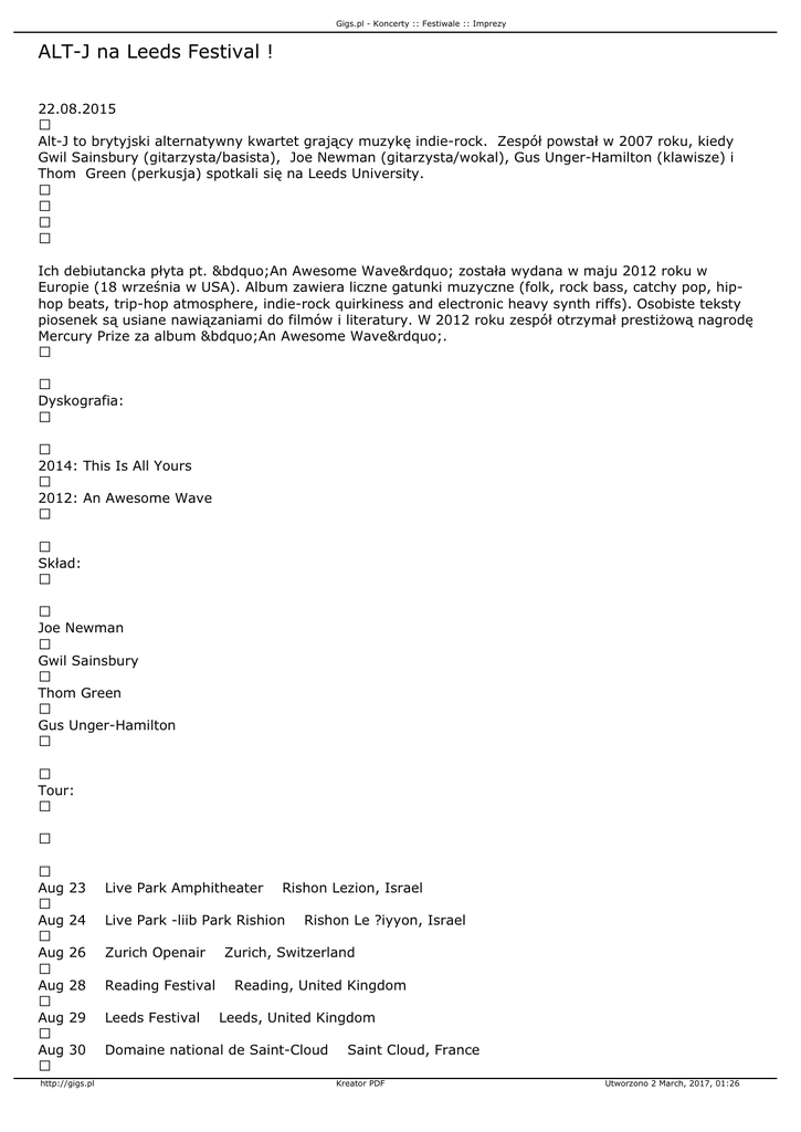 Gigs.pl - Koncerty :: Festiwale :: Imprezy ALT-J na Leeds Festival ! 22.08.2015 Alt-J to brytyjski alternatywny kwartet grający muzykę indie-rock. Zespół powstał w 2007 roku, kiedy Gwil Sainsbury (gitarzysta/basista), Joe Newman (gitarzysta/wokal), Gus Unger-Hamilton (klawisze) i Thom Green (perkusja) spotkali się na Leeds University. Ich debiutancka płyta pt. „An Awesome Wave” została wydana w maju 2012 roku w Europie (18 września w USA). Album zawiera liczne gatunki muzyczne (folk, rock bass, catchy pop, hiphop beats, trip-hop atmosphere, indie-rock quirkiness and electronic heavy synth riffs). Osobiste teksty piosenek są usiane nawiązaniami do filmów i literatury. W 2012 roku zespół otrzymał prestiżową nagrodę Mercury Prize za album „An Awesome Wave”. Dyskografia: 2014: This Is All Yours 2012: An Awesome Wave Skład: Joe Newman Gwil Sainsbury Thom Green Gus Unger-Hamilton Tour: Aug Aug Aug Aug Aug Aug 23 Live Park Amphitheater 24 Live Park -liib Park Rishion 26 Zurich Openair 28 Reading Festival 29 Leeds Festival 30 Domaine national de Saint-Cloud http://gigs.pl Rishon Lezion, Israel Rishon Le ?iyyon, Israel Zurich, Switzerland Reading, United Kingdom Leeds, United Kingdom Saint Cloud, France Kreator PDF Utworzono 2 March, 2017, 01:26 Gigs.pl - Koncerty :: Festiwale :: Imprezy Sep 12 Sep 14 Sep 15 Sep 17 Sep 18 Sep 19 Sep 21 Sep 22 Sep 23 Sep 25 Sep 26 Sep 29 Sep 30 Oct 01 Oct 02 Oct 05 Oct 07 Oct 08 Oct 09 Oct 13 Oct 14 Oct 15 Oct 17 Oct 18 Nov 19 Nov 20 Nov 21 Nov 23 Nov 27 Deer Lake Park Burnaby, Canada Shaw Conference Centre Stampede Corral Edmonton, Canada Calgary, Canada Roy Wilkins Auditorium at St. Paul RiverCentre Hollywood Casino Amphitheater St Paul, MN Maryland Heights, MO Farm Bureau Insurance Lawn @ White River State Park PNC PAVILION Cincinnati, OH Meadow Brook Music Festival Main Street Armory Festival Pier Rochester Hills, MI Rochester, NY Philadelphia, PA Landmark Music Festival 2015 Washington, DC Uptown Amphitheatre at NC Music Factory Hard Rock Live Orlando Miami, FL Austin City Limits (Oct 2-4) Austin, TX South Side Ballroom Charlotte, NC Orlando, FL Bayfront Park Amphitheatre Dallas, TX Bold Sphere Music at Champions Square Oak Mountain Amphitheatre New Orleans, LA Birmingham, AL BankPlus Amphitheater at Snowden Grove Open Air Theatre San Diego, CA Comerica Theatre Phoenix, AZ Hollywood Bowl Southaven, MS Los Angeles, CA Veterans Memorial Coliseum KeyArena Indianapolis, IN Portland, OR Seattle, WA Ziggo Dome Amsterdam, The Netherlands Mitsubishi Electric Halle Arena Berlin Düsseldorf, Germany Berlin, Germany Maimarkthalle Mannheim, Germany Espace Malley Lausanne, Switzerland http://gigs.pl Kreator PDF Utworzono 2 March, 2017, 01:26 Gigs.pl - Koncerty :: Festiwale :: Imprezy http://gigs.pl Kreator PDF Utworzono 2 March, 2017, 01:26