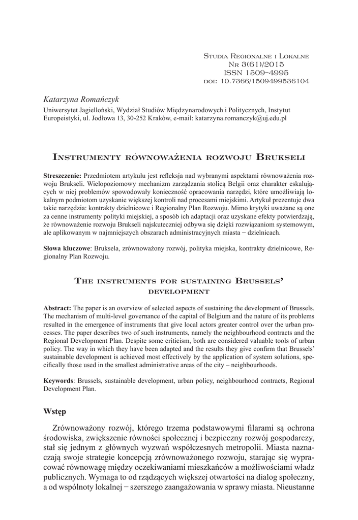 Studia Regionalne i Lokalne Nr 3(61)/2015 ISSN 1509–4995 doi: 10.7366/1509499536104 Katarzyna Romańczyk Uniwersytet Jagielloński, Wydział Studiów Międzynarodowych i Politycznych, Instytut Europeistyki, ul. Jodłowa 13, 30-252 Kraków, e-mail: [email protected] Instrumenty równoważenia rozwoju Brukseli Streszczenie: Przedmiotem artykułu jest refleksja nad wybranymi aspektami równoważenia rozwoju Brukseli. Wielopoziomowy mechanizm zarządzania stolicą Belgii oraz charakter eskalujących w niej problemów spowodowały konieczność opracowania narzędzi, które umożliwiają lokalnym podmiotom uzyskanie większej kontroli nad procesami miejskimi. Artykuł prezentuje dwa takie narzędzia: kontrakty dzielnicowe i Regionalny Plan Rozwoju. Mimo krytyki uważane są one za cenne instrumenty polityki miejskiej, a sposób ich adaptacji oraz uzyskane efekty potwierdzają, że równoważenie rozwoju Brukseli najskuteczniej odbywa się dzięki rozwiązaniom systemowym, ale aplikowanym w najmniejszych obszarach administracyjnych miasta − dzielnicach. Słowa kluczowe: Bruksela, zrównoważony rozwój, polityka miejska, kontrakty dzielnicowe, Regionalny Plan Rozwoju. The instruments for sustaining Brussels’ development Abstract: The paper is an overview of selected aspects of sustaining the development of Brussels. The mechanism of multi-level governance of the capital of Belgium and the nature of its problems resulted in the emergence of instruments that give local actors greater control over the urban processes. The paper describes two of such instruments, namely the neighbourhood contracts and the Regional Development Plan. Despite some criticism, both are considered valuable tools of urban policy. The way in which they have been adapted and the results they give confirm that Brussels’ sustainable development is achieved most effectively by the application of system solutions, specifically those used in the smallest administrative areas of the city – neighbourhoods. Keywords: Brussels, sustainable development, urban policy, neighbourhood contracts, Regional Development Plan. Wstęp Zrównoważony rozwój, którego trzema podstawowymi filarami są ochrona środowiska, zwiększenie równości społecznej i bezpieczny rozwój gospodarczy, stał się jednym z głównych wyzwań współczesnych metropolii. Miasta naznaczają swoje strategie koncepcją zrównoważonego rozwoju, starając się wypracować równowagę między oczekiwaniami mieszkańców a możliwościami władz publicznych. Wymaga to od rządzących większej otwartości na dialog społeczny, a od wspólnoty lokalnej − szerszego zaangażowania w sprawy miasta. Nieustanne 68 KATARZYNA ROMAŃCZYK podnoszenie aktywności mieszkańców poprzez włączanie ich w procesy decyzyjne rodzi pytanie o mechanizmy, które temu sprzyjają. W latach 60. XX w. amerykański politolog R. Dahl (1961) stwierdził, że zaangażowanie mieszkańców w sprawy miasta rośnie, kiedy ich własny interes zostanie zagrożony. Analizy prowadzone przez Dahla zostały poparte konkretnymi przykładami problemów występujących w New Haven. Wynika z nich, że większość decyzji politycznych zapadających odgórnie podejmowana była w atmosferze zobojętnienia i inercji społecznej. Te, które wywoływały największe zainteresowanie, dotyczyły najbliższego otoczenia mieszkańców. Z obserwacji Dahla płynie prosty wniosek, że uspołecznienie działań związanych z rozwojem metropolii najskuteczniej powinno zachodzić w najmniejszych jednostkach przestrzennych miasta, czyli w dzielnicach lub na osiedlach. Nawet biorąc pod uwagę przeszkody wynikające z miejscowych uwarunkowań i układów różnych grup interesów zabiegających o partykularne korzyści, lokalne inicjatywy społeczne, choć często efemeryczne, tworzone na potrzeby jednej sprawy, okazują się funkcjonalnym narzędziem wpływania na politykę miejską. Dzisiaj w wielu metropoliach oddolne rozwiązywanie problemów poprzez partycypację mieszkańców i tworzenie partnerstw publiczno-prywatnych o mniej instytucjonalnym charakterze stało się jednym z kryteriów zarządzania miejskiego, które ma prowadzić do zrównoważonego rozwoju. Polityka publiczna uwzględniająca zestaw zadań, w ramach których decyzje podejmują mieszkańcy, zakłada konsensualny model działania w mieście (Raco, Flint 2012). Takie zarządzanie (governance) jest procesem szerszym niż rządzenie w obrębie zwyczajowego systemu sprawowania władzy (governing), którego głównymi elementami są instytucje ustawodawcze, wykonawcze i sądownicze (Pierre 2011). Takie podejście do mechanizmu zarządzania miastem pozwala łączyć pojęcie zrównoważonego rozwoju z określeniem „różnorodny”. Miasto zabiegające o zrównoważony rozwój to miasto, które dąży do względnej równowagi poprzez dostarczenie mieszkańcom różnorodnych instrumentów do współdecydowania o sprawach ich najbliższego otoczenia, prognozuje i realizuje inwestycje w odniesieniu do różnorodnych obszarów przestrzennych, bez wyłącznej koncentracji na problemach centrum, a także uwzględnia różnorodne wymiary swego rozwoju, w tym szczególnie wymiar społeczny (mieszkalnictwo, edukacja, kultura, ochrona dziedzictwa, partycypacja społeczna, demografia), gospodarczy (polityka inwestycyjna, infrastruktura, transport, zatrudnienie, mobilność) i środowiskowy (rewitalizacja przestrzeni publicznych, niskoemisyjność). Zrównoważoną politykę miejską powinno charakteryzować zintegrowane podejście, które łączy wymienione wymiary rozwoju metropolitalnego przy wyraźnym zaangażowaniu społeczności lokalnej. A. Colantonio i T. Dixon (2011) za główne elementy zintegrowanego podejścia uznają: diagnozę słabych i mocnych stron miasta i jego poszczególnych dzielnic; wyznaczenie realnych celów do zrealizowania w konkretnych obszarach miasta; wzrost udziału społeczeństwa w projektach miejskich mierzony skalą koo