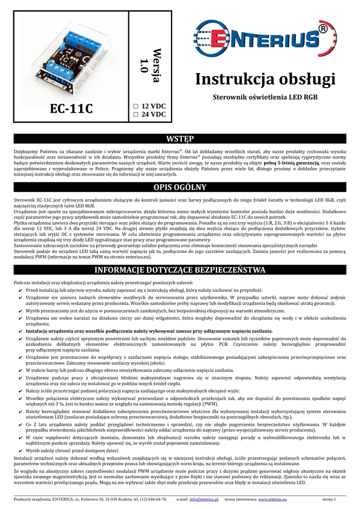 Wersja 1.0 Instrukcja obsługi Sterownik oświetlenia LED RGB EC-11C □ 12 VDC □ 24 VDC WSTĘP Dziękujemy Państwu za okazane zaufanie i wybór urządzenia marki Enterius ®. Od lat dokładamy wszelkich starań, aby nasze produkty cechowała wysoka funkcjonalność oraz niezawodność w ich działaniu. Wszystkie produkty firmy Enterius ® posiadają niezbędne certyfikaty oraz spełniają rygorystyczne normy będące potwierdzeniem doskonałych parametrów naszych urządzeń. Warto zwrócić uwagę, że nasze produkty są objęte pełną 5-letnią gwarancją, oraz zostały zaprojektowane i wyprodukowane w Polsce. Pragniemy aby nasze urządzenia służyły Państwu przez wiele lat, dlatego prosimy o dokładne przeczytanie niniejszej instrukcji obsługi oraz stosowanie się do informacji w niej zawartych. OPIS OGÓLNY Sterownik EC-11C jest cyfrowym urządzeniem służącym do kontroli jasności oraz barwy podłączonych do niego źródeł światła w technologii LED RGB, czyli najczęściej elastycznych taśm LED RGB. Urządzenie jest oparte na specjalizowanym mikroprocesorze, dzięki któremu mimo małych wymiarów kontroler posiada bardzo duże możliwości. Dodatkowo część parametrów jego pracy użytkownik może samodzielnie programować tak, aby dopasować działanie EC-11C do swoich potrzeb. Płytka urządzenia zawiera dwa przyciski sterujące oraz jeden służący do programowania. Ponadto są na niej trzy wyjścia (1:R, 2:G, 3:B) o obciążalności 5 A każde dla wersji 12 VDC, lub 3 A dla wersji 24 VDC. Na drugiej stronie płytki znajdują się dwa wejścia służące do podłączenia dodatkowych przycisków, styków sterujących lub wyjść OC z systemów sterowania. W celu ułatwienia programowania urządzenia oraz odczytywania zaprogramowanych wartości na płytce urządzenia znajdują się trzy diody LED sygnalizujące stan pracy oraz programowane parametry. Zastosowanie zakręcanych zacisków na przewody gwarantuje solidne połączenia oraz eliminuje konieczność stosowania specjalistycznych narzędzi. Sterownik podaje do urządzeń LED taką samą wartość napięcia jak to, podłączone do jego zacisków zasilających. Zmiana jasności jest realizowana za pomocą modulacji PWM (informacje na temat PWM na stronie enterius.eu). INFORMACJE DOTYCZĄCE BEZPIECZEŃSTWA Podczas instalacji oraz eksploatacji urządzenia należy przestrzegać poniższych zaleceń: ✔ Przed instalacją lub użyciem wyrobu należy zapoznać się z instrukcją obsługi, którą należy zachować na przyszłość. ✔ Urządzenie nie zawiera żadnych elementów możliwych do serwisowania przez użytkownika. W przypadku usterki, napraw może dokonać jedynie autoryzowany serwis wskazany przez producenta. Wszelkie samodzielne próby naprawy lub modyfikacji urządzenia będą skutkować utratą gwarancji. ✔ Wyrób przeznaczony jest do użycia w pomieszczeniach zamkniętych, bez bezpośredniej ekspozycji na warunki atmosferyczne. ✔ Urządzenia nie wolno narażać na działanie cieczy ani dużej wilgotności, która mogłaby doprowadzić do skraplania się wody i w efekcie uszkodzenia urządzenia. ✔ Instalację urządzenia oraz wszelkie podłączenia należy wykonywać zawsze przy odłączonym napięciu zasilania. ✔ Urządzenie należy czyścić sprężonym powietrzem lub suchym, miękkim pędzlem. Stosowanie szmatek lub ręczników papierowych może doprowadzić do uszkodzenia delikatnych elementów elektronicznych zamontowanych na płytce PCB. Czyszczenie należy bezwzględnie przeprowadzić przy odłączonym napięciu zasilania. ✔ Urządzenie jest przeznaczone do współpracy z zasilaczami napięcia stałego, stabilizowanego posiadającymi zabezpieczenia przeciwprzepięciowe oraz przeciwzwarciowe. Zalecamy stosowanie zasilaczy wysokiej jakości. ✔ W trakcie burzy lub podczas długiego okresu nieużytkowania zalecamy odłączenie napięcia zasilania. ✔ Urządzenie podczas pracy z obciążeniami bliskimi maksymalnym nagrzewa się w znacznym stopniu. Należy zapewnić odpowiednią wentylację urządzenia oraz nie zaleca się instalować go w pobliżu innych źródeł ciepła. ✔ Należy ściśle przestrzegać podanej polaryzacji napięcia zasilającego oraz maksymalnych obciążeń wyjść. ✔ Wszelkie połączenia elektryczne należy wykonywać przewodami o odpowiednich przekrojach tak, aby nie dopuścić do powstawania spadków napięć większych niż 3 %. Jest to bardzo ważne ze względu na zastosowaną metodę regulacji (PWM). ✔ Należy bezwzględnie stosować dodatkowe zabezpieczenia przeciwzwarciowe właściwe dla wykonywanej instalacji wykorzystującej system sterowania oświetleniem LED (zasilacze posiadające ochronę przeciwzwarciową, dodatkowe bezpieczniki na poszczególnych obwodach, itp.). ✔ Co 2 lata urządzenia należy poddać przeglądowi technicznemu i sprawdzić, czy nie uległo pogorszeniu bezpieczeństwo użytkowania. W każdym przypadku stwierdzenia jakichkolwiek nieprawidłowości należy oddać urządzenia do naprawy (przez wyspecjalizowany serwis producenta). ✔ W razie wątpliwości dotyczących montażu, demontażu lub eksploatacji wyrobu należy zasięgnąć porady u wykwalifikowanego elektronika lub w najbliższym punkcie sprzedaży. Należy upewnić się, że wyrób został poprawnie zainstalowany. ✔ Wyrób należy chronić przed dostępem dzieci. Instalacji urządzeń należy dokonać według wskazówek znajdujących się w niniejszej instrukcji obsługi, ściśle przestrzegając podanych schematów połączeń, parametrów technicznych oraz aktualnych przepisów prawa lub obowiązujących norm kraju, na terenie którego urządzenia są instalowane. Ze względu na akustyczny zakres częstotliwości modulacji PWM urządzenie może podczas pracy z dużymi prądami generować odgłosy akustyczne na skutek zjawiska zwanego magnetostrykcją. Jest to normalne zachowanie wynikające z praw fizyki i nie stanowi podstawy do reklamacji. Zjawisko to nasila