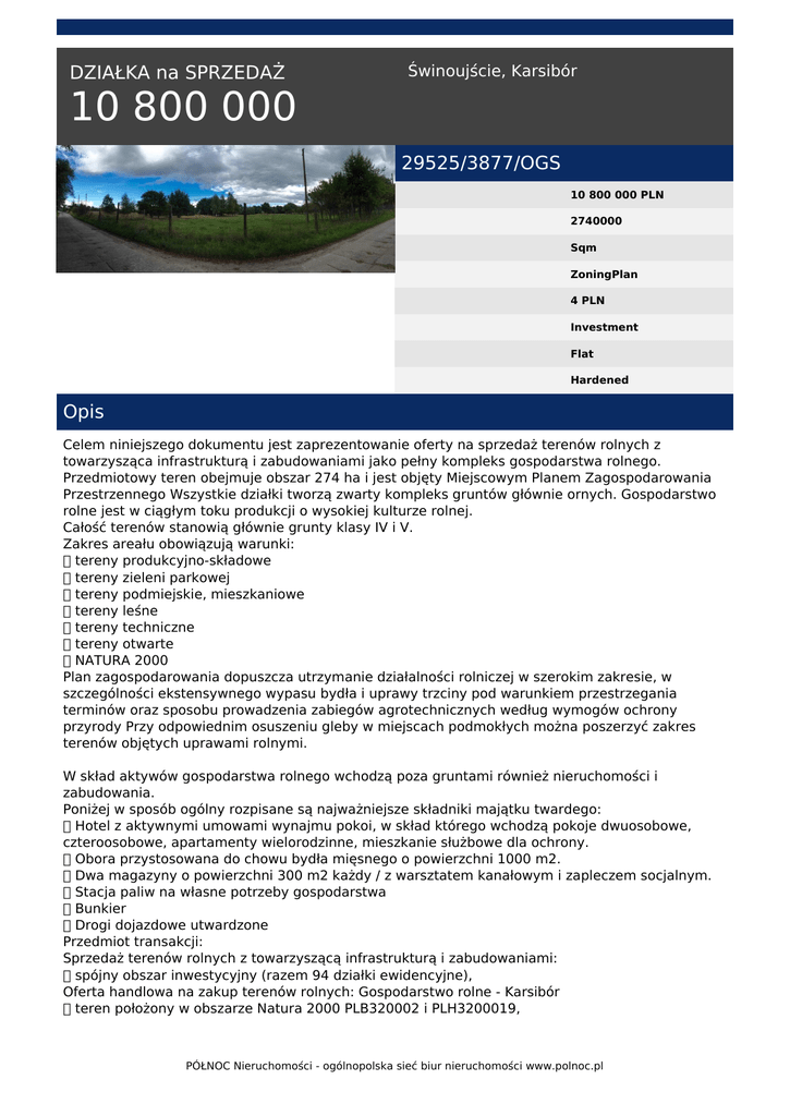 DZIAŁKA na SPRZEDAŻ Świnoujście, Karsibór 10 800 000 29525/3877/OGS 10 800 000 PLN 2740000 Sqm ZoningPlan 4 PLN Investment Flat Hardened Opis Celem niniejszego dokumentu jest zaprezentowanie oferty na sprzedaż terenów rolnych z towarzysząca infrastrukturą i zabudowaniami jako pełny kompleks gospodarstwa rolnego. Przedmiotowy teren obejmuje obszar 274 ha i jest objęty Miejscowym Planem Zagospodarowania Przestrzennego Wszystkie działki tworzą zwarty kompleks gruntów głównie ornych. Gospodarstwo rolne jest w ciągłym toku produkcji o wysokiej kulturze rolnej. Całość terenów stanowią głównie grunty klasy IV i V. Zakres areału obowiązują warunki:  tereny produkcyjno-składowe  tereny zieleni parkowej  tereny podmiejskie, mieszkaniowe  tereny leśne  tereny techniczne  tereny otwarte  NATURA 2000 Plan zagospodarowania dopuszcza utrzymanie działalności rolniczej w szerokim zakresie, w szczególności ekstensywnego wypasu bydła i uprawy trzciny pod warunkiem przestrzegania terminów oraz sposobu prowadzenia zabiegów agrotechnicznych według wymogów ochrony przyrody Przy odpowiednim osuszeniu gleby w miejscach podmokłych można poszerzyć zakres terenów objętych uprawami rolnymi. W skład aktywów gospodarstwa rolnego wchodzą poza gruntami również nieruchomości i zabudowania. Poniżej w sposób ogólny rozpisane są najważniejsze składniki majątku twardego:  Hotel z aktywnymi umowami wynajmu pokoi, w skład którego wchodzą pokoje dwuosobowe, czteroosobowe, apartamenty wielorodzinne, mieszkanie służbowe dla ochrony.  Obora przystosowana do chowu bydła mięsnego o powierzchni 1000 m2.  Dwa magazyny o powierzchni 300 m2 każdy / z warsztatem kanałowym i zapleczem socjalnym.  Stacja paliw na własne potrzeby gospodarstwa  Bunkier  Drogi dojazdowe utwardzone Przedmiot transakcji: Sprzedaż terenów rolnych z towarzyszącą infrastrukturą i zabudowaniami:  spójny obszar inwestycyjny (razem 94 działki ewidencyjne), Oferta handlowa na zakup terenów rolnych: Gospodarstwo rolne - Karsibór  teren położony w obszarze Natura 2000 PLB320002 i PLH3200019, PÓŁNOC Nieruchomości - ogólnopolska sieć biur nieruchomości www.polnoc.pl  Warunki zabudowy i zagospodarowania terenu:  zabudowa zagrodowa (zespół obiektów wolnostojących),  max. powierzchnia zabudowy do 500 m2 (w granicach siedliska),  max. wysokość zabudowy do 2 kondygnacji, nie więcej niż HZ = 10 m,  forma zabudowy na wzór zabudowy wiejskiej,  dachy wysokie o kącie nachylenia 40°÷50°, naczółkowe, symetryczne, • zakaz lokalizacji wszelkich tymczasowych obiektów handlowych i gastronomicznych. Więcej ofert znajdziesz na naszej stronie www.polnoc.pl * UWAGA! Zamieszczone na naszych stronach oferty nie stanowią oferty w rozumieniu Kodeksu Cywilnego, a dane w nich zawarte mają jedynie charakter informacyjny. Jarosław Neścior tel. 734-866-166 email: [email protected] PÓŁNOC Nieruchomości - ogólnopolska sieć biur nieruchomości www.polnoc.pl Powered by TCPDF (www.tcpdf.org)