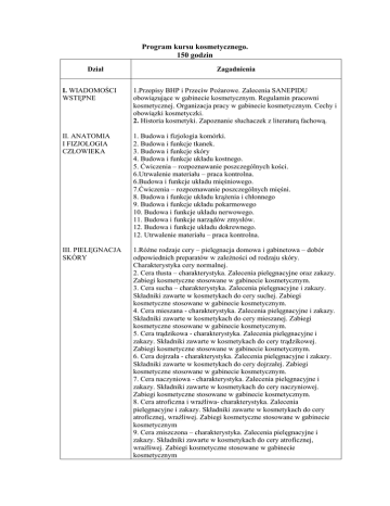 Program kursu kosmetycznego. 150 godzin Dział Zagadnienia I. WIADOMOŚCI WSTĘPNE 1.Przepisy BHP i Przeciw PoŜarowe. Zalecenia SANEPIDU obowiązujące w gabinecie kosmetycznym. Regulamin pracowni kosmetycznej. Organizacja pracy w gabinecie kosmetycznym. Cechy i obowiązki kosmetyczki. 2. Historia kosmetyki. Zapoznanie słuchaczek z literaturą fachową. II. ANATOMIA I FIZJOLOGIA CZŁOWIEKA 1. Budowa i fizjologia komórki. 2. Budowa i funkcje tkanek. 3. Budowa i funkcje skóry 4. Budowa i funkcje układu kostnego. 5. Ćwiczenia – rozpoznawanie poszczególnych kości. 6.Utrwalenie materiału – praca kontrolna. 6.Budowa i funkcje układu mięśniowego. 7.Ćwiczenia – rozpoznawanie poszczególnych mięśni. 8. Budowa i funkcje układu krąŜenia i chłonnego 9. Budowa i funkcje układu pokarmowego 10. Budowa i funkcje układu nerwowego. 11. Budowa i funkcje narządów zmysłów. 12. Budowa i funkcje układu dokrewnego. 12. Utrwalenie materiału – praca kontrolna. III. PIELĘGNACJA SKÓRY 1.RóŜne rodzaje cery – pielęgnacja domowa i gabinetowa – dobór odpowiednich preparatów w zaleŜności od rodzaju skóry. Charakterystyka cery normalnej. 2. Cera tłusta – charakterystyka. Zalecenia pielęgnacyjne oraz zakazy. Zabiegi kosmetyczne stosowane w gabinecie kosmetycznym. 3. Cera sucha – charakterystyka. Zalecenia pielęgnacyjne i zakazy. Składniki zawarte w kosmetykach do cery suchej. Zabiegi kosmetyczne stosowane w gabinecie kosmetycznym. 4. Cera mieszana - charakterystyka. Zalecenia pielęgnacyjne i zakazy. Składniki zawarte w kosmetykach do cery mieszanej. Zabiegi kosmetyczne stosowane w gabinecie kosmetycznym. 5. Cera trądzikowa - charakterystyka. Zalecenia pielęgnacyjne i zakazy. Składniki zawarte w kosmetykach do cery trądzikowej. Zabiegi kosmetyczne stosowane w gabinecie kosmetycznym. 6. Cera dojrzała - charakterystyka. Zalecenia pielęgnacyjne i zakazy. Składniki zawarte w kosmetykach do cery dojrzałej. Zabiegi kosmetyczne stosowane w gabinecie kosmetycznym. 7. Cera naczyniowa - charakterystyka. Zalecenia pielęgnacyjne i zakazy. Składniki zawarte w kosmetykach do cery naczyniowej. Zabiegi kosmetyczne stosowane w gabinecie kosmetycznym. 8. Cera atroficzna i wraŜliwa- charakterystyka. Zalecenia pielęgnacyjne i zakazy. Składniki zawarte w kosmetykach do cery atroficznej, wraŜliwej. Zabiegi kosmetyczne stosowane w gabinecie kosmetycznym 9. Cera zniszczona – charakterystyka. Zalecenia pielęgnacyjne i zakazy. Składniki zawarte w kosmetykach do cery atroficznej, wraŜliwej. Zabiegi kosmetyczne stosowane w gabinecie kosmetycznym 10. Schorzenia skóry najczęściej spotykane w gabinecie kosmetycznym. 11. Proces starzenia się skóry – czynniki przyspieszające i opóźniające starzenie się skóry, zabiegi i substancje opóźniające proces starzenia się skóry. 12. Mechaniczne i chemiczne czyszczenie skóry. 13. mechaniczne i chemiczne złuszczanie naskórka (powierzchowne i głębokie). 14. Ochrona skóry twarzy latem i zimą. IV. MASAś TWARZY, SZYI I DEKOLTU V. PIELĘGNACJA OCZU I ICH OPRAWY. 1.Definicja, historia i podział masaŜu. Przygotowanie stanowiska pracy oraz preparatów i środków do masaŜu. 2. Przygotowanie klienta do masaŜu. DemakijaŜ twarzy i oczu. Mięśnie twarzy, szyi i tułowia. 3. Ruchy w masaŜu i ich znaczenie. Technika wykonywania masaŜu twarzy, szyi i dekoltu – ruchy głaskania. Wskazania i przeciwwskazania do zabiegu. 4. Technika wykonywania masaŜu – ruchy rozcierania. Wpływ masaŜu na ustrój. 5.Technika wykonywania masaŜu – ruchy ugniatania, oklepywania, wibracja. 6. DrenaŜ limfatyczny- anatomia i fizjologia drenaŜu limfatycznego. Zasady stosowania drenaŜu, drenaŜ limfatyczny twarzy. 1.Przygotowanie stanowiska pracy. DemakijaŜ oczu. Przemywanie i płukanie oczu. 2. Środki do farbowania brwi i rzęs. Przeprowadzenie próby uczuleniowej. 3. Technika farbowania brwi i rzęs - wskazania i przeciwwskazania do zabiegu. 4. Metody korygowania kształtu brwi. Dobór kształtu brwi do kształtu twarzy. Przeprowadzenie regulacji. 5. Zasady dotyczące higieny wzroku. Gimnastyka oczy. Farbowanie brwi i rzęs, ćwiczenia. Regulacja brwi. 6. Środki do pielęgnacji brwi i rzęs. Dolegliwości i choroby oczu. VI. PIELĘGNACJA KOŃCZYNY GÓRNEJ 1.Budowa paznokcia. Defekty i choroby płytki paznokciowej. 2. .Manicure biologiczny i tradycyjny. Przygotowanie i wyposaŜenie stanowiska pracy. Dezynfekcja i sterylizacja narzędzi. 3. Manicure – technika wykonywania zabiegu, kolejność czynności. Wskazania i przeciwwskazania do zabiegu. 4. Manicure – ćwiczenia. RóŜne sposoby malowania paznokci. Manicure francuski – ćwiczenia. 5. Nail – Art. – róŜne techniki zdobnictwa paznokci (cyrkonie, kalkomania, Nail – Percing, Air – brush). VII. PREPARATY KOSMETYCZNE 1.Maski kosmetyczne – rodzaje i zastosowanie. 2.Wybrane składniki czynne w kosmetyce. VIII. KOSMETYKA UPIĘKSZAJĄCA 1.Rodzaje kosmetyków. Pędzle do makijaŜu i przybory potrzebne do profesjonalnego wykonania makijaŜu. 2. Przygotowanie twarzy do wykonania makijaŜu. 3. Rodzaje makijaŜu: dzienny, wieczorowy, fantazyjny, teatralny, telewizyjny, filmowy, fotograficzny, ślubny, kamuflaŜ, makijaŜ permanentny. 4. Technika wykonania makijaŜu dziennego. Przygotowanie klientki do zabiegu. 5.Technika wykonania makijaŜu wieczorowego. Przygotowanie klientki do zabiegu. 6.Technika wykonania makijaŜu fantazyjnego. Przygotowanie klientki do zabiegu. 7. Technika wykonania makijaŜu teatralnego i telewizyjnego. Przygotowanie klientki do zabiegu. 8. Technika wykonania makijaŜu ślubnego panny młodej. Przygotowanie klientki do zabiegu. 9. Technika wykonania kamuflaŜu. Przygotowanie klientki do zabiegu. 10. Dobór kolorów w zaleŜności od typu urody: wiosna, lato, jesień, zima – charakterystyka. 11. Dobór kolorów w zaleŜności od karnacji, koloru oczu ni włosów. MakijaŜ a kolory. Barwy ciepłe i zimne.