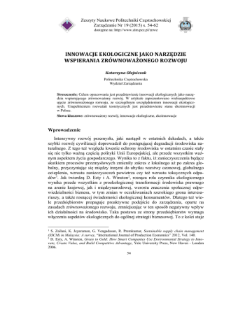 Zeszyty NaukoweKatarzyna Politechniki Częstochowskiej Olejniczak Zarządzanie Nr 19 (2015) s. 54-62 dostępne na: http://www.zim.pcz.pl/znwz INNOWACJE EKOLOGICZNE JAKO NARZĘDZIE WSPIERANIA ZRÓWNOWAŻONEGO ROZWOJU Katarzyna Olejniczak Politechnika Częstochowska Wydział Zarządzania Streszczenie: Celem opracowania jest przedstawienie innowacji ekologicznych jako narzędzia wspierającego zrównoważony rozwój. W artykule zaprezentowano wieloaspektowe ujęcie zrównoważonego rozwoju, ze szczególnym uwzględnieniem innowacji ekologicznych. Uzupełnieniem rozważań teoretycznych jest przedstawienie stanu ekoinnowacji w Polsce. Słowa kluczowe: zrównoważony rozwój, innowacje ekologiczne, ekoinnowacje Wprowadzenie Intensywny rozwój przemysłu, jaki nastąpił w ostatnich dekadach, a także szybki rozwój cywilizacji doprowadził do postępującej degradacji środowiska naturalnego. Z tego też względu kwestie ochrony środowiska w ostatnim czasie stały się nie tylko ważną częścią polityki Unii Europejskiej, ale przede wszystkim ważnym aspektem życia gospodarczego. Wynika to z faktu, iż zanieczyszczenia będące skutkiem procesów przemysłowych zmieniły zakres z lokalnego aż po zakres globalny, przyczyniając się między innymi do ubytku warstwy ozonowej, globalnego ocieplenia, wzrostu zanieczyszczeń powietrza czy też wzrostu toksycznych odpadów1. Jak twierdzą D. Esty i A. Winston2, rosnąca rola czynnika ekologicznego wynika przede wszystkim z proekologicznej transformacji środowiska prawnego na arenie krajowej, jak i międzynarodowej, wzrostu znaczenia społecznej odpowiedzialności biznesu, w tym zmian w oczekiwaniach szerokiego grona interesariuszy, a także rosnącej świadomości ekologicznej konsumentów. Dlatego też wiele przedsiębiorstw propaguje proaktywne podejście do zarządzania, oparte na zasadach zrównoważonego rozwoju, zmniejszając w ten sposób negatywny wpływ ich działalności na środowisko. Taka postawa ze strony przedsiębiorstw wymaga włączenia aspektów ekologicznych do ogólnej strategii biznesowej. To z kolei staje 1 S. Zailani, K. Jeyaraman, G. Vengadasan, R. Premkumar, Sustainable supply chain management (SSCM) in Malaysia: A survey, “International Journal of Production Economics” 2012, Vol. 140. 2 D. Esty, A. Winston, Green to Gold: How Smart Companies Use Environmental Strategy to Innovate, Create Value, and Build Competitive Advantage, Yale University Press, New Haven - London 2006. 54 Innowacje ekologiczne jako narzędzie wspierania zrównoważonego rozwoju się inspiracją do powstania tzw. ekoinnowacji, określanych również jako zielone innowacje czy innowacje ekologiczne. Niniejsze opracowanie skupia się na analizie innowacji ekologicznych jako skutecznego narzędzia wpierania zrównoważonego rozwoju. Biorąc powyższe pod uwagę, jako cel artykułu wyznaczono prezentację podstawowych założeń dotyczących innowacji ekologicznych, ze szczególnym uwzględnieniem uwarunkowań ich rozwoju, poziomu ekoinnowacji polskich przedsiębiorstw. Zrównoważony rozwój podstawą innowacji ekologicznych Wzrost Rozwój światowej gospodarki, rosnąca ingerencja w środowisko naturalne, kurczące się zasoby naturalne, a także negatywne skutki gospodarowania człowieka w środowisku naturalnym przyczyniły się do powstania negatywnych konsekwencji dla życia i zdrowia człowieka. W obliczu takich zmian narodziła się koncepcja zrównoważonego rozwoju, stanowiąca jeden ze współczesnych paradygmatów rozwoju gospodarczego. Zrównoważony rozwój, określany również mianem ekorozwój, rozwój: ciągły trwały, zintegrowany, czy też wzrost zrównoważony, permanentny, określa model rozwoju gospodarczego, łącząc go z wymogami ochrony środowiska, zaspokajając nie tylko konsumpcyjne potrzeby ludzi, ale i ich prawo do życia w czystym środowisku3. To proces, w którym następuje zaspokojenie potrzeb obecnego pokolenia z zachowaniem możliwości do zaspokojenia tych samych potrzeb przez przyszłe pokolenia 4. W tym miejscu należy podkreślić, iż zrównoważony rozwój uznaje współzależność trzech jego głównych wymiarów (społecznego, ekologicznego, ekonomicznego), co określono w Znowelizowanej Strategii Zrównoważonego Rozwoju UE5. Co więcej, przedsiębiorstwa zaczęły dostrzegać, iż zachowanie równowagi w długoterminowej perspektywie przyczynia się do maksymalizacji zysku. Jak podaje H. Kruk6, kształtuje się w ten sposób relacja między ładem ekologicznym a ładem społecznym i ekonomicznym. Przy czym ład społeczny odnosi się do potrzeby sprawiedliwości wewnątrz- i międzygeneracyjnej, ład ekologiczny wymaga ochrony dostępnych zasobów naturalnych, a ład ekonomiczny wyraża się w zaspokojeniu podstawowych potrzeb ludzkości. W ten sposób, zdaniem H. Kruk, w powstającej relacji środowisko przyrodnicze: M. Woźniak, Zrównoważony rozwój jako strategia definiująca nowoczesne gospodarowanie przestrzenią w Polsce (aspekty prawne), „Ekonomia i Prawo” 2011, t. 7, nr 1: Procesy integracyjne i dezintegracyjne we współczesnej gospodarce, s. 131-132. 4 L. Gawor, Idea zrównoważonego rozwoju jako projekt nowej ogólnoludzkiej cywilizacji, „Diametros” 2006, nr 9, s. 88. 5 Review of the EU Sustainable Development Strategy – Renewed Strategy, Council of the European Union 10117/06, Brussels, 9 June 2006, s. 3-4. 6 H. Kruk, Ład ekologiczny, społeczny i ekonomiczny we współczesnej teorii rozwoju zrównoważonego, [w:] Od koncepcji ekorozwoju do ekonomii zrównoważonego rozwoju, red. D. Kiełczewski, Wydawnictwo Wyższej Szkoły Ekonomicznej, Białystok 2009, s. 125-127. 3 55 Katarzyna Olejniczak Wpływa na zaspokojenie potrzeb człowieka (zarówno w bezpośredni lub/i po- średni sposób). Determinuje jakość życia człowieka. Stanowi komponent społeczno-kulturowy, bowiem jest czynnikiem uwzględ- nianym w różnych koncepcjach życia i systemach wyznawanych wartości. W