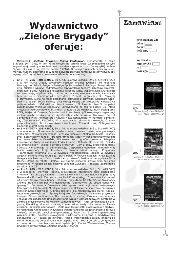 Wydawnictwo „Zielone Brygady” oferuje: Miesięcznik „Zielone Brygady. Pismo Ekologów”, prenumerata w cenie 5 zł/egz. (VAT 0%), w tym koszt wysyłki na terenie kraju (w przypadku wysyłki zagranicznej prosimy o kontakt celem ustalenia sposobu i kosztów wysyłki). W bieżącym roku ukaże się jeszcze numer 2 (216). O dalszych planach będziemy informować. Numery podwójne są w cenie dotychczasowych numerów pojedynczych, aby wynagrodzić czytelnikom powstałe opóźnienia. W sprzedaży: • • • nr 3 – 4 (205 – 206)/2005, 80 s. A4, kolorowa okładka, 246 g, 5 zł (0% VAT) a w nim m.in.: Drodzy czytelnicy; Festiwal lokalnej żywności; Po Robercie; Wracając do historii; Program Rozwoju Społeczeństwa Lokalnego; Szwajcaria ma dwie oficjalne waluty; Podmiotowość obywatelska; Siedem grzechów śmiertelnych kapitalizmu; Gdzie dziś jesteśmy; Wspólne wizje, wspólne życie (Auroville); Wspólne wizje, wspólne życie, czyli cudze chwalicie, swego nie znacie; List otwarty w sprawie wycinania przydrożnych drzew; Protest – regulacja rzek!; Pamiętaj o przyrodzie. Akcja na rzecz pojednania człowieka z przyrodą. Kalendarz wrzesień – grudzień 2005; Politycy chcą więcej dzieci; Jak skutecznie wpływać na politykę władz...; Człowiek w ciszy i słowach; Ekofilozofia. Powrót do pytań zasadniczych; World as sanctuary; Sprawozdanie ze zbiórki dotacji 1%; Masa krytyczna; Jądrowy potencjał Izraela; Gratulacje dla działaczy; Ruch ekologiczny REFA; Wujaszek Drakula; O konieczności powołania ogólnokrajowych organizacji ekologicznych; Sztuka jedności; Agroturystyka alternatywna?; Warszawa. Portret z przyrodą w tle; Architektura i natura; Nowa konstytucja; W harmonii z przyrodą; „Zielona Arka”; Placówka; W przygotowaniu: ekonomia i ekologia; O energetyce inaczej – dla użytkowników i sceptyków; Człowiek i las; Zintegrowane planowanie stref ochronnych. nr 5 – 6 (207 – 208)/2005, 80 s. A4, kolorowa okładka, 246 g, 5 zł (0% VAT) a w nim m.in.: Nowe relacje miasto – wieś; Lokalne rozwiązania globalnych problemów; Wykorzystać szansę – czas dla rolników; Lokalna produkcja – lokalny zysk; Sprawiedliwy handel – gra fair; Afrykański Pazur; Wiosna ludów latynoskich; Rzeź niewiniątek w Kanadzie; Obcinanie psom ogonów i uszu – nielegalne i nieetyczne; Tradycja zabijania; Etyka i nauka; Wolność dla zwierząt; Polityka dla śmiertelników; Ekolog o dworku kresowym; Dom z gliny, prasowanej słomy i żerdzi; Nie czekając na administrację; Gospodarka odpadami komunalnymi; Jaśnie oświecony kraj; Jesteśmy pszczołami Niewidzialnego; Przyrodnik – romantyk; Witamina B12 w żywieniu wegetariańskim; Żelazo w żywieniu wegetariańskim; Moje drugie ja; Stary Polak w nowych czasach; Krew języka; Uwaga – mechanizm, który pozwala nam przetrwać; Analiza reklamy piwa – Tatra Mocne; Dajcie mi robotę; Ekologu, nie bój się stosować prawa; Stan polskiego środowiska w rękach dzieci; Festiwal Lokalnej Żywności – relacja; Zaproszenie do reklamy w ZB. nr 7 – 8 (209 – 210)/2005, 80 s. A4, kolorowa okładka, 246 g, 5 zł (0% VAT) a w nim m.in.: Pierwsze, jedyne, nieustające: Internetowe Targi Ekologiczne – Krakow.Targi.Eco.pl; Drzewa?!; Dawni Słowianie i ich poszanowanie przyrody; Banany dla Brukseli. Ciemne strony Unii Europejskiej; „O zawisłości ekonomii od etyki”; Sprawiedliwy handel: banany; Projektanci transformacja; Skośnoocy Zieloni; Zieloni i ich polityka gospodarcza: alternatywa dla obozu konserwatywnego?; Demokracja finansowa jako sposób realizacji zasad ustrojowych Rzeczypospolitej Polskiej; Mitologia bogactwa; Holistyczne spojrzenie na rozwój i funkcjonowanie człowieka; O braku tolerancji dla morderców zza biurek; Nie zawsze kolej „ekologiczna”!; Sprawy kolejowe; Geo-ekologia; Kalendarz przyrody – listopad; Zimowi padlinożercy; Duch na wieży kościelnej; Ekopark – wypoczynek i nauka; Dar chodzenia; Unieszkodliwianie wraków samochodowych; Strategia w zakresie unieszkodliwiania wraków samochodowych. Alizy porównawcze i prognozy; Recykling odpadów w naszej szkole; Wino należy robić samemu; Ziemia utracona; Refleksje pourlopowe – 2005 rok; Ciekawostki o odżywianiu z medycyny rodzinnej; Aminokwasy w żywieniu wegetariańskim; Wegetarianizm a zdrowie i rozwój potencjału psychoenergetycznego.; Raport nt. Inżynierii genetycznej wrzesień 2005. Problemy ekologiczne i zdrowotne związane z modyfikowaną genetycznie (GM) paszą dla zwierząt; Apel o wprowadzenie zakazu importu do Polski genetycznie zmodyfikowanego rzepaku gt73; Errata do tekstu „Przyrodnik – romantyk o zrozumieniu alchemii sędziwoja”; 1% na Wydawnictwo „Zielone Brygady”; Wydawnictwo „Zielone Brygady” oferuje. egz. „Zielone Brygady. Pismo Ekologów” nr 3 – 4 (205 – 206)/2005, 5 zł egz. „Zielone Brygady. Pismo Ekologów” nr 5 – 6 (207 – 208)/2005, 5 zł egz. „Zielone Brygady. Pismo Ekologów” nr 7 – 8 (209 – 210)/2005, 5 zł • egz. „Zielone Brygady. Pismo Ekologów” nr 9 – 10 (211 – 212)/2005, 5 zł • egz. „Zielone Brygady. Pismo Ekologów” nr 11 – 12 (213 – 214)/2005, 5 zł Czas Ziemi, 0 zł 1 egz. egz. Wielki słownik nauki i sztuki, 7 zł egz. „Antyglobalizm” / O globalizacji na spokojnie, 5 zł nr 9 – 10 (211 – 212)/2005, 80 s. A4, kolorowa okładka, 246 g, 5 zł (0% VAT) a w nim m.in.: List otwarty dotyczący przyznania Greenpeace nagrody Wojewódzkiego Funduszu Ochrony Środowiska i Gospodarki Wodnej w Szczecinie; Europa Wschodnia odrzuca GMO; Greenpeace ujawnia nowy raport pokazujący nieefektywność europejskich mechanizmów bezpieczeństwa w sprawie GMO; Greenpeace zatrzymuje statek z GMO na wodach Zatoki Gdańskiej; Świnie dostarczają największemu producentowi mięsa w Polsce paszę wolną od GMO; Życie w niebezpiecznych wodach; W obronie oceanów; Wigilijny karp przyprawiony chemikaliami; Spotkanie ENOAS (European Network for Organic Agriculture St