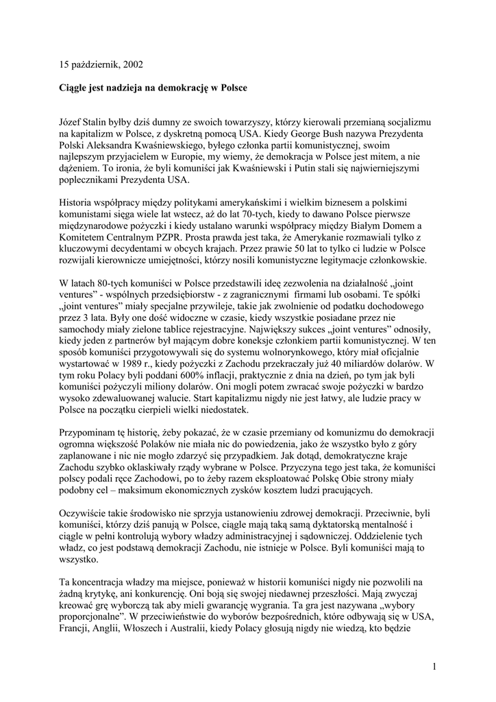 15 pażdziernik, 2002 Ciągle jest nadzieja na demokrację w Polsce Józef Stalin byłby dziś dumny ze swoich towarzyszy, którzy kierowali przemianą socjalizmu na kapitalizm w Polsce, z dyskretną pomocą USA. Kiedy George Bush nazywa Prezydenta Polski Aleksandra Kwaśniewskiego, byłego członka partii komunistycznej, swoim najlepszym przyjacielem w Europie, my wiemy, że demokracja w Polsce jest mitem, a nie dążeniem. To ironia, że byli komuniści jak Kwaśniewski i Putin stali się najwierniejszymi poplecznikami Prezydenta USA. Historia współpracy między politykami amerykańskimi i wielkim biznesem a polskimi komunistami sięga wiele lat wstecz, aż do lat 70-tych, kiedy to dawano Polsce pierwsze międzynarodowe pożyczki i kiedy ustalano warunki współpracy między Białym Domem a Komitetem Centralnym PZPR. Prosta prawda jest taka, że Amerykanie rozmawiali tylko z kluczowymi decydentami w obcych krajach. Przez prawie 50 lat to tylko ci ludzie w Polsce rozwijali kierownicze umiejętności, którzy nosili komunistyczne legitymacje członkowskie. W latach 80-tych komuniści w Polsce przedstawili ideę zezwolenia na działalność „joint ventures” - wspólnych przedsiębiorstw - z zagranicznymi firmami lub osobami. Te spółki „joint ventures” miały specjalne przywileje, takie jak zwolnienie od podatku dochodowego przez 3 lata. Były one dość widoczne w czasie, kiedy wszystkie posiadane przez nie samochody miały zielone tablice rejestracyjne. Największy sukces „joint ventures” odnosiły, kiedy jeden z partnerów był mającym dobre koneksje członkiem partii komunistycznej. W ten sposób komuniści przygotowywali się do systemu wolnorynkowego, który miał oficjalnie wystartować w 1989 r., kiedy pożyczki z Zachodu przekraczały już 40 miliardów dolarów. W tym roku Polacy byli poddani 600% inflacji, praktycznie z dnia na dzień, po tym jak byli komuniści pożyczyli miliony dolarów. Oni mogli potem zwracać swoje pożyczki w bardzo wysoko zdewaluowanej walucie. Start kapitalizmu nigdy nie jest łatwy, ale ludzie pracy w Polsce na początku cierpieli wielki niedostatek. Przypominam tę historię, żeby pokazać, że w czasie przemiany od komunizmu do demokracji ogromna większość Polaków nie miała nic do powiedzenia, jako że wszystko było z góry zaplanowane i nic nie mogło zdarzyć się przypadkiem. Jak dotąd, demokratyczne kraje Zachodu szybko oklaskiwały rządy wybrane w Polsce. Przyczyna tego jest taka, że komuniści polscy podali ręce Zachodowi, po to żeby razem eksploatować Polskę Obie strony miały podobny cel – maksimum ekonomicznych zysków kosztem ludzi pracujących. Oczywiście takie środowisko nie sprzyja ustanowieniu zdrowej demokracji. Przeciwnie, byli komuniści, którzy dziś panują w Polsce, ciągle mają taką samą dyktatorską mentalność i ciągle w pełni kontrolują wybory władzy administracyjnej i sądowniczej. Oddzielenie tych władz, co jest podstawą demokracji Zachodu, nie istnieje w Polsce. Byli komuniści mają to wszystko. Ta koncentracja władzy ma miejsce, ponieważ w historii komuniści nigdy nie pozwolili na żadną krytykę, ani konkurencję. Oni boją się swojej niedawnej przeszłości. Mają zwyczaj kreować grę wyborczą tak aby mieli gwarancję wygrania. Ta gra jest nazywana „wybory proporcjonalne”. W przeciwieństwie do wyborów bezpośrednich, które odbywają się w USA, Francji, Anglii, Włoszech i Australii, kiedy Polacy głosują nigdy nie wiedzą, kto będzie 1 wybrany, z wyjątkiem wiecznych postaci byłych komunistów. Dzieje się tak dlatego, że w wyborach proporcjonalnych przechodzą osoby umieszczone na pierwszych miejscach list wyborczych, przygotowanych przez partie polityczne. Byli komuniści finansują tylko partie już znajdujące się w polskim parlamencie. Nic dziwnego, że ostatnio byli komuniści ulepszyli prawo wyborcze tak, aby pozwalało refinansować koszty wyborów ze skarbu państwa. Dzięki temu w przyszłości wybory nie będą ich prawie nic kosztować. Teraz każda nowa partia, która chce z nimi rywalizować, musi zbierać pieniądze od ludzi, co nie jest zadaniem łatwym w postkomunistycznym społeczeństwie. Pomylili się ci, którzy myśleli, że Ameryka będzie działać jako obrońca demokracji w Polsce (albo gdziekolwiek indziej). Ameryka zawsze lubiła popierać dyktatorów, jak Pinochet w Chile, szach Pahlavi w Iranie albo Marcos na Filipinach. Okazuje się, że więcej można zyskać z niezawodnym, służalczym dyktatorem, niż z niepewnym nowo wybranym nieznajomym człowiekiem, który mógłby zdecydować się być patriotą własnego kraju, a nie działać w interesie obcego mocarstwa. Jedyną szansą dla Polaków, żeby znieść dyktaturę w Polsce, jest zmiana prawa wyborczego z wyborów proporcjonalnych na bezpośrednie, tak żeby ludzie mogli swobodnie wybierać i odwoływać swoich przedstawicieli. To jedyny sposób, żeby wybrać uczciwych patriotów i mieć pewność, że oni będą odpowiedzialni za swoje działania. W rzeczywistości wybory proporcjonalne wprowadzono w państwach, które przegrały II Wojnę Światową – w Niemczech, Japonii i we Włoszech – aby uczynić je słabymi i łatwymi do manipulowania z zagranicy. Szczególnie we Włoszech było wiele upadków rządów przed wprowadzoną niedawno zmianą systemu wyborczego na wybory w pojedynczych okręgach. Niemcy, którzy mieli do czynienia ze skandalami korupcyjnymi w rządzie, próbują teraz uwolnić się od systemu wyborów proporcjonalnych. Dla ogromnej większości Polaków, tych którzy nigdy nie byli członkami partii komunistycznej, obecna sytuacja jest bardzo smutna i mają poczucie zdrady. Oni naiwnie wierzyli, że kiedy Polska z pomocą Zachodu stanie się demokratycznym krajem, skorzystają z tych samych zasad, które uczyniły kraje Zachodu silnymi, pozwoliły im wzrastać i prosperować. Rozczarowanie jest głównym powodem niskiej frekwencji we wszystkich pr