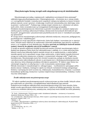 Muzykoterapia formą terapii osób niepełnosprawnych intelektualnie Muzykoterapia jest jedną z najstarszych i najbardziej rozwiniętych form arteterapii1 oddziaływującą psychoterapeutycznie i fizjoterapeutycznie. „Zwrócenie się w stronę sztuki, a w szczególności kontakt z muzyką moŜe zaspokoić rodzącą się tęsknotę za innym światem pełnym marzeń, uczuć i przeŜyć, zwiększając wraŜliwość emocjonalną oraz ułatwiając zmianę postaw i zachowania”2. Funkcja tego rodzaju terapii zmienia się w zaleŜności od załoŜonych celów, które uwarunkowane są wymaganiami konkretnego przypadku. Działania muzykoterapeutyczne skierowane są przede wszystkim na: usunięcie napięć psychofizycznych, korekcję zaburzonych funkcji, dostarczenie korzystnych doświadczeń społecznych3, przygotowanie i przystosowanie psychofizyczne do Ŝycia w warunkach uszczuplonej sprawności4. W swojej istocie muzykoterapia wykorzystuje załoŜenia medyczne, muzyczne, pedagogiczne, psychologiczne i rehabilitacyjne5. Ze względu na swoje specyficzne właściwości, które były badane i rozwaŜane juŜ w staroŜytności, muzyka moŜe wpływać na zachowanie człowieka pobudzając jego procesy wyobraŜeniowe, a ze względu na swój abstrakcyjny charakter pozwala na uniknięcie kontroli intelektualnej i dotarcie do głęboko ukrytych konfliktów i emocji. Z uwagi na sposób organizacji działań leczniczych moŜna wyróŜnić muzykoterapię indywidualną oraz grupową, która moŜe być ukierunkowana („zakłada, Ŝe w czasie aktywnej działalności muzycznej jednostka będzie musiała ścierać się ze społecznością, a zatem będzie musiała uporać się ze sposobami swego złego zachowania, a takŜe będzie musiała kierować uwagę na wydarzenia somatyczne związane z czynnościami własnego ciała”6) bądź nieukierunkowana. Muzykoterapia moŜe być równieŜ receptywna, polega na słuchaniu muzyki i przekazywaniu indywidualnych odczuć co powiązane jest z dyskusją psychoterapeutyczną oraz aktywna, która obejmuje produkcje dźwiękowe pacjentów. W trakcie zajęć formy muzykoterapii mogą być ze sobą łączone w celu wzmocnienia zamierzonego efektu. Metody stosowane w muzykoterapii to: odreagowująco – wyobraŜeniowe sprzyjające pobudzeniu emocji i katharsis, treningowe oparte na róŜnych wariantach treningu autogennego Schulza i nawiązują do teorii uczenia się, relaksacyjne, komunikatywne związane z uczeniem komunikacji społecznej, kreatywne w postaci improwizacji instrumentalnej, wokalnej i ruchowej oraz estetyzujące7. Środki oddziaływania muzykoterapeutycznego W trakcie spotkań muzykoterapeutycznych wykorzystywane są róŜne środki, których celem jest wpływanie na człowieka z uwzględnieniem indywidualnych jego potrzeb. Podstawowym środkiem oddziaływania muzykoterapeutycznego jest sama muzyka, która dzięki swoim specyficznym właściwościom moŜe i wpływa na ludzką egzystencję. Jej wielowarstwowa struktura (akustyczna, semantyczna, estetyczna) moŜe działać na róŜne parametry 1 W. Szulc : Kulturoterapia. Wykorzystanie sztuki i działalności kulturalno – oświatowej w lecznictwie, Akademia Medyczna, Poznań 1994, s. 56. 2 K. Lewandowska : Muzykoterapia dziecięca. Zbiór rozpraw z psychologii muzycznej dziecka i muzykoterapii dziecięcej, Gdańsk 1996, s. 41. 3 Ibidem., s. 49. 4 P. Cylulko : Muzykoterapia w rehabilitacji ruchowej dzieci niewidomych i słabowidzących, Wydział Nauk Medycznych PAN, Warszawa 1998, s. 11. 5 Ibidem., s. 11. 6 K. Lewandowska : op. cit., s. 41. 7 Ibidem., s. 50 – 51. ludzkiej aktywności. Sama struktura muzyki przypomina przebiegi napięć i odpręŜeń podobnie jak w podstawowych procesach Ŝyciowych8. W zaleŜności od pacjenta i jego potrzeb zmienia się funkcja muzyki oraz związane z nią techniki i formy. Brak konkretności przekazu muzycznego często ułatwia kontakt z pacjentem, niweluje pewną pojawiająca się blokadę istniejącą między pacjentem a terapeutą. Muzyka „potrafi” przełamać opór pojawiający się u pacjenta a związany z przekazywaniem myśli. Muzyka towarzyszy człowiekowi praktycznie juŜ od chwili poczęcia aŜ do ostatnich chwil jego Ŝycia. Słuch bowiem jest pierwszym obok dotyku zmysłem, dzięki któremu dziecko komunikuje się ze światem. To właśnie dzięki temu zmysłowi człowiek moŜe rozwijać swoją mowę. Często ta sama muzyka potrafi oddać ciepło i miłość macierzyńską bądź potrafi działać kojąco na ból, czego dowodem moŜe być wykorzystywanie muzyki w rytuałach leczniczych szamanów bądź czarowników. Rola samej muzyki na przestrzeni wieków wielokrotnie się zmieniała jednak zawsze miała wpływ na człowieka, niejednokrotnie podtrzymując ducha narodu. Muzyczne przykłady mogą kojarzyć się pacjentowi z przeŜyciami niekiedy zapomnianymi, a które mogą być w procesie terapii ujawnione. Najczęściej stosowane są w muzykoterapii techniki wyobraŜeniowe, do których zaliczyć moŜemy technike kierowanej wyobraźni (np.: pisanie scenariusza do muzyki) bądź techniki skojarzeniowo – konstrukcyjne. Funkcja wykorzystanej techniki zmienia się w zaleŜności od wymagań konkretnego przypadku. W celu wzmocnienia pewnych określonych przeŜyć muzykoterapia włącza do wykorzystywanej muzyki elementy pantomimy, dramy i psychorysunku. Muzykoterapia jako forma psychoterapii chcąc wpłynąć na pacjenta musi kierować się róŜnymi formami aktywności pacjenta tym samym musi wykorzystywać róŜnorodne środki oddziaływania. KaŜdą z wymienionych kategorii naleŜy dostosować do wymagań konkretnego przypadku i przyjętego celu gdyŜ na pierwszym miejscu stoi zawsze człowiek. Muzykoterapia osób niepełnosprawnych intelektualnie Niepełnosprawność intelektualna wiąŜe się z trwałymi zmianami w ośrodkowym układzie nerwowym i zaburzeniami w jego funkcjonowaniu. Globalny charakter defektu sprawia, Ŝe upośledzona jest sfera intelek