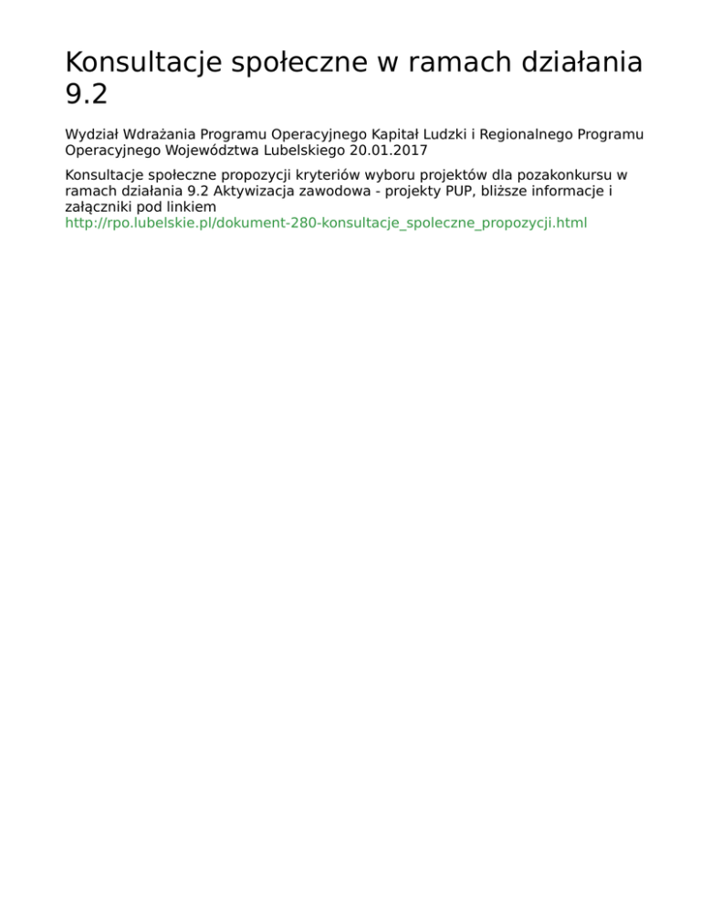 Konsultacje społeczne w ramach działania 9.2 Wydział Wdrażania Programu Operacyjnego Kapitał Ludzki i Regionalnego Programu Operacyjnego Województwa Lubelskiego 20.01.2017 Konsultacje społeczne propozycji kryteriów wyboru projektów dla pozakonkursu w ramach działania 9.2 Aktywizacja zawodowa - projekty PUP, bliższe informacje i załączniki pod linkiem http://rpo.lubelskie.pl/dokument-280-konsultacje_spoleczne_propozycji.html