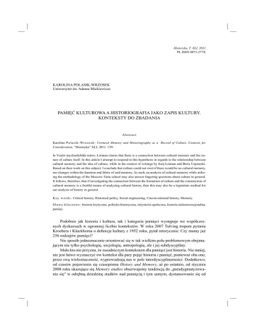 Historyka, T. XLI, 2011 PL ISSN 0073-277X KAROLINA POLASIK-WRZOSEK Uniwersytet im. Adama Mickiewicza PAMIĘĆ KULTUROWA A HISTORIOGRAFIA JAKO ZAPIS KULTURY. KONTEKSTY DO ZBADANIA A b st r act Karolina Po l a s i k - Wr z o s e k : Curtural Memory and Historiography as a Record of Culture. Contexts for Consideration, “Historyka” XLI, 2011: 139– In Vnutri mysliashchikh mirov, Łotman claims that there is a connection between cultural memory and the nature of culture itself. In this article I attempt to respond to this hypothesis in regards to the relationship between cultural memory and the idea of culture, while in the context of writings by Jurij Łotman and Boris Uspienski. Based on their work on this subject, I conclude that culture could not exist if there would be no cultural memory, nor changes within the duration and fabric of said memory. As such, an analysis of cultural memory while utilizing the methadology of the Moscow-Tartu school may also answer lingering questions about culture in general. It follows, therefore, that if investigating the connection between the formation of culture and the construction of cultural memory is a fruitful means of analyzing cultural history, then this may also be a legimitate method for our analysis of history in general. Ke y wo r d s : Critical history, Historical policy, Social engineering, Unconventional history, Memory. Sł o wa k l u c z o we : historia krytyczna, polityka historyczna, inżynieria społeczna, historia niekonwencjonalna, pamięć. Podobnie jak historia i kultura, tak i kategoria pamięci występuje we współczesnych dyskursach w ogromnej liczbie kontekstów. W roku 2007 Tulving tropem pytania Kroebera i Kluckhorna o definicje kultury z 1952 roku, pytał retorycznie: Czy mamy już 256 rodzajów pamięci? Nie sposób jednoznacznie orientować się w tak wielkim polu problemowym obejmującym nie tylko psychologię, socjologię, antropologię, ale i jej subdyscypliny. Mało kto nie przyzna, że zasadniczym kontekstem dla pamięci jest historia. Nie mniej, nie jest łatwo wyznaczyć ów kontekst dla pary pojęć historia i pamięć, ponieważ oba one, przez swą wieloznaczność, wyprowadzają nas w pole interdyscyplinarności. Dodatkowo, od czasów pojawienia się czasopisma History and Memory, aż po ostatnio, od stycznia 2008 roku ukazujące się Memory studies obserwujemy tendencję do „paradygmatyzowania się” w odrębną dziedzinę studiów nad pamięcią i tym samym, dystansowanie się od 138 Karolina Polasik-Wrzosek bezpośrednich związków także z historią. 1 J.R. Olick w artykule z pierwszego numeru nowego periodyku podtrzymuje swoje, sformułowane dziesięć lat wcześniej, w artykule opublikowanym wraz z J. Robbinsem, tezy na temat pożądanych kierunków rozwoju społecznych studiów nad pamięcią. Przypomnę: 1. badanie pamięci w związku z tożsamością zbiorową, 2. śledzenie historii praktyk mnemonicznych, 3. wskazanie sposobów rozwiązywania i moderowania konfliktów związanych z pamięcią kolektywną, 4. postawienie problemów, jakimi zajmuje się socjologia w memorialnej perspektywie.2 Nadto, w pierwszym numerze, znajdujemy artykuł Roedigera i Wertscha, pod charakterystycznym tytułem Creating a New Discipline of Memory Studies.3 Problematyką pamięci interesuję się o tyle, o ile stanowi ona kontekst dla idei pamięci kulturowej ukutej, jak się wydaje (a co najmniej, jak twierdzi światowej sławy niemiecki egiptolog Jan Assmann) na kanwie myślenia moskiewsko-tartuskiej szkoły semiotyki kultury.4 Koncepty Jurija Łotmana i Borisa Uspienskiego nie dość, że stanowiły punkt wyjścia dla rozwoju idei pamięci kulturowej i historii pamięci Assmanna, to, bez wątpienia, odcisnęły swe piętno na rozumieniu kultury, jakie przyjmują badacze moskiewsko-tartuskiej szkoły w ogóle. Mało tego, jeśliby uznać, że klasykami nurtu memory studies są m.in. Maurice Halbwachs (w tym także jako kontynuator myśli Durkheima), członek pierwszej rady redakcyjnej Annales z 1929 roku oraz Aby Warburg, twórca ikonologii, niemiecki historyk sztuki, to okazuje się, że zarówno Łotman, jak i Assmann pozostają w ideowej bliskości z nimi. Po pierwsze, traktują pamięć kulturową jako rzeczywistość ponadindywidualną, tak, jak czynił to, śladem idei świadomości kolektywnej Durkheima, francuski socjolog w Społecznych ramach pamięci.5 Po drugie, jest ona zjawiskiem społecznym związanym z konkretną grupą społeczną. Pamięć to selektywne, częściowe przywołanie przeszłości, przy czym interesowne społecznie. Jednostka przywołuje przeszłość jako członek konkretnej grupy społecznej, która wyznacza ramy owych przypomnień. To, co się w nich nie mieści, ulega zapomnieniu. Pamięć to produkt socjalizacji, rezultat uczestnictwa w procesach komunikacji, podlegający w ich obrębie ciągłej zmianie i będący fundatorem tożsamości grupy. 6 1 Proces ten ostatnio ukazuje, w kontekście przeformułowań klasycznej refleksji nad pamięcią, Aleksiej Wasi l i e w. Sovremiennyje Memory Studies i transformacija kłassiczeskogo nasledija, [w:] Pamjat o proszłom w kontiekstie istorii, pod red. L.P. Re p i n o j , Krug, Moskwa 2008, s. 19–49 2 Social memory studies – from „collective memory” to the historical sociology of mnemonic practices, [w:] “Annual Review of Sociology”, t. 24, 1998, s. 105–140. 3 „Memory Studies”, t. 1, 2008. 4 Z pojęcia „poszerzonej sytuacji” rozwinęło się to, co ja i Aleida Assmann nazwałyśmy później w nawiązaniu do rozważań Jurija Łotmana i innych teoretyków kultury „pamięcią kulturową” J. Assmann , Pamięć kulturowa. Pismo, zapamiętywanie i polityczna tożsamość w cywilizacjach starożytnych, WUW, Warszawa 2008, s. 37. 5 Tamże, s. 51; M. Ha l b wa c h s , Społeczne ramy pamięci, tłum. i wstępem opatrzył Marcin Kr ó l , PWN, Warszawa 1969, s. 169. 6 J. As s m a n n , dz. cyt., rozdz. I, par. Odniesienie