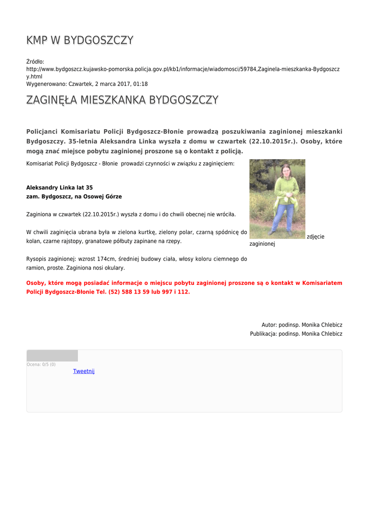 KMP W BYDGOSZCZY Źródło: http://www.bydgoszcz.kujawsko-pomorska.policja.gov.pl/kb1/informacje/wiadomosci/59784,Zaginela-mieszkanka-Bydgoszcz y.html Wygenerowano: Czwartek, 2 marca 2017, 01:18 ZAGINĘŁA MIESZKANKA BYDGOSZCZY Policjanci Komisariatu Policji Bydgoszcz-Błonie prowadzą poszukiwania zaginionej mieszkanki Bydgoszczy. 35-letnia Aleksandra Linka wyszła z domu w czwartek (22.10.2015r.). Osoby, które mogą znać miejsce pobytu zaginionej proszone są o kontakt z policją. Komisariat Policji Bydgoszcz - Błonie prowadzi czynności w związku z zaginięciem: Aleksandry Linka lat 35 zam. Bydgoszcz, na Osowej Górze Zaginiona w czwartek (22.10.2015r.) wyszła z domu i do chwili obecnej nie wróciła. W chwili zaginięcia ubrana była w zielona kurtkę, zielony polar, czarną spódnicę do kolan, czarne rajstopy, granatowe półbuty zapinane na rzepy. zdjęcie zaginionej Rysopis zaginionej: wzrost 174cm, średniej budowy ciała, włosy koloru ciemnego do ramion, proste. Zaginiona nosi okulary. Osoby, które mogą posiadać informacje o miejscu pobytu zaginionej proszone są o kontakt w Komisariatem Policji Bydgoszcz-Błonie Tel. (52) 588 13 59 lub 997 i 112. Autor: podinsp. Monika Chlebicz Publikacja: podinsp. Monika Chlebicz Ocena: 0/5 (0) Tweetnij