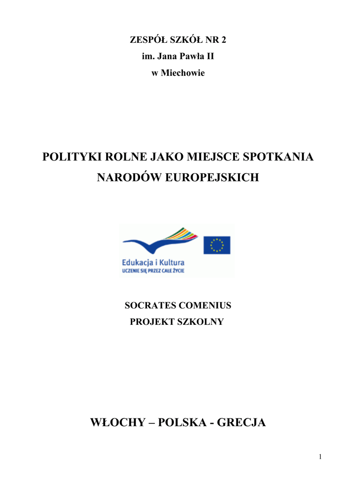 ZESPÓŁ SZKÓŁ NR 2 im. Jana Pawła II w Miechowie POLITYKI ROLNE JAKO MIEJSCE SPOTKANIA NARODÓW EUROPEJSKICH SOCRATES COMENIUS PROJEKT SZKOLNY WŁOCHY – POLSKA - GRECJA 1 I Projekt W ramach programu Socrates Comenius realizowany jest projekt pt. ,,Polityki rolne jako miejsce spotkania i współpracy narodów europejskich”. Zadania zostały skupione na aspektach historycznych, społeczno – kulturalnych, ekonomiczno – produkcyjnych i technologicznych krajów realizujących ten projekt. 1. 1. Partnerzy W I roku projekt ten był realizowany przez szkołę koordynującą: Istituto di istruzione superiore di Alatri (Włochy), a także trzy szkoły partnerskie: Tee Vonitsa (Grecja), Institut provincial d’enseignement agronomigue (Belgia), Zespół Szkół Nr 2 w Miechowie, w II i III roku biorą w nim udział szkoły: polska, grecka i włoska. 1. 2. Założenia pracy • Poznawanie kierunków i perspektyw gospodarczego rozwoju własnego regionu i regionów partnerów; • Prześledzenie struktury organizacyjnej małych i średnich przedsiębiorstw, prowadzących działalność rolniczą na terenie powiatu miechowskiego; • Poznanie genezy, celów, zasad Wspólnej Polityki Rolnej UE; • Charakterystyka gospodarki i rynków zbytu produktów rolnych, a także działań marketingowych we własnym regionie oraz w regionach partnerów w zakresie sektora nabiałowego mleczno – serowego; • Kształtowanie postaw przedsiębiorczych młodzieży (mleko w szkole); • Poznanie tradycji, kultury i zwyczajów własnego regionu i regionów partnerów (wizyty robocze, spotkania integracyjne, zwiedzanie miejsc kultu religijnego i dziedzictwa kulturowego); • Podnoszenie umiejętności posługiwania się językiem angielskim poprzez kontakty młodzieży, pobyt u rodzin uczniów biorących udział w projekcie oraz udział w dodatkowych zajęciach szkolnych; 2 • Poszerzanie kompetencji w zakresie komunikacyjno–informacyjnych informatorów i prezentacji poprzez nowoczesnych opracowanie multimedialnych technologii dwujęzycznych dotyczących dziedzictwa kulturowego własnego regionu, a także stały kontakt młodzieży poprzez Internet; • Kształtowanie postaw proeuropejskich i prokulturowych poprzez zwiększanie możliwości komunikacyjnych; • Prezentacja opracowanych materiałów w instytucjach samorządowych; • Rozpowszechnianie projektu poprzez stronę www, publikację artykułów w lokalnych i regionalnych mediach; • Stworzenie dwujęzycznego informatora gospodarczego w formie prezentacji multimedialnej (j. polski, j. angielski). 1. 3. Płaszczyzny działalności • Gromadzenie gospodarczych materiałów i z zakresu promocyjnych w struktury upraw regionie (ankiety, oraz działań wywiady z właścicielami gospodarstw rolnych i zakładów przetwórczych, analiza materiałów tematycznych dostępnych w urzędach i instytucjach); • Poznanie ras bydła rogatego, charakterystycznych dla Miechowszyzny, jak rasa białogrzbieta, rasa polska czerwona, rasa czarno – biała, rasa czerwono – biała; • Monitorowanie procesu produkcji mleka spożywczego; • Sprawdzanie składu chemicznego mleka, a także sporządzenie szczegółowego opisu tego produktu; • Analiza kolejnego produktu - sera i jego przetworów, czyli serków homogenizowanych, twarogów i twarożków serków śniadaniowych, serków topionych i kremowych, serów dojrzewających; • Badanie wartości odżywczych wyżej wymienionych produktów; 3 • Przedstawienie szczepionek, stosowanych w produkcji przetworów fermentowanych mlecznych; • Sprawdzenie obecności drożdży w serach; • Klasyfikacja serów z podziałem na świeże, kozie, topione, półtwarde, twarde, z porostem pleśniowym, z przerostem pleśniowym. 4 2.3 Rys historyczny Ziemi Miechowskiej Już ok. 30-15 tysięcy lat temu, w okresie paleolitu pojawił się na ziemi miechowskiej człowiek. Początkowo prowadził koczowniczy tryb życia, w okresie neolitu osiedlił się tu na stałe, utrzymując się z upraw zbóż i hodowli zwierząt domowych. Nowi osadnicy, którzy przybyli znad Dunaju zamieszkali na urodzajnych terenach lessowych. Z tego okresu pochodzą znaleziska w Jaksicach, Iwanowicach, Giebułtowie. W latach 1700-700 p.n.e., w epoce brązu pojawiła się miedzy innymi kultura łużycka, a także znaleziska z Biskupic, Iwanowic i Książa Wielkiego. Około 400 r. p.n.e. rozpoczynają się najazdy Scytów, którzy niszczą kulturę łużycką, a około 300 r. p.n.e. przybywają na te ziemie Celtowie, dzięki którym rozwinęła się obróbka żelaza. I wiek n.e. przypada na okres wpływów cesarstwa rzymskiego. Świadczą o tym liczne znaleziska przedmiotów pochodzenia rzymskiego, jak broń, naczynia, ozdoby i monety. Po okresie wędrówki ludów, napadach Hunów i Awarów w VII w. rozwija się na naszych ziemiach kultura prapolska, a z nią wiąże się powstanie plemion polskich. W połowie IX w. Miechowszczyzna należy do państwa plemiennego Wiślan i z końcem X w. podporządkowuje się książętom piastowskim, stając się częścią składową państwa polskiego i jedną z najlepiej rozwiniętych jego dzielnic. W okresie rozbicia dzielnicowego pozostaje ona w granicach Księstwa Krakowskiego. Tym samym została narażona na utarczki dzielnicowe, najazdy Tatarów i walki o zjednoczenie państwa polskiego. Ważnym wydarzeniem dla ziemi miechowskiej było sprowadzenie do Miechowa w 1162 r. przez powracającego z wyprawy krzyżowej ówczesnego władcę tej ziemi Jaksę Gryfitę z zakonu bożogrobców, zwanych później miechowitami. Powstały w Miechowie klasztor zyskał wielkie znaczenie i rozgłos, stając się jednym z bogatszych klasztorów w Polsce. Koniec XIII i wiek XIV przynoszą miastu i okolicy nowe klęski: ponowne najazdy Tatarów, zarazy, liczne pożary. W II poł. XVII w. zalewa cały kraj „potop szwedzki”, który nie oszczędza również i ziemi miechowskiej. Miasto, klasztor i okolica zostają doszczętnie zrabowane i zni