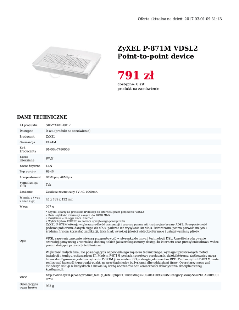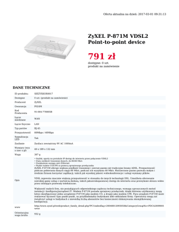 Oferta aktualna na dzień: 2017-03-01 09:31:13 ZyXEL P-871M VDSL2 Point-to-point device 791 zł dostępne: 0 szt. produkt na zamówienie DANE TECHNICZNE ID produktu: SIEZYXKOR0017 Dostępne 0 szt. (produkt na zamówienie) Producent ZyXEL Gwarancja F024M Kod Producenta 91-004-778005B Łącze miedziane WAN Łącze fizyczne LAN Typ portów RJ-45 Przepustowość 80Mbps / 40Mbps Sygnalizacja LED Tak Zasilanie Zasilacz zewnętrzny 9V AC 1000mA Wymiary (wys x szer x gł) 40 x 189 x 132 mm Waga 307 g • Szybki, oparty na protokole IP dostęp do internetu przez połączenie VDSL2 • Duża szybkość transmisji danych, do 80/40 Mb/s • Zwiększenie zasięgu sieci Ethernet • Wybór trybów CO/CPE za pomocą sprzętowego przełącznika ZyXEL P-871M oferuje większa prędkość transmisji i szersze pasmo niż tradycyjne bramy ADSL. Przepustowość podczas pobierania danych sięga 80 Mb/s, podczas ich wysyłania 40 Mb/s. Rozszerzone pasmo pozwala małym i średnim firmom korzystać zaplikacji, takich jak wysokiej jakości wideokonferencje i usługi wymiany plików. Opis VDSL zapewnia znacznie większą przepustowość w stosunku do innych technologii DSL. Umożliwia oferowanie szerokiej gamy usług z wartością dodaną, takich jakszerokopasmowy dostęp do internetu oraz przesyłanie obrazu wideo przez istniejące przewody telefoniczne. Większość małych firm, nie posiadających odpowiedniego zaplecza technicznego, wymaga uproszczonych metod instalacji i konfiguracjiurządzeń IT. Modem P-871M posiada sprzętowy przełącznik, dzięki któremu użytkownicy mogą łatwo skonfigurować jedno urządzenie P-871M jako modem CO, a drugie jako modem CPE. Para urządzeń P-871M może realizować łączność typu punkt-punkt, na przykładmiędzy budynkami albo oddziałami firmy. Operatorzy mogą zaś świadczyć usługi w budynkach z niewielką liczbą abonentów bez konieczności dokonywania skomplikowanej konfiguracji. www http://www.zyxel.pl/web/product_family_detail.php?PC1indexflag=20040812093058&CategoryGroupNo=PDCA2009001 www Orientacyjna waga brutto 932 g Orientacyjna waga brutto opak. zbior. 0g Ilość w opakowaniu zbiorczym orientacyjnie 0 szt. Podane ceny są cenami brutto. Mimo dołożenia wszelkich starań nie gwarantujemy, że publikowane dane techniczne nie zawierają uchybień lub błędów. Ewentualne błędne opisy nie mogą być podstawą do roszczeń, dlatego w przypadku jakichkolwiek wątpliwości prosimy przed podjęciem decyzji o zakupie o kontakt z handlowcem. * ** GALERIA