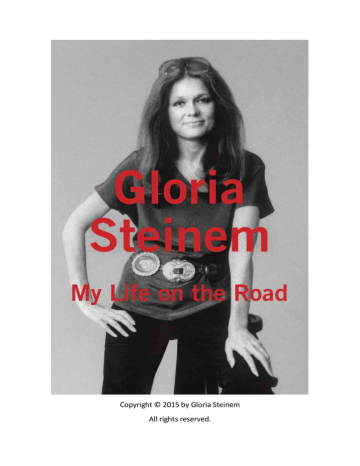 Copyright © 2015 by Gloria Steinem All rights reserved. Published in the United States by Random House, an imprint and division of Penguin Random House LLC, New York. RANDOM HOUSE and the HOUSE colophon are registered trademarks of Penguin Random House LLC. Grateful acknowledgment is made to the following for permission to reprint previously published material: Houghton Mifflin Harcourt Publishing Company and The Joy Harris Literary Agency, Inc.: Excerpts from “In These Dissenting Times” from Revolutionary Petunias & Other Poems by Alice Walker, copyright © 1970 and copyright renewed 1998 by Alice Walker. Electronic rights and rights throughout the U.K. and Commonwealth are controlled by The Joy Harris Literary Agency, Inc. Reprinted by permission of Houghton Mifflin Harcourt Publishing Company and The Joy Harris Literary Agency, Inc. Sony/ATV Music Publishing LLC: Excerpt from “Rainy Night in Georgia” written by Tony White, copyright © 1969 Combine Music Corp. All rights administered by Sony/ATV Music Publishing LLC, 424 Church Street, Suite 1200, Nashville, TN 37219. All rights reserved. Reprinted by permission. LIBRARY OF CONGRESS CATALOGING-IN-PUBLICATION DATA Steinem, Gloria. My life on the road / Gloria Steinem. pages cm ISBN 978-0-679-45620-9 eBook ISBN 978-0-8129-8835-2 1. Steinem, Gloria. 2. Feminists—United States—Biography. 3. Feminism—United States. I. Title. HQ1413.S675A3 2015 305.42092—dc23 [B] 2015010718 eBook ISBN 9780812988352 randomhousebooks.com Title page photograph © Marianne Barcellona Book design by Barbara M. Bachman, adapted for eBook Cover design: Gregg Kulick Cover photograph: © Tom Victor v4.1_r1 ep Contents Cover Title Page Copyright Epigraph Prelude Introduction: Road Signs I: My Father’s Footsteps II: Talking Circles III: Why I Don’t Drive IV: One Big Campus V: When the Political Is Personal VI: Surrealism in Everyday Life VII: What Once Was Can Be Again Afterword: Coming Home Dedication Notes of Gratitude Notes Other Titles About the Author “Evolution intended us to be travelers….Settlement for any length of time, in cave or castle, has at best been…a drop in the ocean of evolutionary time.” —Bruce Chatwin, ANATOMY OF RESTLESSNESS I board a plane for Rapid City, South Dakota, and see a lot of people in black leather, chains, and tattoos. Airline passengers usually look like where they’re going—business suits to Washington, D.C., jeans to L.A.—but I can’t imagine a convention of such unconventional visitors in Rapid City. It’s the kind of town where people still angle-park their cars in front of the movie palace. My bearded seatmate is asleep in his studded jacket and nose ring, so I just accept one more mystery of the road. At the airport, I meet five friends from different parts of the country. We are a diverse group of women—a Cherokee activist and her grown-up daughter, two African American writers and one musician, and me. We’ve been invited to a Lakota Sioux powwow celebrating the powerful place that women held before patriarchy arrived from Europe, and efforts now to restore that place. As we drive toward the Badlands, we see an acre of motorcycles around each isolated diner and motel. This solves the mystery of the leather and chains, but creates another. When we stop for coffee, our waitress can’t believe we don’t know. Every August since 1938, bikers from all over the world have come here for a rally named after Sturgis, a town that’s just a wide place in the road. They are drawn by this sparsely populated space of forests, mountains, and a grid of highways so straight that it is recognizable from outer space. Right now about 250,000 bikers are filling every motel and campground within five hundred miles. Our band of six strong women takes note. The truth is we are a little afraid of so many bikers in one place. How could we not be? We have all learned from movies that bikers travel in packs, treat their women like possessions, and may see other women as sexual fair game. But we don’t run into the bikers because we spend our days traveling down unmarked roads, past the last stand of trees, in Indian Country. We eat homecooked food brought in trucks, sit on blankets around powwow grounds where dancers follow the heartbeat of drums, and watch Indian ponies as decorated as the dancers. When it rains, a rainbow stretches from can’t-see to can’t-see, and fields of wet sweet grass become as fragrant as gigantic flowers. Only when we return late each night to our cabins do we see motorcycles in the parking lot. While walking in Rapid City, I hear a biker say to his tattooed woman partner, “Honey, shop as long as you want—I’ll meet you at the cappuccino place.” I assume this is an aberration. On our last morning, I enter the lodge alone for an early breakfast, trying to remain both inconspicuous and open-minded. Still, I’m hyperconscious of a room full of knife sheaths, jackboots, and very few women. In the booth next to me, a man with chains around his muscles and a woman in leather pants and an improbable hairdo are taking note of my presence. Finally, the woman comes over to talk. “I just want to tell you,” she says cheerfully, “how much Ms. magazine has meant to me over the years—and my husband, too. He reads some now that he’s retired. But what I wanted to ask—isn’t one of the women you’re traveling with Alice Walker? I love her poetry.” It turns out that she and her husband have been coming to this motorcycle rally every year since they were first married. She loves the freedom of the road and also the mysterious moonscape of the Badlands. She urges me to walk there, but to follow the paths marked by ropes. During the war over the sacred Black Hills, she explains, Lakota warriors found refuge there because the cavalry got lost every time. Her husband stops by on his way to the cashier and suggests I see the huge statue of Crazy Horse that’s being dynamited out