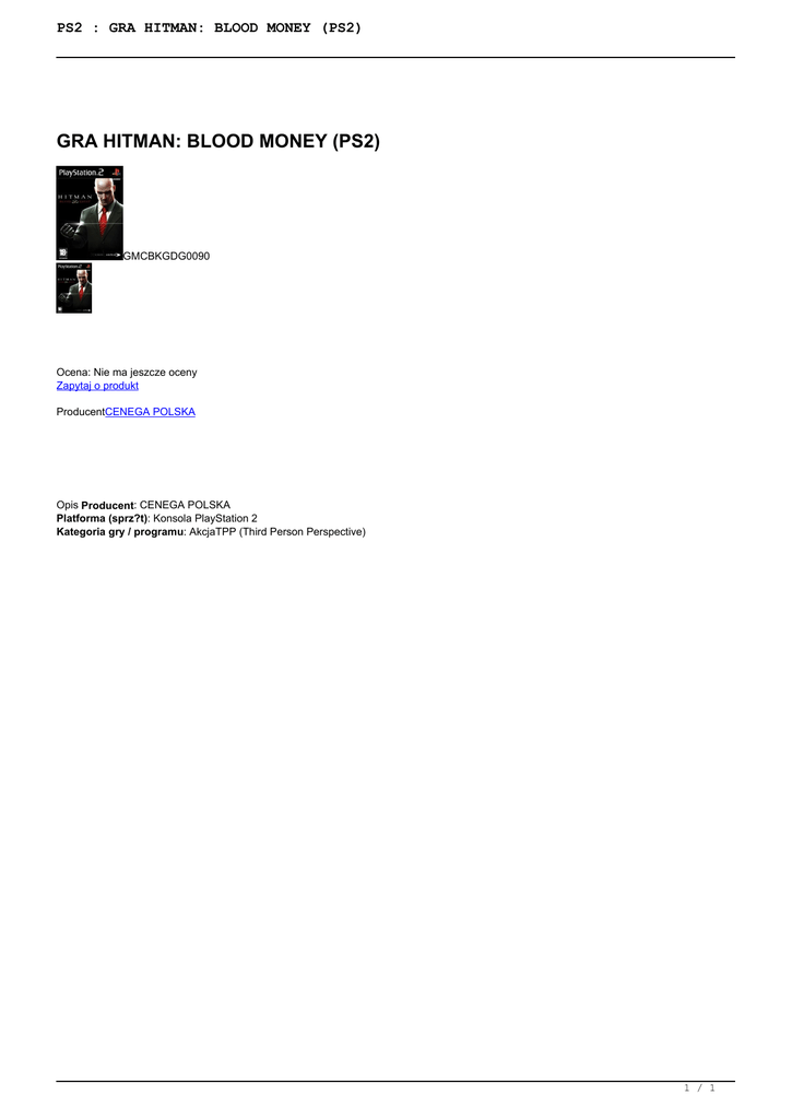 PS2 : GRA HITMAN: BLOOD MONEY (PS2)
