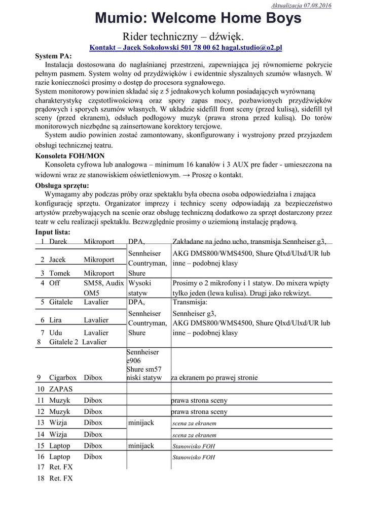 Aktualizacja 07.08.2016 Mumio: Welcome Home Boys Rider techniczny – dźwięk. Kontakt – Jacek Sokołowski 501 78 00 62 [email protected] System PA: Instalacja dostosowana do nagłaśnianej przestrzeni, zapewniająca jej równomierne pokrycie pełnym pasmem. System wolny od przydźwięków i ewidentnie słyszalnych szumów własnych. W razie konieczności prosimy o dostęp do procesora sygnałowego. System monitorowy powinien składać się z 5 jednakowych kolumn posiadających wyrównaną charakterystykę częstotliwościową oraz spory zapas mocy, pozbawionych przydźwięków prądowych i sporych szumów własnych. W układzie sidefill front sceny (przed kulisą), sidefill tył sceny (przed ekranem), odsłuch podłogowy muzyk (prawa strona przed kulisą). Do torów monitorowych niezbędne są zainsertowane korektory tercjowe. System audio powinien zostać zamontowany, skonfigurowany i wystrojony przed przyjazdem obsługi technicznej teatru. Konsoleta FOH/MON Konsoleta cyfrowa lub analogowa – minimum 16 kanałów i 3 AUX pre fader - umieszczona na widowni wraz ze stanowiskiem oświetleniowym. → Proszę o kontakt. Obsługa sprzętu: Wymagamy aby podczas próby oraz spektaklu była obecna osoba odpowiedzialna i znająca konfigurację sprzętu. Organizator imprezy i technicy sceny odpowiadają za bezpieczeństwo artystów przebywających na scenie oraz obsługę techniczną dodatkowo za sprzęt dostarczony przez teatr w celu realizacji spektaklu. Bezwzględnie prosimy o uziemioną instalację prądową. Input lista: 1 Darek Mikroport DPA, Zakładane na jedno ucho, transmisja Sennheiser g3, 5 Gitalele Sennheiser Countryman, Mikroport Shure SM58, Audix Wysoki OM5 statyw Lavalier DPA, 6 Lira Lavalier 2 Jacek 3 Tomek 4 Off Mikroport 7 Udu Lavalier 8 Gitalele 2 Lavalier 9 Cigarbox Dibox AKG DMS800/WMS4500, Shure Qlxd/Ulxd/UR lub inne – podobnej klasy Prosimy o 2 mikrofony i 1 statyw. Do mixera wpięty tylko jeden (lewa kulisa). Drugi jako rekwizyt. Transmisja: Sennheiser Sennheiser g3, Countryman, AKG DMS800/WMS4500, Shure Qlxd/Ulxd/UR lub Shure inne – podobnej klasy Sennheiser e906 Shure sm57 niski statyw za ekranem po prawej stronie 10 ZAPAS 11 Muzyk Dibox prawa strona sceny 12 Muzyk 13 Wizja Dibox Dibox prawa strona sceny 14 Wizja Dibox 15 Laptop 16 Laptop 17 Ret. FX Dibox Dibox 18 Ret. FX minijack scena za ekranem scena za ekranem minijack Stanowisko FOH Stanowisko FOH