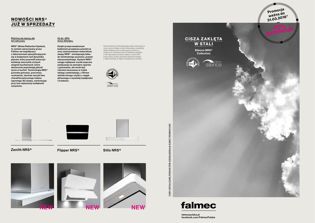 ocja Prom do wa ż n a 1 6 * .20 3 1 .0 3 — N OWO Ś C I N R S ® J U Ż W S P R Z E DA Ż Y Aż do -86% mocy dźwięku. NRS® (Noise Reduction System), to system opracowany przez Falmec we współpracy z laboratoriami specjalizującymi się w badaniach nad dynamiką płynów, który pozwolił stworzyć kolekcję niezwykle cichych okapów kuchennych, które skutecznie poprawiają jakość życia w kuchni. Technologia NRS® pozwala gotować, pracować, rozmawiać, słuchać muzyki bez charakterystycznego hałasu typowego dla okapu, zachowując przy tym najwyższą wydajność zasysania. Dzięki przeprowadzonym badaniom przepływu powietrza oraz zastosowanym materiałom, okapy NRS® zmniejszają hałas do minimalnego poziomu, prawie niezauważalnego. System NRS® osiąga najlepsze wyniki poprzez ewakuację na zewnątrz oparów z gotowania, ale może być również stosowany w trybie obiegu zamkniętego, z filtrem wielokrotnego użytku z węgla aktywnego o wysokiej wydajności i trwałości. W porównaniu do standardowego okapu obecnego na rynku, poziom hałasu został zredukowany radykalnie. Hałas odbierany jest w skali logarytmicznej, co oznacza, że obniżenie poziomu natężenia dźwięku o 1db odpowiada obniżeniu hałasu o około 20%. Innymi słowy, każde obniżenie natężenia dźwięku o 3dB powoduje, że hałas zmniejsza się o połowę. Zenith NRS® Flipper NRS® Stilo NRS® NEW NEW C I S Z A Z A K L Ę TA W STA L I Silence NRS® Collection *C E N Y D E TA L I C Z N E P R O D U K TÓW U W ZG L Ę D N I A J Ą R A B AT P R O M O CYJ N Y Różnicę się słyszy, ale też odczuwa. NEW falmecpolska.pl facebook.com/FalmecPolska -1 0 % cja o m o r p SileNce NRS® c o l l ec t io n grupa Silnikowa NRS® lumina NRS® Horizon NRS® Aria NRS® plane NRS® Vela NRS® Wykończenie Stal inox AISI 304 - szczotkowana Wykończenie Stal inox AISI 304 - szczotkowana Wykończenie Stal inox AISI 304 - szczotkowana Szkło hartowane białe lub czarne Wykończenie Stal inox AISI 304 - szczotkowana Silnik i Sterowanie 800 m³/h elektroniczne, 4 szybkości Wykończenie Stal inox AISI 304 szczotkowana Szkło hartowane wykończone na stalowy, biały lub czarny Wykończenie Czasza i komin białe Spód białe szkło hartowane Filtry Filtr wysokiej wydajności Silnik i Sterowanie 800 m³/h sensorowe, 4 szybkości oświetlenie LED 2 x 1,2W (3200 K) Filtry Filtr wysokiej wydajności klasa Energetyczna B oświetlenie Przyścienny Neon 90 cm: 1 x 21W 120 cm: 1 x 28W Wyspowy Neon 2 x 21W CENA: Grupa Silnikowa NRS® 50 800 m 3/h 4.450,Grupa Silnikowa NRS® 70 800 m 3/h 4.810,- klasa Energetyczna B - 90 ; 120 C - 90 Isola CENA: Lumina NRS® 90 800 m 3/h 5.400,- Silnik i Sterowanie 800 m³/h sensorowe, 4 szybkości Filtry Filtr wysokiej wydajności oświetlenie Przyścienny Neon 90 cm: 1 x 21W 120 cm: 1 x 28W 150 cm: 2 x 13W Wyspowy Neon 90 cm: 2 x 21W 150 cm: 4 x 13W 180 cm: 4 x 21W klasa Energetyczna B - 90 ; 120 ; 180 Isola C - 90 Isola D - 150 ; 150 Isola Silnik i Sterowanie 800 m³/h sensorowe, 4 szybkości Filtry Filtr wysokiej wydajności oświetlenie Pasmo LED 4W (5500 K) klasa Energetyczna B CENA: Aria NRS® 80 800 m 3/h 7.200,- Silnik i Sterowanie 800 m³/h elektroniczne, 4 szybkości Filtry Filtr wysokiej wydajności oświetlenie Przyścienny LED 90 cm: 2 x 1,2W (3200 K) LED 120 cm: 3 x 1,2W (3200 K) Wyspowy LED 4 x 1,2W (3200 K) klasa Energetyczna B CENA: Plane NRS® 90 800 m 3/h 4.720,Plane NRS® 120 800 m 3/h 4.950,- Lumina NRS® 120 800 m 3/h 6.030,- CENA: Horizon NRS® 90 800 m 3/h 5.400,- Plane NRS® Isola 90 800 m 3/h 6.160,- Lumina NRS® Isola 90 800 m 3/h 6.840,- Horizon NRS® 120 800 m 3/h 6.300,- Plane NRS® Isola 120 800 m 3/h 6.390,- Horizon NRS® 150 800 m 3/h 7.650,Horizon NRS® Isola 90 800 m 3/h 6.840,Horizon NRS® Isola 150 800 m 3/h 8.550,Horizon NRS® Isola 180 2x800 m 3/h 15.030,- Silnik i Sterowanie 800 m³/h sensorowe, 4 szybkości Filtry Filtr wysokiej wydajności oświetlenie Przyścienny Pasmo LED 27W (5500 K) Wyspowy Pasmo LED 48W (5500 K) klasa Energetyczna B - 90 C - 100 Isola CENA: Vela NRS® 90 800 m 3/h 7.200,Vela NRS® Isola 100 800 m 3/h 9.000,-