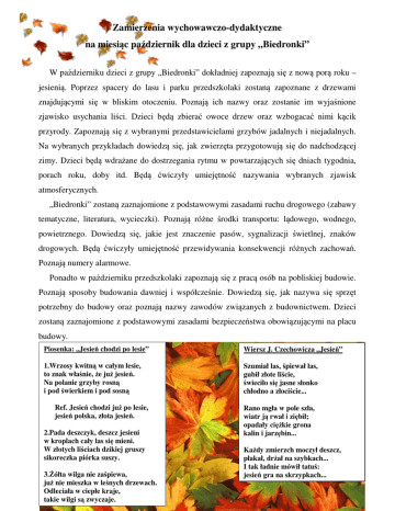 Zamierzenia wychowawczo-dydaktyczne na miesiąc październik dla dzieci z grupy „Biedronki” W październiku dzieci z grupy „Biedronki” dokładniej zapoznają się z nową porą roku – jesienią. Poprzez spacery do lasu i parku przedszkolaki zostaną zapoznane z drzewami znajdującymi się w bliskim otoczeniu. Poznają ich nazwy oraz zostanie im wyjaśnione zjawisko usychania liści. Dzieci będą zbierać owoce drzew oraz wzbogacać nimi kącik przyrody. Zapoznają się z wybranymi przedstawicielami grzybów jadalnych i niejadalnych. Na wybranych przykładach dowiedzą się, jak zwierzęta przygotowują się do nadchodzącej zimy. Dzieci będą wdrażane do dostrzegania rytmu w powtarzających się dniach tygodnia, porach roku, doby itd. Będą ćwiczyły umiejętność nazywania wybranych zjawisk atmosferycznych. „Biedronki” zostaną zaznajomione z podstawowymi zasadami ruchu drogowego (zabawy tematyczne, literatura, wycieczki). Poznają różne środki transportu: lądowego, wodnego, powietrznego. Dowiedzą się, jakie jest znaczenie pasów, sygnalizacji świetlnej, znaków drogowych. Będą ćwiczyły umiejętność przewidywania konsekwencji różnych zachowań. Poznają numery alarmowe. Ponadto w październiku przedszkolaki zapoznają się z pracą osób na pobliskiej budowie. Poznają sposoby budowania dawniej i współcześnie. Dowiedzą się, jak nazywa się sprzęt potrzebny do budowy oraz poznają nazwy zawodów związanych z budownictwem. Dzieci zostaną zaznajomione z podstawowymi zasadami bezpieczeństwa obowiązującymi na placu budowy. Piosenka: „Jesień chodzi po lesie” Wiersz J. Czechowicza „Jesień” 1.Wrzosy kwitną w całym lesie, to znak właśnie, że już jesień. Na polanie grzyby rosną i pod świerkiem i pod sosną Szumiał las, śpiewał las, gubił złote liście, świeciło się jasne słonko chłodno a złociście... Ref. Jesień chodzi już po lesie, jesień polska, złota jesień. 2.Pada deszczyk, deszcz jesieni w kroplach cały las się mieni. W złotych liściach dzikiej gruszy sikoreczka piórka suszy. 3.Żółta wilga nie zaśpiewa, już nie mieszka w leśnych drzewach. Odleciała w ciepłe kraje, takie wilgi są zwyczaje. Rano mgła w pole szła, wiatr ją rwał i ziębił; opadały ciężkie grona kalin i jarzębin... Każdy zmierzch moczył deszcz, płakał, drżał na szybkach... I tak ładnie mówił tatuś: jesień gra na skrzypkach...