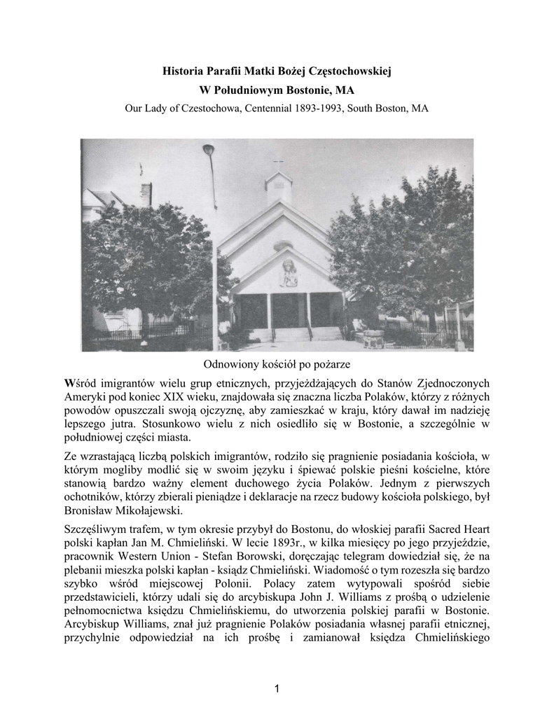 Historia Parafii Matki Bożej Częstochowskiej W Południowym Bostonie, MA Our Lady of Czestochowa, Centennial 1893-1993, South Boston, MA Odnowiony kościół po pożarze Wśród imigrantów wielu grup etnicznych, przyjeżdżających do Stanów Zjednoczonych Ameryki pod koniec XIX wieku, znajdowała się znaczna liczba Polaków, którzy z różnych powodów opuszczali swoją ojczyznę, aby zamieszkać w kraju, który dawał im nadzieję lepszego jutra. Stosunkowo wielu z nich osiedliło się w Bostonie, a szczególnie w południowej części miasta. Ze wzrastającą liczbą polskich imigrantów, rodziło się pragnienie posiadania kościoła, w którym mogliby modlić się w swoim języku i śpiewać polskie pieśni kościelne, które stanowią bardzo ważny element duchowego życia Polaków. Jednym z pierwszych ochotników, którzy zbierali pieniądze i deklaracje na rzecz budowy kościoła polskiego, był Bronisław Mikołajewski. Szczęśliwym trafem, w tym okresie przybył do Bostonu, do włoskiej parafii Sacred Heart polski kapłan Jan M. Chmieliński. W lecie 1893r., w kilka miesięcy po jego przyjeździe, pracownik Western Union - Stefan Borowski, doręczając telegram dowiedział się, że na plebanii mieszka polski kapłan - ksiądz Chmieliński. Wiadomość o tym rozeszła się bardzo szybko wśród miejscowej Polonii. Polacy zatem wytypowali spośród siebie przedstawicieli, którzy udali się do arcybiskupa John J. Williams z prośbą o udzielenie pełnomocnictwa księdzu Chmielińskiemu, do utworzenia polskiej parafii w Bostonie. Arcybiskup Williams, znał już pragnienie Polaków posiadania własnej parafii etnicznej, przychylnie odpowiedział na ich prośbę i zamianował księdza Chmielińskiego 1 duszpasterzem Polaków na Boston, Salem i okolice. Trzeba stwierdzić, że ksiądz Chmieliński stał się nie tylko pierwszym proboszczem polskim w Bostonie, ale jednocześnie pełnił funkcję misjonarza dla swoich współrodaków mieszkających w okolicy. Taki oto był początek rzymsko-katolickiej parafii polskiej we wschodniej Nowej Anglii, która została ustanowiona dnia 2 października 1893 roku. Ksawery Borkowski Ksiądz Chmieliński urodził się 13 listopada 1868r., w Nasiak, w powiecie Przasnysz, w Polsce. Po ukończeniu szkół w Płocku, wstąpił do Zgromadzenia Św. Karola w mieście Piacenza we Włoszech. Święcenia kapłańskie przyjął w Rzymie w kwietniu 1892 roku. Przybył do Bostonu 28 maja 1893 r., i rozpoczął pracę we włoskiej parafii Sacred Heart. Pracował tam bardzo krótko, ponieważ już w październiku, arcybiskup Williams zamianował go duchowym opiekunem Polonii. Początkowo, na polecenie arcybiskupa Williams, Msze św. po polsku były odprawiane w dolnym kościele niemieckim Holy Trinity, mieszczącym się przy Shawmut Ave. Nie trwało to jednak długo. W krótkim czasie polscy imigranci, pod przewodnictwem księdza Chmielińskiego, opracowali plany budowy swojego kościoła. Ponieważ większość z nich mieszkała w południowym Bostonie i okolicy, ksiądz Chmieliński szukał posesji pod budowę nowego kościoła w pobliżu Andrew Square. Dnia 29 listopada 1893 r., ksiądz Chmieliński zakupił plac wielkości 3,000 metrów kwadratowych, mieszczący się pomiędzy Dorchester Ave. i Boston St. Koszt terenu wyniósł $ 7,000 do tego dnia Polacy zebrali na budowę swojej świątyni $ 3,000. Bronisław Mikołajewski Widok Plebanii i Kościoła Ksiądz Chmieliński pracował niestrudzenie, z pełnym poświęceniem dla potrzeb nowo powstałej parafii. Interesował się i pomagał nie tylko członkom swojej parafii, ale również 3 był inspiratorem powstania następnych polskich parafii w okolicy Bostonu, np. w Lynn, Salem, Brockton, Lowell i Hyde Park. Starsi członkowie parafii Św. Wojciecha w Hyde Park, powstałej w 1913 r., pamiętają opowiadania swoich rodziców o księdzu Chmielińskim, który przyjeżdżał do Hyde Park, zaprzężonym w konia powozem, z pomocą duchową dla tych, którzy jej najbardziej potrzebowali. Dnia 15 czerwca 1894 r. rozpoczęła się budowa kościoła. W dniu 15-ego lipca pomocniczy biskup Brady poświęcił kamień węgielny dla budującego się kościoła. W niedzielę - 18 listopada arcybiskup Williams nadał budowanemu kościołowi przy Boston St. tytuł Parafia Matki Bożej Częstochowskiej. Po tej ceremonii odprawiono Mszę Św., którą celebrował O. Charles Gudemus S. J., proboszcz z kościoła Holy Trinity, w którym to kościele odprawiały się nabożeństwa dla Polaków, zanim ukończono budowę ich własnego kościoła. Funkcję diakona w tej Mszy spełnił Fr. Richard Neagle - ówczesny kanclerz archidiecezji bostońskiej, zaś funkcję subdiakona Francis Fremel z Nowego Jorku, który także wygłosił kazanie po polsku; po angielsku kazanie wygłosił Fr. O. Joseph Splaine ze Salem. O. Michał Cieślik O.F.M. Conv. Pierwszy Proboszcz z Zakonu Franciszkanów 1940-1942 Początkowa liczba parafian wynosiła 600 osób. Liczba ta wzrastała bardzo szybko, w miarę rozchodzenia się informacji o zbudowanym kościele. Nawet ci, którzy należeli do innych parafii, przyłączali się teraz do nowej parafii, gdzie mogli usłyszeć kazania głoszone w języku polskim. Parafia objęła swoim zasięgiem rodziny mieszkające w Cambridge, Chelsea, sam Boston i okoliczne miejscowości. Stało się teraz także koniecznym zorganizowanie nauczania religii dla dzieci z tych rejonów. Rozrastająca się ustawicznie parafia, przekraczała możliwości jednego kapłana, który by podołał wszystkim obowiązkom duszpasterskim. W 1898 roku do pomocy ks. Chmielińskiemu przysłano nowo wyświęconego w seminarium w Brighton - księdza Jana J. Czubek. W czasie tych kilku lat istnienia kościoła przy Boston Street, życie parafii rozwijało się bardzo aktywnie. Organizowano spotkania o charakterze wybitnie religijnym, ale także i spotkania towarzyskie, których celem było jednoczenie parafian, a także imprezy te 