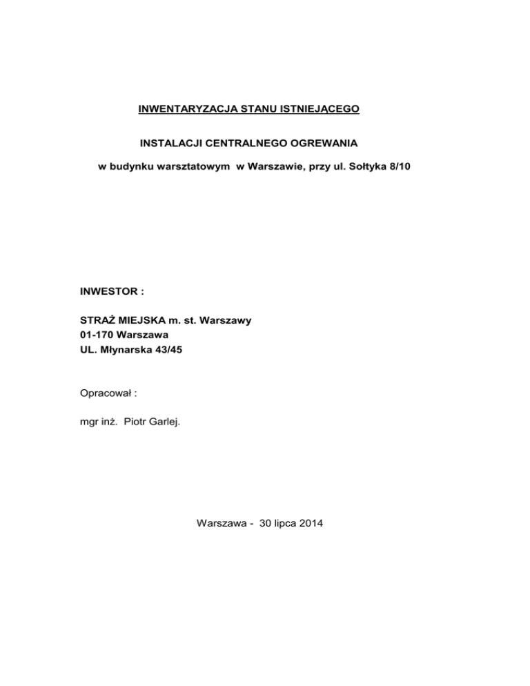 INWENTARYZACJA STANU ISTNIEJĄCEGO INSTALACJI CENTRALNEGO OGREWANIA w budynku warsztatowym w Warszawie, przy ul. Sołtyka 8/10 INWESTOR : STRAŻ MIEJSKA m. st. Warszawy 01-170 Warszawa UL. Młynarska 43/45 Opracował : mgr inż. Piotr Garlej. Warszawa - 30 lipca 2014 SPIS TREŚCI : 1. Wstęp 2. Opis ogólny instalacji 2. Szczegółowy opis instalacji C.O. 1. Wstęp Inwentaryzację wykonano na podstawie wizji lokalnej i materiałów udostępnionych przez Inwestora. Celem poniższej inwentaryzacji jest określenie stanu technicznego, instalacji centralnego ogrzewania, w budynku warsztatowym Straży Miejskiej, w Warszawie przy ul. Sołtyka 8/10. 2. Opis ogólny instalacji Na dzień dzisiejszy nie jest dostępna dokumentacja techniczna, istniejącej instalacji C.O. Na podstawie oględzin można stwierdzić że, instalacja nie przechodziła generalnego remontu w ostatnich kilkudziesięciu latach a jej wiek oceniam na ponad 40 lat. Najpoważniejszym remontem w ostatnich latach, była przebudowa systemu odpowietrzenia instalacji. Układ otwarty zmieniono na układ zamknięty. Piony zasilające grzejniki, zakończono lokalnymi odpowietrznikami automatycznymi typu Valmat. W/w instalacja jest to instalacja pompowa, zasilana z lokalnego węzła cieplnego i wykonana z rur stalowych spawanych dn 15-100 mm. W całym budynku zastosowane zostały grzejniki rurowe, typu Favier, różnej wielkości. Poziomy zasilające, prowadzone są, w przeważającej części budynku, w kanałach instalacyjnych ale część instalacji poprowadzono na ścianach budynku. Istniejący układ grzewczy budynku można podzielić na trzy strefy: - Strefa I. Pomieszczenia nr 1 - 5 i hol wejściowy zasilane osobnym poziomem, bezpośrednio z węzła cieplnego. Strefa II Pomieszczenia nr 29 – 35 i korytarz zasilane zasilane osobnym poziomem, bezpośrednio z węzła cieplnego. Strefa III. Pomieszczenia nr 6 – 28 zasilane z podwęzła, usytuowanego pomieszczeniu nr 27. Podwęzeł, wyposażony jest w rozdzielacze i zasilany z węzła cieplnego. Tranzyt zasilający podwęzeł, poprowadzono w kanale instalacyjnym . Ogólny stan techniczny, omawianej instalacji centralnego ogrzewania jest zły. Rurociągi i grzejniki stalowe, są w wielu miejscach skorodowane i nieszczelne. Instalacja jest zamulona i nosi ślady licznych, lokalnych napraw. Większość grzejników nie posiada żadnych zaworów regulacyjnych, jedynie kryzy, których część jest niedrożna. Istniejące odpowietrzenia pionów, w przeważającej części są niesprawne. Stwierdzono także niedrożność części gałązek ( powroty) zasilających grzejniki. W czasie ostatniego sezonu grzewczego, wystąpiły problemy z ogrzewaniem pomieszczeń, zasilanych z końcowych odcinków poszczególnych gałęzi instalacji. W związku z tym, wykonano częściową wymianę, poziomów, wraz z grzejnikami, w pomieszczeniach nr 2,3,4 i 5 oraz pomieszczeniach nr 29,30,31 i 32. Wymieniono również grzejniki w holu wejściowym i korytarzu. W/w odcinki instalacji wykonano w technologii PP STABI. Grzejniki typu Favier zastąpiono grzejnikami blaszanymi typu C. Każdy grzejnik wyposażony jest w zawór termostatyczny, zawór powrotny i odpowietrznik. Piony zasilające, zakończone są odpowietrznikami automatycznymi z zaworem stopowym i zaworem odcinającym. Podczas remontu, powyższe, nowe odcinki instalacji, należy pozostawić jako całkowicie sprawne. 3. Szczegółowy opis istniejącej instalacji. 3,1 Strefa I instalacji budynku ( pomieszczenia 1,2,3,4,5, hol wejściowy) 3,1,1 - Hol wejściowy - poziom z rur stalowych ,w kanale instalacyjnym, grzejnik wraz z pionem zasilającym wymieniony na nowy. Uwagi : Hol należy doposażyć w grzejnik typu C33 90-180. – szt. 1 Grzejnik wyposażony w zawór termostatyczny, powrotny i odpowietrznik Usytuowanie zgodnie z rysunkiem. Grzejnik zasilany z osobnego pionu, zakończonego odpowietrznikiem automatycznym z zaworem odcinającym. Poziom w kanale instalacyjnym wymienić na nowy z rur PP STABI fi 32 mm Rurociągi zaizolować otuliną z PU 3,1,2 - Pomieszczenie nr 1 – poziom z rur stalowych, na ścianie budynku , grzejniki typu Favier - stan techniczny zły. Uwagi : Istniejące grzejniki wymienić na grzejniki blaszane typu C22 50-100. – szt 4 Grzejniki wyposażone w zawór termostatyczny, powrotny i odpowietrznik Usytuowanie zgodnie z rysunkiem. Piony zasilające zakończyć automatycznym odpowietrznikiem – szt 2 Poziom wymienić na nowy, z rur PP STABI fi 32 mm Połączyć z nowowybudowaną częścią instalacji z rur PP STABI fi 32mm Rurociągi zaizolować otuliną z PU 3,1,3 - Pomieszczenie nr 2,3,4,5 – instalacja wykonana z rur PP STABI, na ścianie budynku , grzejniki blaszane typu C, odpowietrzenia automatyczne. - stan techniczny dobry , pozostawić bez zmian 3,2 Strefa II instalacji budynku ( pomieszczenia 29,30,31,32,33,34,35) 3,2,1 - Pomieszczenie nr 35 – poziom z rur stalowych, w kanale instalacyjnym , 2 grzejniki typu Favier - stan techniczny zły. Uwagi : Istniejące grzejniki wymienić na grzejniki blaszane typu C22 50-140 – 1 szt. i C 50-100 – 1 szt. Grzejniki wyposażone w zawór termostatyczny, powrotny i odpowietrznik Usytuowanie zgodnie z rysunkiem. Pion zasilający zakończyć automatycznym odpowietrznikiem – szt 1 Poziom w kanale instal., wymienić na nowy, z rur PP STABI fi 40 mm Rurociągi zaizolować otuliną z PU 3,2,2 - Pomieszczenie nr 34,33 – poziom z rur stalowych, w kanale instalacyjnym , 3 grzejniki typu Favier - stan techniczny zły. Uwagi : Istniejące grzejniki wymienić na grzejniki blaszane typu C22 50-120 – 3 szt. Grzejniki wyposażone w zawór termostatyczny, powrotny i odpowietrznik Usytuowanie zgodnie z rysunkiem. Pion zasilający zakończyć automatycznym odpowietrznikiem – szt 1 Poziom w kanale instal., wymienić na nowy, z rur PP STABI fi 32 mm Rurociągi zaizolować otuliną z PU 3,2,3 - Pomieszczenie nr 32 – poziom z rur stalowych, w kanale instalacyjnym, 3 grzejniki typu Favi