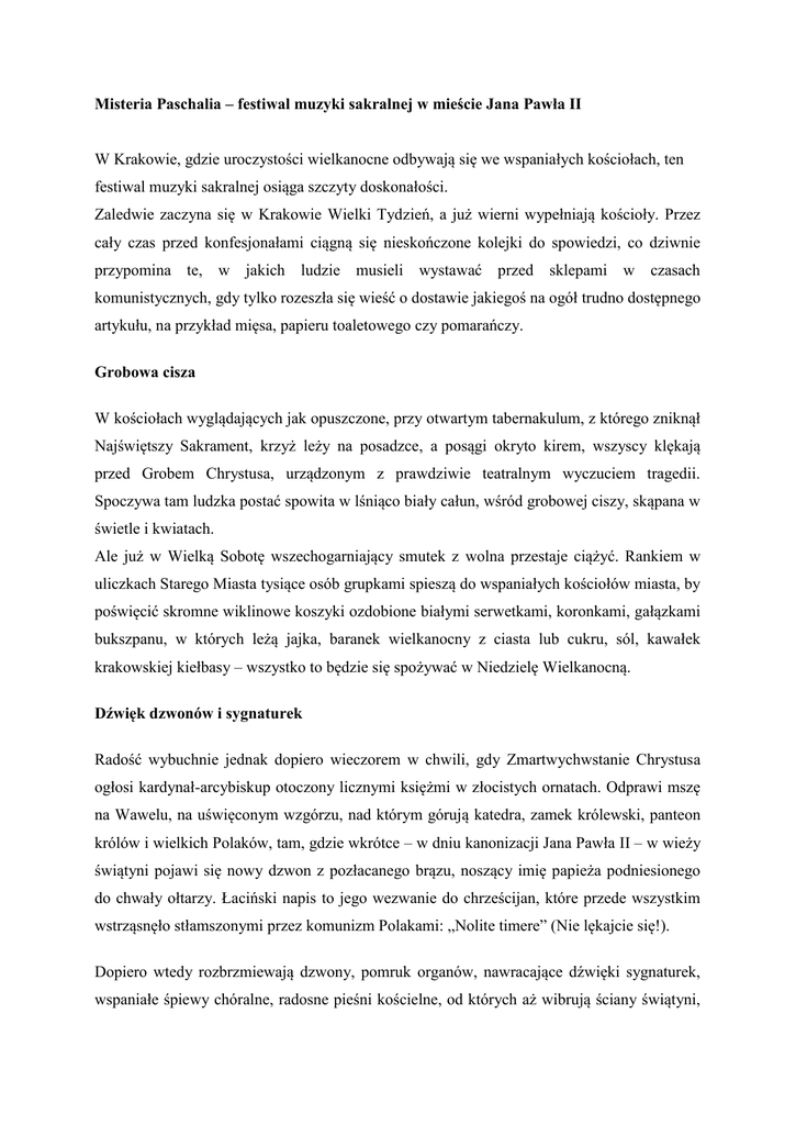 Misteria Paschalia – festiwal muzyki sakralnej w mieście Jana Pawła II W Krakowie, gdzie uroczystości wielkanocne odbywają się we wspaniałych kościołach, ten festiwal muzyki sakralnej osiąga szczyty doskonałości. Zaledwie zaczyna się w Krakowie Wielki Tydzień, a już wierni wypełniają kościoły. Przez cały czas przed konfesjonałami ciągną się nieskończone kolejki do spowiedzi, co dziwnie przypomina te, w jakich ludzie musieli wystawać przed sklepami w czasach komunistycznych, gdy tylko rozeszła się wieść o dostawie jakiegoś na ogół trudno dostępnego artykułu, na przykład mięsa, papieru toaletowego czy pomarańczy. Grobowa cisza W kościołach wyglądających jak opuszczone, przy otwartym tabernakulum, z którego zniknął Najświętszy Sakrament, krzyż leży na posadzce, a posągi okryto kirem, wszyscy klękają przed Grobem Chrystusa, urządzonym z prawdziwie teatralnym wyczuciem tragedii. Spoczywa tam ludzka postać spowita w lśniąco biały całun, wśród grobowej ciszy, skąpana w świetle i kwiatach. Ale już w Wielką Sobotę wszechogarniający smutek z wolna przestaje ciążyć. Rankiem w uliczkach Starego Miasta tysiące osób grupkami spieszą do wspaniałych kościołów miasta, by poświęcić skromne wiklinowe koszyki ozdobione białymi serwetkami, koronkami, gałązkami bukszpanu, w których leżą jajka, baranek wielkanocny z ciasta lub cukru, sól, kawałek krakowskiej kiełbasy – wszystko to będzie się spożywać w Niedzielę Wielkanocną. Dźwięk dzwonów i sygnaturek Radość wybuchnie jednak dopiero wieczorem w chwili, gdy Zmartwychwstanie Chrystusa ogłosi kardynał-arcybiskup otoczony licznymi księżmi w złocistych ornatach. Odprawi mszę na Wawelu, na uświęconym wzgórzu, nad którym górują katedra, zamek królewski, panteon królów i wielkich Polaków, tam, gdzie wkrótce – w dniu kanonizacji Jana Pawła II – w wieży świątyni pojawi się nowy dzwon z pozłacanego brązu, noszący imię papieża podniesionego do chwały ołtarzy. Łaciński napis to jego wezwanie do chrześcijan, które przede wszystkim wstrząsnęło stłamszonymi przez komunizm Polakami: „Nolite timere” (Nie lękajcie się!). Dopiero wtedy rozbrzmiewają dzwony, pomruk organów, nawracające dźwięki sygnaturek, wspaniałe śpiewy chóralne, radosne pieśni kościelne, od których aż wibrują ściany świątyni, podczas gdy w uroczystym orszaku pojawia się arcybiskup niosący Przenajświętszy Sakrament w błyszczącej monstrancji, pod złocistym baldachimem falującym wśród tłumu księży, dostojników i wiernych. W scenerii piękniejszej niż najpiękniejsze dekoracje w operze. Oszamiałająco radosne pieśni Później w samym sercu miasta, w kościele Dominikanów gęsty tłum zapełni już o jedenastej wieczorem ogromną nawę, boczne kaplice, przedsionek – wszędzie gdzie tylko można, aż po monumentalne schody prowadzące do grobu świętego Hiacynta, czyli Jacka Odrowąża, którego święty Dominik wysłał do Krakowa, by założył Zakon Kaznodziejski w Polsce w roku 1222. A po uroczystościach wielkanocnych młody, rozgorączkowany chór, któremu towarzyszą rozradowani wierni, śpiewa aż do trzeciej, czwartej nad ranem oszamiałająco radosne pieśni, których szybkie rytmy i świeżość przyrównać można tylko do kolęd prowansalskich. Pieśni wyraźnie inspirowane ludowymi piosenkami, wciągające jak tańce słowiańskie, które wszyscy śpiewają wspólnie z widoczną radością, czyniącą z Rezurekcji ogólnopolskie święto. W Niedzielę i Poniedziałek Wielkanocny w niezliczonych kościołach dawnej stolicy Polski odprawia się msze, śpiewa hymny i radosne pieśni, przy czym w tym roku być może jeszcze żarliwiej, skoro teraz w Rzymie ma być kanonizowany bohater narodowy. Najlepsze zespoły barokowe W tym właśnie niezwykłym, świątecznym i gorącym nastroju – którym chętnie zachwycano by się we Francji pod warunkiem, że ogarniałby Balijczyków lub ludy afrykańskie, ale który traktuje się zawsze nieco podejrzliwie, gdy chodzi o katolików – w tym właśnie klimacie powagi i radości, którego jednomyślność zdaje się co prawda lekko przytłaczająca, powstał festiwal muzyki sakralnej „Misteria Paschalia”, a tę łacińską nazwę nadano mu po to, by miał bardziej uniwersalny charakter. Dyrektor artystyczny Filip Berkowicz jest twórcą tego festiwalu, który od samego początku postawił sobie ambitny cel ściągnięcia do Krakowa najlepszych na świecie zespołów grających muzykę barokową i przedstawienia Polakom muzyki sakralnej, a także różnorodności, jeśli chodzi o wrażliwość muzyczną całej Europy w czasach kontrreformacji – w dodatku program festiwalu ułożony jest w ścisłej harmonii z obchodami Wielkiego Tygodnia. W klimacie żarliwości Dzięki swym jedenastu edycjom „Misteria Paschalia” znalazły się pośród najlepszych europejskich festiwali muzycznych. Lecz tę dynamikę, przepych, uparte dążenie do doskonałości, które chwilami trzeba było narzucać temu miastu, nieco skostniałemu w swych prowincjonalnych zwyczajach, należy bezwzględnie pojmować w kontekście kulturalnym i religijnym Krakowa. Bo z niego właśnie wypływają autentyczność i zasadność tego festiwalu, bo właśnie w sercu tego starego uniwersyteckiego miasta życie muzyczne i literackie ściśle łączy się z wiarą i życiem codziennym. To, co we Francji stanowiłoby wspaniały festiwal przeznaczony dla estetów – miłośników muzyki dawnej i barokowej, tutaj jawi się w zupełnie innym wymiarze. Współmierność najwyższych programowych wymagań artystycznych i uroczystości religijnych, w których uczestniczy znakomita większość krakowian, powoduje, że muzyka sakralna spełnia tu całkowicie swą podwójną misję: artystyczną i duchową. A w oczach cudzoziemców przybywających tłumnie na koncerty „Misteria Paschalia” jest to bez wątpienia dow