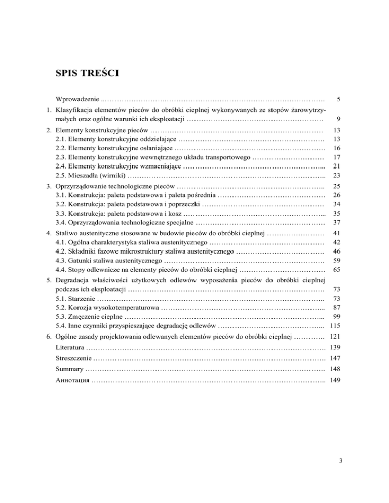 SPIS TREŚCI Wprowadzenie ..…………………….…………………………………………………………. 5 1. Klasyfikacja elementów pieców do obróbki cieplnej wykonywanych ze stopów żarowytrzymałych oraz ogólne warunki ich eksploatacji ………………………………………………… 9 2. Elementy konstrukcyjne pieców ……………………………………………………………… 2.1. Elementy konstrukcyjne oddzielające ……………………………………………………. 2.2. Elementy konstrukcyjne osłaniające ……………………………………………………… 2.3. Elementy konstrukcyjne wewnętrznego układu transportowego ………………………… 2.4. Elementy konstrukcyjne wzmacniające …………………………………………………... 2.5. Mieszadła (wirniki) ……………………………………………………………………….. 13 13 16 17 21 23 3. Oprzyrządowanie technologiczne pieców …………………………………………………….. 3.1. Konstrukcja: paleta podstawowa i paleta pośrednia ……………………………………… 3.2. Konstrukcja: paleta podstawowa i poprzeczki …………………………………………… 3.3. Konstrukcja: paleta podstawowa i kosz …………………………………………………... 3.4. Oprzyrządowania technologiczne specjalne ……………………………………………… 25 26 34 35 37 4. Staliwo austenityczne stosowane w budowie pieców do obróbki cieplnej …………………… 4.1. Ogólna charakterystyka staliwa austenitycznego ………………………………………… 4.2. Składniki fazowe mikrostruktury staliwa austenitycznego ………………………………. 4.3. Gatunki staliwa austenitycznego …………………………………………………………. 4.4. Stopy odlewnicze na elementy pieców do obróbki cieplnej ……………………………… 41 42 46 59 65 5. Degradacja właściwości użytkowych odlewów wyposażenia pieców do obróbki cieplnej podczas ich eksploatacji ………………………………………………………………………. 73 5.1. Starzenie ………………………………………………………………………………….. 73 5.2. Korozja wysokotemperaturowa …………………………………………………………... 87 5.3. Zmęczenie cieplne ………………………………………………………………………... 99 5.4. Inne czynniki przyspieszające degradację odlewów ……………………………………... 115 6. Ogólne zasady projektowania odlewanych elementów pieców do obróbki cieplnej …………. 121 Literatura ………………………………………………………………………………………. 139 Streszczenie ……………………………………………………………………………………. 147 Summary ………………………………………………………………………………………. 148 Аннотация …………………………………………………………………………………….. 149 3