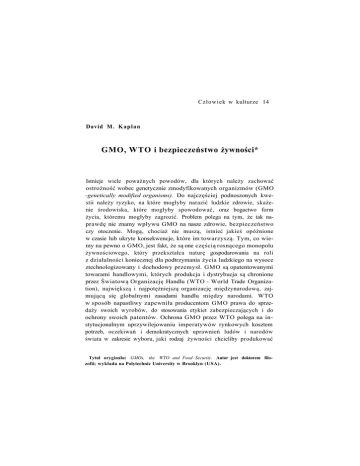 C z ł o w i e k w kulturze 14 David M. Kaplan GMO, WTO i bezpieczeństwo żywności* Istnieje wiele poważnych powodów, dla których należy zachować ostrożność wobec genetycznie zmodyfikowanych organizmów (GMO -genetically modified organisms). Do najczęściej podnoszonych kwe stii należy ryzyko, na które mogłyby narazić ludzkie zdrowie, skaże nie środowiska, które mogłyby spowodować, oraz bogactwo form życia, któremu mogłyby zagrozić. Problem polega na tym, że tak na prawdę nie znamy wpływu GMO na nasze zdrowie, bezpieczeństwo czy otoczenie. Mogą, chociaż nie muszą, istnieć jakieś opóźnione w czasie lub ukryte konsekwencje, które im towarzyszą. Tym, co wie my na pewno o GMO, jest fakt, że są one częścią rosnącego monopolu żywnościowego, który przekształca naturę gospodarowania na roli z działalności koniecznej dla podtrzymania życia ludzkiego na wysoce ztechnologizowany i dochodowy przemysł. GMO są opatentowanymi towarami handlowymi, których produkcja i dystrybucja są chronione przez Światową Organizację Handlu (WTO - World Trade Organiza tion), największą i najpotężniejszą organizację międzynarodową, zaj mującą się globalnymi zasadami handlu między narodami. WTO w sposób napastliwy zapewniła producentom GMO prawa do sprze daży swoich wyrobów, do stosowania etykiet zabezpieczających i do ochrony swoich patentów. Ochrona GMO przez WTO polega na in stytucjonalnym uprzywilejowaniu imperatywów rynkowych kosztem potrzeb, oczekiwań i demokratycznych uprawnień ludów i narodów świata w zakresie wyboru, jaki rodzaj żywności chcieliby produkować Tytuł oryginału: GMOs, the WTO and Food Security. Autor jest doktorem filo zofii; wykłada na Polytechnic University w Brooklyn (USA). 158 David M. Kaplan i konsumować. Istnieje zatem konflikt między podstawowym ludzkim prawem do bezpieczeństwa w wymiarze żywienia a prawami włas ności prywatnych przedsięwzięć - i dlatego te powinniśmy odrzucić. Po krótkim przeglądzie podstawowych zarzutów wobec GMO wyjaśnię relację między GMO i WTO, wskażę na mankamenty zbiorowej kontroli opatentowanej żywności oraz zaproponuję kilka sposobów działania, które możemy podjąć jako filozofowie i oby watele w celu odniesienia się do tych spraw. Po pierwsze, GMO narażają ludzkie zdrowie na ryzyko nie do przyjęcia. Siła tego argumentu tkwi w tym, że skoro nie ma jeszcze odpowiedzi na pytania o toksyczność GMO, o ich związek z reak cjami alergicznymi, odpornością antybiotyczną i czynnikami rako twórczymi, stąd ewentualne zagrożenie ludzkiego zdrowia jest na zbyt wielkie i dlatego lepiej jest zbłądzić ostrożnością, a uniknąć go zupełnie. Niedawny epizod, w którym poddana inżynierii gene tycznej (genetically engineered) kukurydza Starlink, uznana za nie nadającą się do konsumpcji przez człowieka, znalazła sposób, aby dotrzeć na półki w sklepach spożywczych, świadczy o prawdziwym niebezpieczeństwie, na jakie genetycznie przerobiona żywność nara ża społeczeństwo. Dopóki producenci nie zagwarantują bezpieczeń stwa i instytucjonalnych procedur dla utrzymania niebezpiecznych produktów z dala od naszej żywności, dopóty GMO powinny być rozpatrywane jako możliwe zagrożenie ludzkiego zdrowia. Drugi zestaw argumentów dowodzi, że poddane genetycznej ob róbce zbiory rolne stanowią wyjątkową groźbę genetycznego skaże nia. Prawdziwe niebezpieczeństwo, co już zostało dowiedzione, po lega na tym, że GMO rozprzestrzenia się w glebie oraz w innych formach życia roślinnego i zwierzęcego, powodując nieodwracalne zanieczyszczenie genetyczne. Na przykład uzyskane drogą inżynierii genetycznej jałowe nasiona - tzw. terminator seeds - mogłyby zmieszać się z innym życiem roślinnym, sterylizując nie tylko kuku rydzę i soję; wygenerowane w podobny sposób pestycydy często zabijają nie tylko owady, które stanowiły cel ich użycia, powodując tym samym reakcję łańcuchową nie zamierzonych skutków; rośliny uprawne odporne na środki chwastobójcze już weszły w kontakt z właściwymi sobie gatunkami chwastów, w których z kolei podnosi GMO, W T O i bezpieczeństwo żywności 159 się odporność na pestycydy, przez co wymykają się spod kontroli. Istnieje również możliwość stworzenia nowych wirusów, jako że geny roślin odpornych na wirusy przeszły na inne rośliny. A jeśli adwokaci genetycznie spreparowanej żywności mają rację i mogliby udowodnić, że żywność taka nie naraża ludzkiego zdrowia na żadne ryzyko, które byłoby nie do przyjęcia? Co by było, gdyby poddana inżynierii genetycznej żywność była udoskonalona i stwo rzona w taki sposób, że stałaby się tak bezpieczna jak naturalne pożywienie? Jednakże pod adresem samej biotechnologii wytoczono jeszcze silniejszy argument, który wskazał, że gdyby nawet zaistniał konsensus w sprawie bezpieczeństwa takiej żywności, to i tak ciągle istnieć będzie poważny powód, aby się jej przeciwstawiać. Argu ment ten czerpie siłę z faktu, iż kwestię zdrowia i jego zagrożeń usuwa się z rąk społeczności, a wkłada w ręce uczonych. Kiedy debata nad polityką zostaje przekazana ekspertom, wówczas oby watele nie są w stanie uczestniczyć w procesie podejmowania decy zji, od której zależy ogólny dobrobyt. Nie umiem powiedzieć, czyje twierdzenia są prawdziwe - obrońców biotechnologii czy jej prze ciwników. Chociaż bardziej ufam twierdzeniom sformułowanym przez uczonych, stojących po stronie interesu społecznego niż prze mysłowego, to ciągle jestem zmuszony liczyć się z prowadzoną przez innych pracą badawczą, która kwestionuje GMO. Jeden z po ważniejszych argumentów pokazał, że nawet gdyby GMO można było uczynić bezpiecznymi do spożycia i bezpiecznymi do uprawy, to i tak istniałaby poważna przyczyna, aby się im przeciwstawiać. Według mnie podstawą takiego argumentu jest związek międz