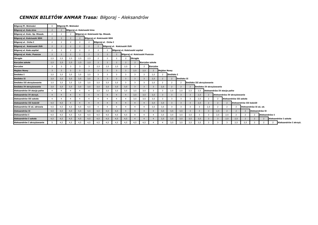 CENNIK BILETÓW ANMAR Trasa: Biłgoraj - Aleksandrów Biłgoraj Pl. Wolności 0 Biłgoraj ul. Kośc.kino 2 Biłgoraj Pl. Wolności 2 Biłgoraj ul. Kośc. Sp. Mieszk. 2 2 2 Biłgoraj ul. Kościuszki SDH 2 2 2 2 Biłgoraj ul. Cicha I 2 2 2 2 2 Biłgoraj ul. Kościuszki ZUS 2 2 2 2 2 2 Biłgoraj ul. Kośc.szpital 2 2 2 2 2 2 2 Biłgoraj ul. Kośc. Puszcza 2 2 2 2 2 2 2 2 Okrągłe 2,5 2,5 2,5 2,5 2,5 2 2 2 Korczów szkoła Biłgoraj ul. Kościuszki kino Biłgoraj ul. Kościuszki Sp. Mieszk. Biłgoraj ul. Kościuszki SDH Biłgoraj ul. Cicha I Biłgoraj ul. Kościuszki ZUS Biłgoraj ul. Kościuszki szpital Biłgoraj ul. Kościuszki Puszcza 2 Okrągłe 2,5 2,5 2,5 2,5 2,5 2 2 2 2 2 Korczów 3 3 3 3 3 2,5 2,5 2,5 2,5 2 Korczów szkoła 2 Korczów Majdan Nowy 3 3 3 3 3 3 3 3 3 2,5 2,5 2 Smólsko I 3,5 3,5 3,5 3,5 3,5 3 3 3 3 3 3 2,5 2 Smólsko II 3,5 3,5 3,5 3,5 3,5 3 3 3 3 3 3 2,5 2 2 Smólsko III skrzyżowanie 3,5 3,5 3,5 3,5 3,5 3,5 3,5 3,5 3 3 3 2,5 2 2 2 Smólsko IV skrzyżowanie 3,5 3,5 3,5 3,5 3,5 3,5 3,5 3,5 3,5 3 3 3 2,5 2 2 2 Aleksandrów IV stacja paliw 4 4 4 4 4 3,5 3,5 3,5 3,5 3,5 3,5 3 3 2,5 2,5 2,5 2,5 Aleksandrów IV skrzyż. 4 4 4 4 4 4 4 4 4 3,5 3,5 3,5 3 3 3 3 2,5 2 Majdan Nowy Smólsko I Smólsko II Smólsko III skrzyżowanie Smólsko IV skrzyżowanie Aleksandrów IV stacja paliw Aleksandrów IV skrzyżowanie Aleksandrów III szkoła 4 4 4 4 4 4 4 4 4 3,5 3,5 3,5 3 3 3 3 2,5 2 2 Aleksandrów III kościół 4,5 4,5 4 4 4 4 4 4 4 4 4 3,5 3,5 3 3 3 2,5 2 2 2 Aleksandrów II oś. zdrowia 4,5 4,5 4,5 4,5 4,5 4 4 4 4 4 4 3,5 3,5 3 3 3 3 2,5 2 2 2 Aleksandrów II 4,5 4,5 4,5 4,5 4,5 4,5 4,5 4,5 4 4 4 4 3,5 3,5 3,5 3 3 3 2,5 2 2 2 Aleksandrów I 4,5 4,5 4,5 4,5 4,5 4,5 4,5 4,5 4,5 4 4 4 3,5 3,5 3,5 3,5 3 3 2,5 2,5 2 2 2 Aleksandrów I szkoła 4,5 4,5 4,5 4,5 4,5 4,5 4,5 4,5 4,5 4 4 4 3,5 3,5 3,5 3,5 3,5 3 3 2,5 2,5 2 2 2 5 4,5 4,5 4,5 4,5 4,5 4,5 4,5 4,5 4,5 4,5 4 4 3,5 3,5 3,5 3,5 3 3 3 2,5 2,5 2 2 Aleksandrów I skrzyżowanie Aleksandrów III szkoła Aleksandrów III kościół Aleksandrów II oś. zd. Aleksandrów II Aleksandrów I Aleksandrów I szkoła 2 Aleksandrów I skrzyż.