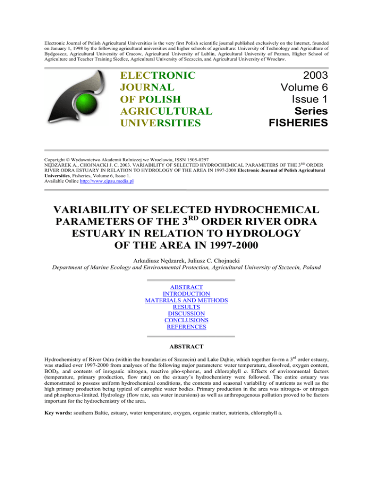Electronic Journal of Polish Agricultural Universities is the very first Polish scientific journal published exclusively on the Internet, founded on January 1, 1998 by the following agricultural universities and higher schools of agriculture: University of Technology and Agriculture of Bydgoszcz, Agricultural University of Cracow, Agricultural University of Lublin, Agricultural University of Poznan, Higher School of Agriculture and Teacher Training Siedlce, Agricultural University of Szczecin, and Agricultural University of Wroclaw. ELECTRONIC JOURNAL OF POLISH AGRICULTURAL UNIVERSITIES 2003 Volume 6 Issue 1 Series FISHERIES Copyright © Wydawnictwo Akademii Rolniczej we Wroclawiu, ISSN 1505-0297 NĘDZAREK A., CHOJNACKI J. C. 2003. VARIABILITY OF SELECTED HYDROCHEMICAL PARAMETERS OF THE 3RD ORDER RIVER ODRA ESTUARY IN RELATION TO HYDROLOGY OF THE AREA IN 1997-2000 Electronic Journal of Polish Agricultural Universities, Fisheries, Volume 6, Issue 1. Available Online http://www.ejpau.media.pl VARIABILITY OF SELECTED HYDROCHEMICAL PARAMETERS OF THE 3RD ORDER RIVER ODRA ESTUARY IN RELATION TO HYDROLOGY OF THE AREA IN 1997-2000 Arkadiusz Nędzarek, Juliusz C. Chojnacki Department of Marine Ecology and Environmental Protection, Agricultural University of Szczecin, Poland ABSTRACT INTRODUCTION MATERIALS AND METHODS RESULTS DISCUSSION CONCLUSIONS REFERENCES ABSTRACT Hydrochemistry of River Odra (within the boundaries of Szczecin) and Lake Dąbie, which together fo-rm a 3rd order estuary, was studied over 1997-2000 from analyses of the following major parameters: water temperature, dissolved, oxygen content, BOD5, and contents of inroganic nitrogen, reactive pho-sphorus, and chlorophyll a. Effects of environmental factors (temperature, primary production, flow rate) on the estuary’s hydrochemistry were followed. The entire estuary was demonstrated to possess uniform hydrochemical conditions, the contents and seasonal variability of nutrients as well as the high primary production being typical of eutrophic water bodies. Primary production in the area was nitrogen- or nitrogen and phosphorus-limited. Hydrology (flow rate, sea water incursions) as well as anthropogenous pollution proved to be factors important for the hydrochemistry of the area. Key words: southern Baltic, estuary, water temperature, oxygen, organic matter, nutrients, chlorophyll a. INTRODUCTION Inland waters are very susceptible to degradation and contribute substantially to pollution of the oceans. Particularly prevalent is organic and nutrient enrichment of inshore areas [18]. Estuaries, as regions of mixing of fresh and marine water, are characterised by intensified mass transfer and have a high potential for selfpurification [13]. Although the literature concerning estuaries and coastal areas and processes affecting them is ample, references pertaining to the River Odra estuary (particularly with respect to the Odra and Lake Dąbie within the boundaries of Szczecin) are scarce [17]. Hydrography of the Odra estuary, far from a typical one with its specific water dynamics, as well as the hydrochemistry modified by human activities, creates dynamic environmental conditions, decisive for the high biodiversity of the area [2]. The present work is aimed at exploring interactions between water dynamics, thermal regime, and chemical variables (nutrient contents) that shape aquatic system productivity, as defined by the organic matter enrichment. The outcome of the study should contribute to a better understanding of phenomena taking place in water bodies subjected to excessive anthropogenous pressure. Study area The terminal section of River Odra forms a typical southern Baltic estuary [13] and – following Majewski [14] – can be divided into the following parts: • • • the Pomeranian Bay, a 1st order estuary in which the effects of marine Baltic waters play the major role; the Szczecin Lagoon, a 2nd order estuary, characterised by mixed water of marine and riverine origin, the latter – supplied by River Odra – dominating the chemical regime; River Odra mouth opening to the Szczecin Lagoon along with Lake Dąbie and the stretch of the Odra, within the boundaries of Szczecin, that form two branches (western, called Odra Zachodnia, and eastern, called Odra Wschodnia), a 3rd order estuary with chemistry typical of inland waters, partly affected by sea water incursions and fed also by mixed water from the Szczecin Lagoon. The Odra mouth area has a very specific, complex water dynamics, the complexity resulting from interplay between inflows from the catchment area, direct and indirect wind effects, ice cover, atmospheric pressure, and human activities [1]. The Odra mouth area is an intricate hydrographic system, formed by two branches of the river, numerous canals connecting them, water-logged islands, and the flow-through Lake Dąbie. This complexity makes it difficult to estimate the true magnitude of flow. As showed by Mikulski [16] and Majewski [14], Odra Wschodnia carries an annual average of 76% of the water, Odra Zachodnia transporting as little as 24%. Odra Wschodnia feeds Odra Zachodnia through Skośnica Canal, discharging about 20% of the water, while Odra Zachodnia feeds the Regalica via the Parnica; hence it is estimated that about 80-82% of the total Odra water is discharged into Lake Dąbie via the Regalica. When estimating the magnitude of flow, reference is usually made to measurements taken at Gozdowice (kilometre 645.3) [1]. Table 1 shows average monthly flow rates during the period of study. Average flow rates, as measured in 1997-2000, i.e., during the study reported on in this work, are shown in Table 2. Table 1. Average monthly flow rates (m3.s-1) at Gozdowice on the Odra (km 645.3) in 1997-1999 [10] 1997 1998 1999 11 643 490 787 12 533 635 691 1 362 830 738 2 494 736 823 Month of the hydrological year 3 4 5 6 632 541 510 411 892 822 516 363 1350 929 748 525 7 1320 351 696 8 1510 323 359 9 588 367 276 1