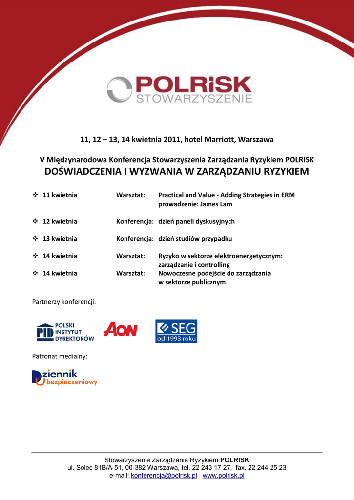 11, 12 – 13, 14 kwietnia 2011, hotel Marriott, Warszawa V Międzynarodowa Konferencja Stowarzyszenia Zarządzania Ryzykiem POLRISK DOŚWIADCZENIA I WYZWANIA W ZARZĄDZANIU RYZYKIEM 11 kwietnia Warsztat: 12 kwietnia Konferencja: dzieo paneli dyskusyjnych 13 kwietnia Konferencja: dzieo studiów przypadku 14 kwietnia Warsztat: 14 kwietnia Warsztat: Practical and Value - Adding Strategies in ERM prowadzenie: James Lam Ryzyko w sektorze elektroenergetycznym: zarządzanie i controlling Nowoczesne podejście do zarządzania w sektorze publicznym Partnerzy konferencji: Patronat medialny: Stowarzyszenie Zarządzania Ryzykiem POLRISK ul. Solec 81B/A-51, 00-382 Warszawa, tel. 22 243 17 27, fax. 22 244 25 23 e-mail: [email protected] www.polrisk.pl 11 kwietnia 2011, hotel Marriott, Warszawa James Lam: Practical and Value - Adding Strategies in ERM WORKSHOP AGENDA 10.00 – 11.15 JAMES LAM ERM and Corporate Governance Key ERM trends and requirements Empirical and best-practice research on ERM benefits Establishing an ERM framework Role of the board in ERM Role of the chief risk officer (CRO) ERM policy and risk tolerance levels 11.15 – 11.30 coffee break 11.30 – 13.00 Risk Analytics (including case studies and numerical examples) Uses and pitfalls of value-at-risk (VaR) Economic capital allocation for all key risks Calculating the total cost of risk Value-based performance measurement (RORAC and net income after capital charge vs. IRR and NPV) Risk-adjusted pricing, risk transfer, and other practical business applications 13.00 – 14.00 Lunch 14.00 – 15.15 Risk Management Strategies (including real-world case studies) Strategic risk management Market risk management Credit risk management Liquidity risk management Operational risk management 15.15 – 15.30 Coffee break 15.30 – 17.00 Risk Assurance and Reporting Processes Developing effective key risk indicators Integrating KPIs and KRIs as part of integrated performance reporting Dashboard reporting for the board and management (including a prototype demo) Establishing feedback loops on ERM effectiveness Risk-adjusted incentive compensation President, James Lam & Associates, author of „Enterprise Risk Management: From Incentives to Controls” ranked #1 Best Seller Among 25,000 Risk Management Titles on Amazon.com. James Lam has over twenty years of experience in risk and business management. He is widely noted as the first ever “chief risk officer” and an early advocate of enterprise risk management. His work has been profiled as best practice in case studies published by The Economist, Price Waterhouse Review, and Risk Magazine. In 1997, Mr. Lam received the inaugural Financial Risk Manager of the Year Award from the Global Association of Risk Professionals. For two years in a row (2005 and 2006), Treasury & Risk Management magazine named him one of the “100 Most Influential People in Finance”. He is a member of the Blue Ribbon Panel of PRMIA, and has worked with the IIA, RMA, SOA, and other professional associations. Mr. Lam appears on national TV and cable news programs. He has been published extensively, with over 50 articles and book chapters currently to his credit. Mr. Lam is a contributing author of numerous books, including “Modern Risk Management: A History” (with Nobel Prize winners Markowitz, Modigliani, Samuelson, and others) and “Derivatives Handbook” (with Alan Greenspan, Merton Miller, and others). He has been quoted in the Wall Street Journal, Financial Times, Risk Magazine, CFO Magazine, and American Banker. Mr. Lam graduated summa cum laude with a BBA from Baruch College (1983), and has an MBA with honors from UCLA (1989). He was appointed a senior research fellow at Beijing University in 2004. Mr. Lam has lectured at Harvard Business School. Founded in January 2002, James Lam & Associates (JLA) is singularly focused on risk management, and provides consulting and training solutions. JLA has been selected to serve on important risk management engagements by leading institutions, including Bank of China, Citigroup, the Federal Reserve, First Data, GMAC, United HealthGroup, and the World Bank. In a 2005 Euromoney survey, Mr. Lam was nominated by clients and peers as one of the leading risk consultants in the world cały warsztat będzie symultanicznie tłumaczony na j. polski Stowarzyszenie Zarządzania Ryzykiem POLRISK ul. Solec 81B/A-51, 00-382 Warszawa, tel. 22 243 17 27, fax. 22 244 25 23 e-mail: [email protected] www.polrisk.pl 12 – 13 kwietnia 2011 r., hotel Marriott, Warszawa V Międzynarodowa Konferencja Stowarzyszenia Zarządzania Ryzykiem POLRISK DOŚWIADCZENIA I WYZWANIA W ZARZĄDZANIU RYZYKIEM 12 kwietnia (wtorek) - DZIEO PANELI DYSKUSYJNYCH 9.00 – 10.00 Otwarcie konferencji Tomasz Miazek, prezes Stowarzyszenia Zarządzania Ryzykiem POLRISK dr Sławomir Pijanowski, wiceprezes POLRISK, przewodniczący konferencji Keynote: 10.00 – 11.15 Panel I: Prowadzenie Paneliści: Enterprise risk management in the new age of uncertainty James Lam Zarządzanie ryzykiem w dobie niepewności dr Sławomir Pijanowski, wiceprezes POLRISK dr Wiesław Rozłucki, przewodniczący Rady Programowej PID (pozostali paneliści w trakcie potwierdzania) 11.15 – 11.30 przerwa na kawę 11.30 – 13.00 Panel II: Zarządzanie ryzykiem – doświadczenia organizacji branżowych Prowadzenie: Andrzej S. Nartowski prezes Polskiego Instytutu Dyrektorów Paneliści: dr Sławomir Pijanowski, wiceprezes POLRISK, dr Mirosław Kachniewski, wiceprezes Zarządu SEG, Ilona Weiss, prezydent ACCA Poland, IIA przedstawiciele PRMIA, 13.00 – 14.00 przerwa na obiad 14.00 – 15.30 Panel III: Implementacja 8. Dyrektywy EU Prowadzenie: Paul Taylor, FERMA Paneliści: Tomasz Miazek, prezes POLRISK Pozostali paneliści w trakcie potwierdzania) 15.30 – 15.45 przerwa na kawę 15.45 – 17.00 Panel IV: Wpływ Solvency II na korporacyjnego nabywcę ubezpieczeo: cena, wymagania i limity, pojemnośd rynku Prowadzenie: Tomasz Miazek, prezes POL