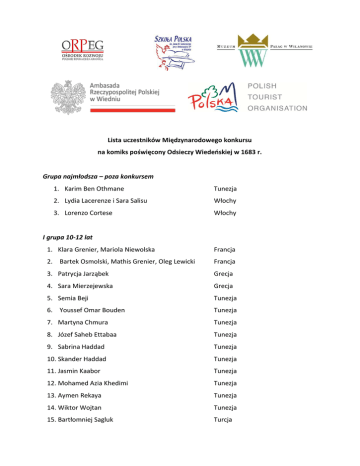 Lista uczestników Międzynarodowego konkursu na komiks poświęcony Odsieczy Wiedeńskiej w 1683 r. Grupa najmłodsza – poza konkursem 1. Karim Ben Othmane Tunezja 2. Lydia Lacerenze i Sara Salisu Włochy 3. Lorenzo Cortese Włochy I grupa 10-12 lat 1. Klara Grenier, Mariola Niewolska Francja 2. Bartek Osmolski, Mathis Grenier, Oleg Lewicki Francja 3. Patrycja Jarząbek Grecja 4. Sara Mierzejewska Grecja 5. Semia Beji Tunezja 6. Youssef Omar Bouden Tunezja 7. Martyna Chmura Tunezja 8. Józef Saheb Ettabaa Tunezja 9. Sabrina Haddad Tunezja 10. Skander Haddad Tunezja 11. Jasmin Kaabor Tunezja 12. Mohamed Azia Khedimi Tunezja 13. Aymen Rekaya Tunezja 14. Wiktor Wojtan Tunezja 15. Bartłomniej Sagluk Turcja 16. Aleksander Kokosiński, Julia Hasuk Włochy 17. Luca Moccia Włochy 18. Joanna Broś Austria 19. Łukasz Chomin Austria 20. Adriana Cymbałko Austria 21. Patryk Dudek Austria 22. Aleksander Esman Austria 23. Wiktoria Fitak Austria 24. Jakub Irytowski Austria 25. Wiktoria Jagiełło Austria 26. Julia Kielmas Austria 27. Sebastian Książek Austria 28. Maja Kudłak Austria 29. Paweł Kusiak, Sebastian Stachurski Austria 30. Filip Łukasik Austria 31. Jakub Mazur Austria 32. Daniel Raharinairo Austria 33. Caroline Sikora, Lidia Potoniec Austria 34. Sebastian Sokal Austria 35. Laura Staszkiewicz Austria 36. Marta Wójcik Austria 37. Victoria Vollnhofer Austria 38. Hubert Zabawa Austria 39. Wiktoria Zapalska Austria II grupa 13-15 lat 1. Radosława Żelewa Bułgaria 2. Nadia Ghodhbani Tunezja 3. Ahmed Harrabi Tunezja 4. Marika Skrzypczyńska Tunezja 5. Adelia Walko Szwecja 6. Aleksandra Kijek Austria 7. Jakub Kuliga Austria 8. Sebastian Kutaj Austria 9. Karoline Matuszczyk, Sandra Motyl Austria III grupa 16-19 lat 1. Amel Harzallah Tunezja 2. Ilyes Oneslati Tunezja 3. Viktoria Skowron Austria 4. Justyna Stańko Austria
