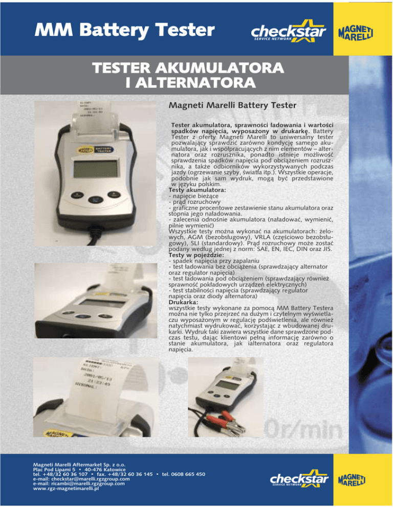 MM Battery Tester TESTER AKUMULATORA I ALTERNATORA Magneti Marelli Battery Tester Tester akumulatora, sprawności ładowania i wartości spadków napięcia, wyposaŜony w drukarkę. Battery Tester z oferty Magneti Marelli to uniwersalny tester pozwalający sprawdzić zarówno kondycję samego akumulatora, jak i współpracujących z nim elementów – alternatora oraz rozrusznika, ponadto istnieje moŜliwość sprawdzenia spadków napięcia pod obciąŜeniem rozrusznika, a takŜe odbiorników wykorzystywanych podczas jazdy (ogrzewanie szyby, światła itp.). Wszystkie operacje, podobnie jak sam wydruk, mogą być przedstawione w języku polskim. Testy akumulatora: - napięcie bieŜące - prąd rozruchowy - graficzne procentowe zestawienie stanu akumulatora oraz stopnia jego naładowania. - zalecenia odnośnie akumulatora (naładować, wymienić, pilnie wymienić) Wszystkie testy moŜna wykonać na akumulatorach: Ŝelowych, AGM (bezobsługowy), VRLA (częściowo bezobsługowy), SLI (standardowy). Prąd rozruchowy moŜe zostać podany według jednej z norm: SAE, EN, IEC, DIN oraz JIS. Testy w pojeździe: - spadek napięcia przy zapalaniu - test ładowania bez obciąŜenia (sprawdzający alternator oraz regulator napięcia) - test ładowania pod obciąŜeniem (sprawdzający równieŜ sprawność pokładowych urządzeń elektrycznych) - test stabilności napięcia (sprawdzający regulator napięcia oraz diody alternatora) Drukarka: wszystkie testy wykonane za pomocą MM Battery Testera moŜna nie tylko przejrzeć na duŜym i czytelnym wyświetlaczu wyposaŜonym w regulację podświetlenia, ale równieŜ natychmiast wydrukować, korzystając z wbudowanej drukarki. Wydruk taki zawiera wszystkie dane sprawdzone podczas testu, dając klientowi pełną informację zarówno o stanie akumulatora, jak ialternatora oraz regulatora napięcia. Magneti Marelli Aftermarket Sp. z o.o. Plac Pod Lipami 5 • 40-476 Katowice tel. +48/32 60 36 107 • fax. +48/32 60 36 145 • tel. 0608 665 450 e-mail: [email protected] e-mail: [email protected] www.rgz-magnetimarelli.pl MM Battery Tester TESTER AKUMULATORA I ALTERNATORA 1 2 3 MM Battery Tester to urządzenie wyjątkowo proste w obsłudze i przyjazne uŜytkownikowi. Wszelkie dostępne badania wykonuje się krok po kroku, według instrukcji podawanych przez tester. Test akumulatora: Po podłączeniu zacisków MM Battery Tester włącza się samoczynnie. Na ekranie pojawia się pytanie o rodzaj testu (akumulatora lub systemów w samochodzie), po wyborze testu akumulatora, naleŜy określić rodzaj diagnozowanej baterii (Ŝelowa, AGM, VRLA, standardowa). Następnie pada pytanie o deklarowany prąd rozruchowy oraz normę, według której jest podany. Po uzupełnieniu tych informacji MM Battery Tester przechodzi do testu, po którym pada pytanie o wydruk (moŜliwe jest wydrukowanie wyników lub pominięcie tego etapu). Test systemu: Po wybraniu testu systemu MM Battery Tester podaje niezbędne czynności, krok po kroku: - wyłączyć wszelkie obciąŜenia, uruchomić silnik – sprawdzenie spadków napięcia podczas uruchamiania pojazdu, po rozruchu tester informuje o wartości napięcia oraz o jej zgodności z normą; - wcisnąć enter dla testu ładowania – MM Battery Tester sprawdza napięcie w układzie podczas normalnej pracy silnika, bez obciąŜeń; - włączyć urządzenia obciąŜające instalację – sprawdzenie wydajności alternatora oraz włączonych urządzeń (w przypadku nieprawidłowości napięcie moŜe spaść poniŜej akceptowalnego poziomu). W międzyczasie MM Battery Tester sprawdza stabilność napięcia podczas całego testu, podając informację o skuteczności działania diod alternatora. Wyniki testu systemu równieŜ moŜna wydrukować. Zdjęcie 1: kompletny zestaw MM Battery Tester zawiera wszystko, co niezbędne do pracy, opakowane w trwałą i estetyczną walizkę; Zdjęcie 2: solidne i trwałe zaciski „krokodylki” oraz masywna obudowa zapewniają wieloletnie niezawodne uŜytkowanie; Zdjęcie 3: duŜy dwuwierszowy wyświetlacz z regulacją podświetlenia jest czytelny w kaŜdych warunkach; Zdjęcie 4: szybka i łatwo dostępna drukarka pozwala zachować i przekazać klientowi wynik kaŜdego testu. 4 Magneti Marelli Aftermarket Sp. z o.o. Plac Pod Lipami 5 • 40-476 Katowice tel. +48/32 60 36 107 • fax. +48/32 60 36 145 • tel. 0608 665 450 e-mail: [email protected] e-mail: [email protected] www.rgz-magnetimarelli.pl