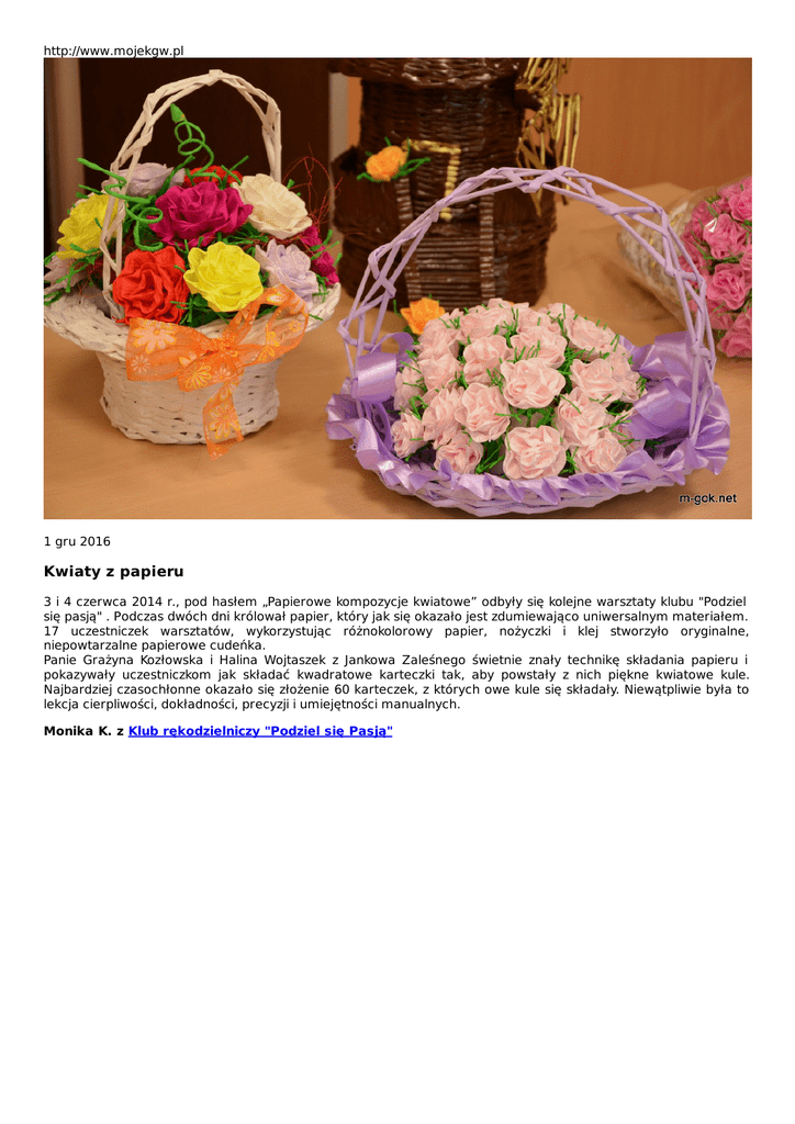 http://www.mojekgw.pl 1 gru 2016 Kwiaty z papieru 3 i 4 czerwca 2014 r., pod hasłem „Papierowe kompozycje kwiatowe” odbyły się kolejne warsztaty klubu "Podziel się pasją" . Podczas dwóch dni królował papier, który jak się okazało jest zdumiewająco uniwersalnym materiałem. 17 uczestniczek warsztatów, wykorzystując różnokolorowy papier, nożyczki i klej stworzyło oryginalne, niepowtarzalne papierowe cudeńka. Panie Grażyna Kozłowska i Halina Wojtaszek z Jankowa Zaleśnego świetnie znały technikę składania papieru i pokazywały uczestniczkom jak składać kwadratowe karteczki tak, aby powstały z nich piękne kwiatowe kule. Najbardziej czasochłonne okazało się złożenie 60 karteczek, z których owe kule się składały. Niewątpliwie była to lekcja cierpliwości, dokładności, precyzji i umiejętności manualnych. Monika K. z Klub rękodzielniczy "Podziel się Pasją"