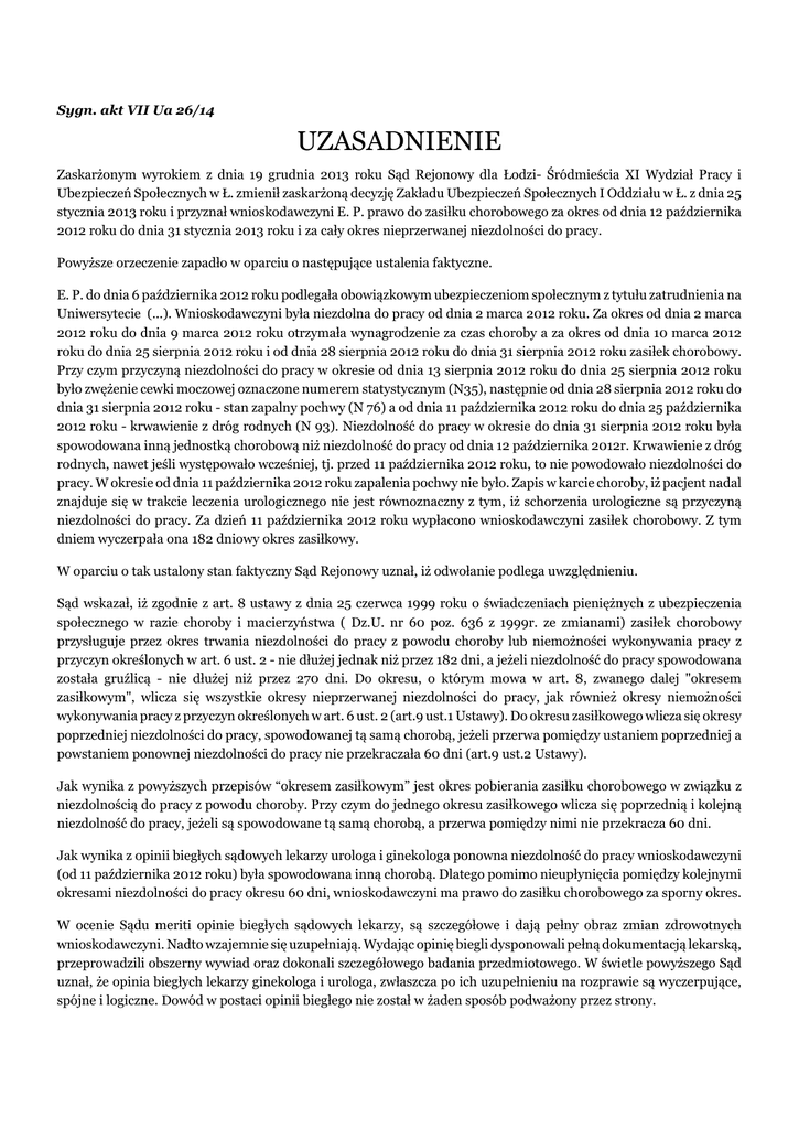 Sygn. akt VII Ua 26/14 UZASADNIENIE Zaskarżonym wyrokiem z dnia 19 grudnia 2013 roku Sąd Rejonowy dla Łodzi- Śródmieścia XI Wydział Pracy i Ubezpieczeń Społecznych w Ł. zmienił zaskarżoną decyzję Zakładu Ubezpieczeń Społecznych I Oddziału w Ł. z dnia 25 stycznia 2013 roku i przyznał wnioskodawczyni E. P. prawo do zasiłku chorobowego za okres od dnia 12 października 2012 roku do dnia 31 stycznia 2013 roku i za cały okres nieprzerwanej niezdolności do pracy. Powyższe orzeczenie zapadło w oparciu o następujące ustalenia faktyczne. E. P. do dnia 6 października 2012 roku podlegała obowiązkowym ubezpieczeniom społecznym z tytułu zatrudnienia na Uniwersytecie (...). Wnioskodawczyni była niezdolna do pracy od dnia 2 marca 2012 roku. Za okres od dnia 2 marca 2012 roku do dnia 9 marca 2012 roku otrzymała wynagrodzenie za czas choroby a za okres od dnia 10 marca 2012 roku do dnia 25 sierpnia 2012 roku i od dnia 28 sierpnia 2012 roku do dnia 31 sierpnia 2012 roku zasiłek chorobowy. Przy czym przyczyną niezdolności do pracy w okresie od dnia 13 sierpnia 2012 roku do dnia 25 sierpnia 2012 roku było zwężenie cewki moczowej oznaczone numerem statystycznym (N35), następnie od dnia 28 sierpnia 2012 roku do dnia 31 sierpnia 2012 roku - stan zapalny pochwy (N 76) a od dnia 11 października 2012 roku do dnia 25 października 2012 roku - krwawienie z dróg rodnych (N 93). Niezdolność do pracy w okresie do dnia 31 sierpnia 2012 roku była spowodowana inną jednostką chorobową niż niezdolność do pracy od dnia 12 października 2012r. Krwawienie z dróg rodnych, nawet jeśli występowało wcześniej, tj. przed 11 października 2012 roku, to nie powodowało niezdolności do pracy. W okresie od dnia 11 października 2012 roku zapalenia pochwy nie było. Zapis w karcie choroby, iż pacjent nadal znajduje się w trakcie leczenia urologicznego nie jest równoznaczny z tym, iż schorzenia urologiczne są przyczyną niezdolności do pracy. Za dzień 11 października 2012 roku wypłacono wnioskodawczyni zasiłek chorobowy. Z tym dniem wyczerpała ona 182 dniowy okres zasiłkowy. W oparciu o tak ustalony stan faktyczny Sąd Rejonowy uznał, iż odwołanie podlega uwzględnieniu. Sąd wskazał, iż zgodnie z art. 8 ustawy z dnia 25 czerwca 1999 roku o świadczeniach pieniężnych z ubezpieczenia społecznego w razie choroby i macierzyństwa ( Dz.U. nr 60 poz. 636 z 1999r. ze zmianami) zasiłek chorobowy przysługuje przez okres trwania niezdolności do pracy z powodu choroby lub niemożności wykonywania pracy z przyczyn określonych w art. 6 ust. 2 - nie dłużej jednak niż przez 182 dni, a jeżeli niezdolność do pracy spowodowana została gruźlicą - nie dłużej niż przez 270 dni. Do okresu, o którym mowa w art. 8, zwanego dalej "okresem zasiłkowym", wlicza się wszystkie okresy nieprzerwanej niezdolności do pracy, jak również okresy niemożności wykonywania pracy z przyczyn określonych w art. 6 ust. 2 (art.9 ust.1 Ustawy). Do okresu zasiłkowego wlicza się okresy poprzedniej niezdolności do pracy, spowodowanej tą samą chorobą, jeżeli przerwa pomiędzy ustaniem poprzedniej a powstaniem ponownej niezdolności do pracy nie przekraczała 60 dni (art.9 ust.2 Ustawy). Jak wynika z powyższych przepisów “okresem zasiłkowym” jest okres pobierania zasiłku chorobowego w związku z niezdolnością do pracy z powodu choroby. Przy czym do jednego okresu zasiłkowego wlicza się poprzednią i kolejną niezdolność do pracy, jeżeli są spowodowane tą samą chorobą, a przerwa pomiędzy nimi nie przekracza 60 dni. Jak wynika z opinii biegłych sądowych lekarzy urologa i ginekologa ponowna niezdolność do pracy wnioskodawczyni (od 11 października 2012 roku) była spowodowana inną chorobą. Dlatego pomimo nieupłynięcia pomiędzy kolejnymi okresami niezdolności do pracy okresu 60 dni, wnioskodawczyni ma prawo do zasiłku chorobowego za sporny okres. W ocenie Sądu meriti opinie biegłych sądowych lekarzy, są szczegółowe i dają pełny obraz zmian zdrowotnych wnioskodawczyni. Nadto wzajemnie się uzupełniają. Wydając opinię biegli dysponowali pełną dokumentacją lekarską, przeprowadzili obszerny wywiad oraz dokonali szczegółowego badania przedmiotowego. W świetle powyższego Sąd uznał, że opinia biegłych lekarzy ginekologa i urologa, zwłaszcza po ich uzupełnieniu na rozprawie są wyczerpujące, spójne i logiczne. Dowód w postaci opinii biegłego nie został w żaden sposób podważony przez strony. Sąd nie znalazł podstaw do powoływania kolejnych biegłych, albowiem nie wniosłoby to do sprawy już niczego nowego. W świetle art. 286 k.p.c. Sąd ma obowiązek dopuszczenia dowodu z dalszych biegłych lub z opinii instytutu, gdy zachodzi tego potrzeba, a więc wówczas, gdy opinia złożona już do sprawy zawiera istotne braki, względnie też nie wyjaśnia istotnych okoliczności. Ponieważ opinie biegłych są rzetelne, a wynikające z niej wnioski logiczne i prawidłowo uzasadnione, a nadto opinie te nie zawierają braków i wyjaśniają wszystkie okoliczności istotne dla rozstrzygnięcia sprawy, Sąd oddalił wniosek pozwanego o dopuszczenie dowodu z opinii kolejnych biegłych tych samych specjalności. Okoliczność, że opinie biegłych nie mają treści odpowiadającej stronie odwołującej się nie może mieć w tym wypadku znaczenia. Odmienne stanowisko oznaczałoby bowiem przyjęcie, że należy przeprowadzić dowód z wszelkich możliwych biegłych, by się upewnić, czy niektórzy z nich nie byliby takiego zdania, jak strona. Zgodnie z utrwalonym orzecznictwem SN potrzeba powołania innego biegłego powinna wynikać z okoliczności sprawy, a nie z samego niezadowolenia strony z dotychczas złożonej opinii. Niezadowolenie strony z opinii biegłego nie uzasadnia powołania innego biegłego. Mając powyższe na uwadze na podstawie art. 47714 § 2 k.p.c. Sąd orzekł, jak w sentencji wyroku. Od powyższego wyroku apelację 