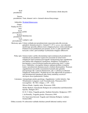 Kod przedmiotu: Kod Erasmus: (brak danych) Nazwa przedmiotu: Teatr, dramat i mit w Atenach okresu klasycznego. Jednostka: Wydział Historyczny Grupy: Punkty ECTS i inne: Język polski prowadzenia: Rodzaj fakultatywne przedmiotu: Tryb wykład w sali prowadzenia: Skrócony opis: Celem wykładu jest przedstawienie znaczenia mitu dla rozwoju gatunków dramatycznych w Atenach V i IV w. p.n.e. oraz ukazanie możliwego sposobu odbioru treści religijnych przez widza teatralnego. Podstawowym problemem jest pytanie, na ile i w jaki sposób teatr korzysta z mitu i jak kształtuje wyobrażenia religijne odbiorców. Pełny opis: Geneza teatru i próba rekonstrukcji najwcześniejszych przedstawień teatralnych jest punktem wyjścia do rozważań na temat treści religijnych najwcześniejszych tragedii. Kontynuacją tego zagadnienia jest analiza idei religijnych Ajschylosa, Sofoklesa i Eurypidesa w powiązaniu z rzeczywistością społeczno-polityczną Aten V wieku p.n.e. Oddzielne i szczególne miejsce zajmuje problem związków teatru i przedstawień dramatycznych z kultem dionizyjskim. Ważnym zagadnieniem jest próba zrozumienia komedii jako gatunku powiązanego tak z samym Dionizosem, jak i z całością wyobrażeń religijnych Ateńczyków. Wykład ma na celu odpowiedź na pytanie o rolę przedstawień teatralnych jako formy ateńskiej eusebeia i therapeia theon (pobożności i kultu). Literatura: Antropologia antyku greckiego. Zagadnienia i wybór tekstów. Opr. Włodzimierz Lengauer, Lech Trzcionkowski, Warszawa 2011 (szczególnie: III. Mit i religia, s. 139 – 322). Mircea Eliade, Aspekty mitu, Warszawa 1998. Walter Burkert, Griechische Religion der archaischen und klassischen Epoche, Stuttgart 2011. H. D. F. Kitto, Tragedia grecka. Studium literackie. Bydgoszcz 1997. J. de Romilly, Tragedia grecka. Warszawa 1994. Ch. Sourvinou-Inwood, Tragedy and Athenian Religion. Lanham – Oxford 2003. Efekty uczenia: Po zaliczeniu wykładu słuchacz potrafi dokonać analizy treści religijnych tragedii, rozumie funkcje mitu w kulturze ateńskiej okresu klasycznego, zna podstawowe problemy ateńskiej pobożności i formy kultu. Kryteria Na ostatnich zajęciach krótka praca pisemna na zadany temat z oceniania: zakresu problematyki poruszanej na wykładach.