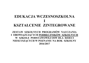 EDUKACJA WCZESNOSZKOLNA I KSZTAŁCENIE ZINTEGROWANE ZESTAW SZKOLNYCH PROGRAMÓW NAUCZANIA I OBOWIĄZUJĄCYCH PODRĘCZNIKÓW SZKOLNYCH W SZKOLE PODSTAWOWEJ OSW DLA DZIECI NIESŁYSZĄCYCH W POZNANIU NA ROK SZKOLNY 2016/2017 Tytuł Autor Wydawnictwo Nr dopuszczenia K L A S A 1 (EDUKACJA WCZESNOSZKOLNA) Obowiązujące programy „Witaj szkoło” Program nauczania dla klas 1 - 3 szkoły podstawowej. Edukacja wczesnoszkolna. Anna Korcz, D. Zagrodzka, A. Twardowska Obowiązujące podręczniki „Witaj szkoło” - klasa 1 Anna Korcz, D. Zagrodzka, J. Babicka i in. „Young Treetops 1” (podręcznik + ćwiczenia) Sarah M. Howell Wyd. “Oxford” JĘZYK MIGOWY KLASA 1 Obowiązujące programy 59/1/2009 JĘZYK ANGIELSKI KLASA 1 Obowiązujące programy Obowiązujące podręczniki „Edukacja Polska” Program nauczania języka ( program autorski – B. OSW S.P. XIV Obowiązujące podręczniki migowego dla niesłyszących Pudełko ) „Pięć paluszków u ręki” D. Hevier, J. Mistrik, M. Stevkova KLASA 1 WSiP S-I-4/97 RELIGIA Obowiązujące programy Program nauczania religii „W drodze do wieczernika” J. Szpet, D. Jackowiak DiKŚW AZ-1-01/10 Obowiązujące podręczniki „Jesteśmy w rodzinie Pana Jezusa” (red.) J. Szpet, D. Jackowiak DiKŚW AZ-11-01/10-PO-1/11 KLASA 1 Obowiązujące programy KLASA 1 LOGORYTMIKA Program nauczania logorytmiki w szkole podstawowej dla dzieci niesłyszących Program autorski opracowany przez Agatę Fąfrowicz OSW S.P. VI WYCHOWANIE FIZYCZNE Obowiązujące programy Program nauczania wychowania fizycznego w szkole podstawowej Obowiązujące programy „Witaj szkoło” Program nauczania dla klas 1 - 3 szkoły podstawowej. DKW-4014-14/01 K L A S A 2 (EDUKACJA WCZESNOSZKOLNA) Anna Korcz, D. Zagrodzka, Edukacja wczesnoszkolna. Obowiązujące podręczniki A. Twardowska „Witaj szkoło” - klasa 2 (semestr I) Anna Korcz, „Edukacja Polska” JĘZYK ANGIELSKI KLASA 2 Obowiązujące programy Język angielski w zintegrowanym nauczaniu początkowym. Program nauczania dla klas 1 – 3 szkoły podstawowej. I etap edukacyjny. M. Szpotowicz, M. Szulc Kurpaska Oxford University Press Obowiązujące podręczniki „Young Treetops 2” (podręcznik + ćwiczenia) Sarah M. Howell Wyd. “Oxford” DKW 4014-8/00 JĘZYK MIGOWY KLASA 2 Obowiązujące programy Program nauczania języka migowego dla niesłyszących ( program autorski – B. Pudełko ) Obowiązujące podręczniki „Pięć paluszków u ręki” D. Hevier, J. Mistrik, M. Stevkova KLASA 2 Obowiązujące 59/2/2010 D. Zagrodzka, J. Babicka i in. OSW S.P. XIV WSiP S-I-4/97 RELIGIA Program nauczania religii J. Szpet, D. Jackowiak DiKŚW AZ-1-01/10 programy Obowiązujące podręczniki „W drodze do wieczernika” „Kochamy Pana Jezusa ” (red.) J. Szpet, D. Jackowiak KLASA 2 Obowiązujące programy LOGORYTMIKA Program nauczania logorytmiki w szkole podstawowej dla dzieci niesłyszących KLASA 2 Obowiązujące programy DiKŚW OSW S.P. VI Program autorski opracowany przez Agatę Fąfrowicz WYCHOWANIE FIZYCZNE Program nauczania wychowania fizycznego w szkole podstawowej DKW-4014-14/01 K L A S A 3 (KSZTAŁCENIE ZINTEGROWANE) Obowiązujące programy „Witaj szkoło” Program nauczania dla klas 1 - 3 szkoły podstawowej. Edukacja wczesnoszkolna. Anna Korcz, D. Zagrodzka, A. Twardowska Obowiązujące podręczniki „Witaj szkoło” - klasa 3 Anna Korcz, D. Zagrodzka, J. Babicka i in. „Edukacja Polska” JĘZYK ANGIELSKI KLASA 3 Obowiązujące programy Język angielski w zintegrowanym nauczaniu początkowym. Program nauczanie dla klas 1 – 3 szkoły podstawowej. I etap edukacyjny. M. Szpotowicz, M. Szulc Kurpaska Oxford University Press Obowiązujące podręczniki „Treetops 3” (zeszyt ćwiczeń) – bez podręcznika Sarah M. Howell i Lisa Kester - Dodgson Wyd. “Oxford” DKW 4014-8/00 JĘZYK MIGOWY KLASA 3 Obowiązujące programy Program nauczania języka migowego dla niesłyszących ( program autorski – B. Pudełko ) Obowiązujące podręczniki „Pięć paluszków u ręki” D. Hevier, J. Mistrik, M. Stevkova KLASA 3 OSW S.P. XIV WSiP S-I-4/97 RELIGIA Obowiązujące programy Program nauczania religii „Jesteśmy dziećmi Bożymi” J. Szpet, D. Jackowiak DiKŚW AZ-1-01/1 Obowiązujące podręczniki „Jezusowa wspólnota serc” (red.) J. Szpet, D. Jackowiak DiKŚW AZ-13-01/1-2 KLASA 3 Obowiązujące programy KLASA 3 Obowiązujące programy LOGORYTMIKA Program nauczania logorytmiki w szkole podstawowej dla dzieci niesłyszących Program autorski opracowany przez Agatę Fąfrowicz OSW S.P. VI WYCHOWANIE FIZYCZNE Program nauczania wychowania fizycznego w szkole podstawowej DKW-4014-14/01 NAUCZANIE BLOKOWE ZESTAW SZKOLNYCH PROGRAMÓW NAUCZANIA I OBOWIĄZUJĄCYCH PODRĘCZNIKÓW SZKOLNYCH W SZKOLE PODSTAWOWEJ OSW DLA DZIECI NIESŁYSZĄCYCH W POZNANIU NA ROK SZKOLNY 2016/2017 KLASA 4 JĘZYK POLSKI KLASA 4 Obowiązujące programy Program nauczania języka polskiego. Szkoła podstawowa dla dzieci niesłyszących klasy IV -VI Irena Cichosz, Marzenna Garbacz, Barbara Gembara, G. Gryszkiewicz, Maria Gryzło, A. Niewiadomska, B. Wontroba WSiP Obowiązujące podręczniki „Teraz polski” klasa 4 Anna Klimowicz „Nowa Era” KLASA 4 DKW-4014-313/99 HISTORIA I SPOŁECZEŃSTWO Obowiązujące programy „Wczoraj i dziś” Program nauczania ogólnego historii i społeczeństwa w klasach IV – VI szkoły podstawowej. Tomasz Maćkowski Obowiązujące „Wczoraj i dziś” Podręcznik do Grzegorz Wojciechowski „Nowa Era” 443/1/2012 podręczniki historii i społeczeństwa dla klasy 4 JĘZYK ANGIELSKI KLASA 4 Obowiązujące programy Program nauczania języka angielskiego. Kurs dla początkujących, dla klas 4 – 6 szkoły podstawowej. M. Ellis, M. Niesobska, A. Rak Oxford University Press Obowiązujące podręczniki “Team up 1” (podręcznik + ćwiczenia) Philipa Bowen Oxford KLASA 4 DKW-4014-59/99 MATEMATYKA Obowiązujące programy Program nauczania „Matematyka z kluczem” M. Braun, A.Mańkowska, M. Paszyńska Obowi