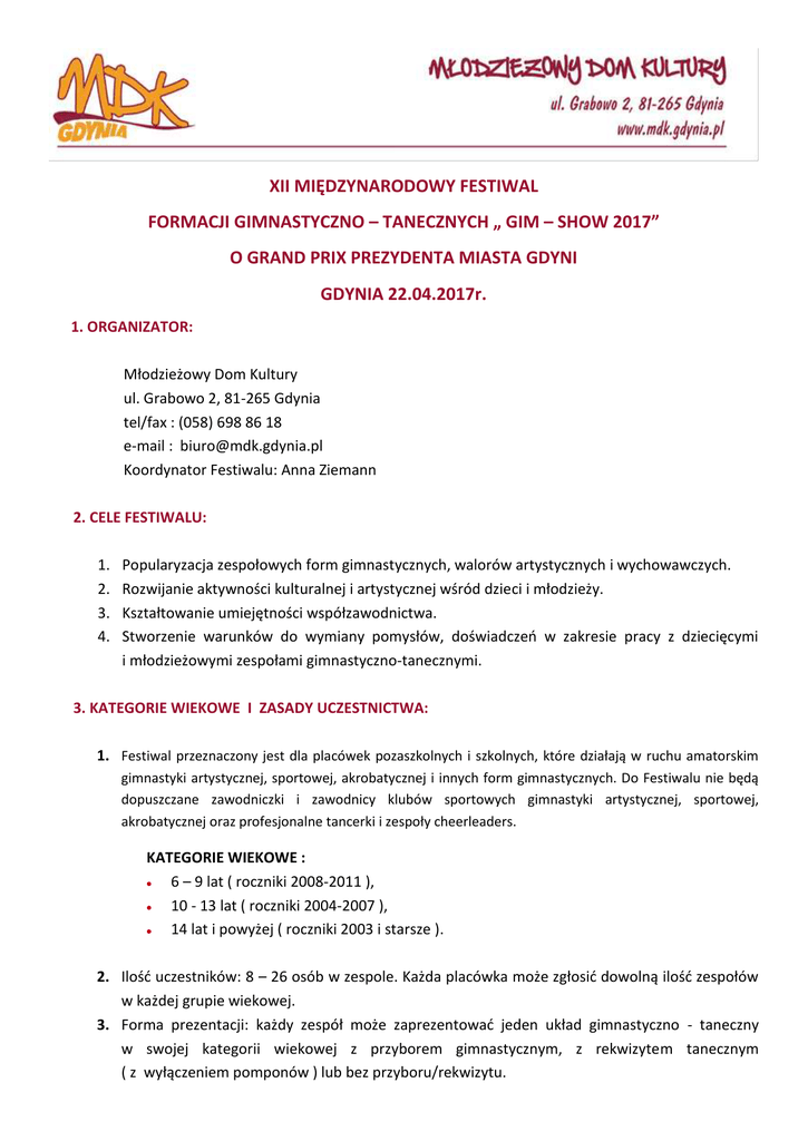 XII MIĘDZYNARODOWY FESTIWAL FORMACJI GIMNASTYCZNO – TANECZNYCH „ GIM – SHOW 2017” O GRAND PRIX PREZYDENTA MIASTA GDYNI GDYNIA 22.04.2017r. 1. ORGANIZATOR: Młodzieżowy Dom Kultury ul. Grabowo 2, 81-265 Gdynia tel/fax : (058) 698 86 18 e-mail : [email protected] Koordynator Festiwalu: Anna Ziemann 2. CELE FESTIWALU: 1. 2. 3. 4. Popularyzacja zespołowych form gimnastycznych, walorów artystycznych i wychowawczych. Rozwijanie aktywności kulturalnej i artystycznej wśród dzieci i młodzieży. Kształtowanie umiejętności współzawodnictwa. Stworzenie warunków do wymiany pomysłów, doświadczeń w zakresie pracy z dziecięcymi i młodzieżowymi zespołami gimnastyczno-tanecznymi. 3. KATEGORIE WIEKOWE I ZASADY UCZESTNICTWA: 1. Festiwal przeznaczony jest dla placówek pozaszkolnych i szkolnych, które działają w ruchu amatorskim gimnastyki artystycznej, sportowej, akrobatycznej i innych form gimnastycznych. Do Festiwalu nie będą dopuszczane zawodniczki i zawodnicy klubów sportowych gimnastyki artystycznej, sportowej, akrobatycznej oraz profesjonalne tancerki i zespoły cheerleaders. KATEGORIE WIEKOWE : 6 – 9 lat ( roczniki 2008-2011 ), 10 - 13 lat ( roczniki 2004-2007 ), 14 lat i powyżej ( roczniki 2003 i starsze ). 2. Ilość uczestników: 8 – 26 osób w zespole. Każda placówka może zgłosić dowolną ilość zespołów w każdej grupie wiekowej. 3. Forma prezentacji: każdy zespół może zaprezentować jeden układ gimnastyczno - taneczny w swojej kategorii wiekowej z przyborem gimnastycznym, z rekwizytem tanecznym ( z wyłączeniem pomponów ) lub bez przyboru/rekwizytu. O przydzieleniu do kategorii wiekowej decyduje wiek większości uczestników. W przypadku, gdy liczba uczestników starszych w danym zespole równa jest młodszym, formacja powinna być zgłoszona do starszej kategorii wiekowej. 4. Czas trwania prezentacji: min. 2 min. do max. 4 min. 5. Muzyka: nagranie, w formacie MP3 lub audio, należy opisać: ( nazwa_zespołu - nazwa_placówki kategoria_wiekowa np.: Bąbelki – MDK Gdynia – 6 - 8lat ) i przesłać pocztą elektroniczną do dnia 01.04.2017r. na adres: [email protected] ( dodatkowo dla pewności konieczne jest posiadanie kopii nagrania na płycie CD lub pendrive USB w formacie MP3 lub audio ). 6. Festiwal odbędzie się na planszy dywanowej o wymiarach 14 m x 16 m. Wszystkie występy będą mogły odbywać się wyłącznie w skarpetkach, baletkach, napalcówkach lub boso. 7. Komisja Sędziowska przyzna nagrodę główną – Grand Prix Festiwalu „Gim-Show 2017” ufundowaną przez Prezydenta Miasta Gdyni za najwyższy poziom artystyczny kompozycji formacji gimnastyczno – tanecznej. Dodatkowo przez Komisję Sędziowską przyznane zostaną nagrody specjalne: w kategorii 6 – 9 lat: Najzabawniejsza Choreografia Najbardziej Radosna Formacja Najlepsza Choreografia w kategorii 10 - 13 lat: Najlepsza Kreacja Artystyczna Najbardziej Oryginalny Wizerunek Najbardziej Oryginalny Przybór Gimnastyczny lub Rekwizyt Taneczny w kategorii 14 lat i powyżej: Największa Trudność Gimnastyczna Największy Wyraz Artystyczny Największa Ekspresja Ruchowa Przyznana zostanie również Nagroda Dyrektora Młodzieżowego Domu Kultury w Gdyni. Każdy uczestnik biorący udział w Festiwalu „Gim-Show 2017” zostanie nagrodzony za swój występ pamiątkową koszulką i medalem. 8. W swojej ocenie jury weźmie pod uwagę: Elementy gimnastyczne, Elementy taneczne, Choreografię, Różnorodność ustawień, Powiązanie muzyki z ruchem tanecznym, Ogólne wrażenie artystyczne. 4. ZASADY ORGANIZACYJNE: 1. Termin Festiwalu: 22.04.2017r. 2. Miejsce Festiwalu: Gdynia Arena Hala Sportowo - Widowiskowa ul. Kazimierza Górskiego 8, Gdynia. 3. Kartę zgłoszenia wraz z potwierdzeniem dokonanej opłaty startowej należy przesłać: drogą elektroniczną na adres: [email protected] lub fax-em pod numer: tel/fax: (58) 698 86 18, 698 63 02 wew.25 w nieprzekraczalnym terminie do 11 marca 2017r. Przy zgłoszeniu obowiązuje wpłata startowego w wysokości 20 zł/os. Wpłaty należy dokonać na konto Młodzieżowego Domu Kultury o nr: 34 1440 1026 0000 0000 0033 9978 lub w kasie Młodzieżowego Domu Kultury. 4. Szczegółowy program Festiwalu wraz z kolejnością występów zespołów zostanie dostarczony pocztą elektroniczną do dnia 15 kwietnia 2017 r. 5. Uczestnicy lub delegujące ich placówki zobowiązani są do pokrycia wszelkich kosztów związanych z przejazdem i pobytem podczas Festiwalu. 6. Każdy uczestnik w wieku szkolnym zobowiązany jest do posiadania ważnej legitymacji szkolnej. 5. UWAGI I POSTANOWIENIA KOŃCOWE: Przesyłając kartę zgłoszenia uczestnicy Festiwalu automatycznie wyrażają zgodę na bezpłatną rejestrację i ewentualną retransmisję prezentowanych układów choreograficznych oraz przetwarzanie zapisanego obrazu przez media telewizyjne w dowolny sposób. Każdy przebywający na Festiwalu ma obowiązek przestrzegać zaleceń organizatora, przepisów p/poż. i b.h.p. Organizator nie odpowiada za rzeczy pozostawione w szatniach. W sprawach finansowych i zakwaterowania można kontaktować się z p. Mirosławą Okroj, sekretariat MDK, tel.: 58 698 63 02. W kwestiach organizacyjno-regulaminowych można kontaktować się z p. Anną Ziemann, tel.: 609 456 398. Koordynator Festiwalu Anna Ziemann Kierownik Działu Sportu i Rekreacji Tatiana Różankiewicz