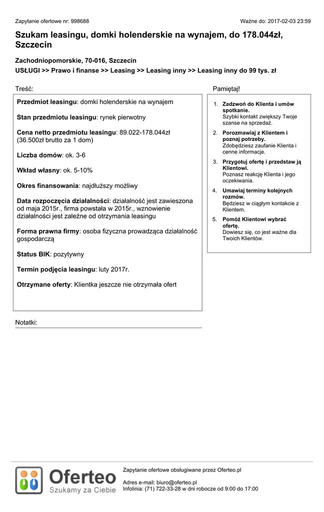 Zapytanie ofertowe nr: 998688 Ważne do: 2017-02-03 23:59 Szukam leasingu, domki holenderskie na wynajem, do 178.044zł, Szczecin Zachodniopomorskie, 70-016, Szczecin USŁUGI >> Prawo i finanse >> Leasing >> Leasing inny >> Leasing inny do 99 tys. zł Treść: Pamiętaj! Przedmiot leasingu: domki holenderskie na wynajem 1. Zadzwoń do Klienta i umów spotkanie. Szybki kontakt zwiększy Twoje szanse na sprzedaż. Stan przedmiotu leasingu: rynek pierwotny Cena netto przedmiotu leasingu: 89.022-178.044zł (36.500zł brutto za 1 dom) Liczba domów: ok. 3-6 Wkład własny: ok. 5-10% Okres finansowania: najdłuższy możliwy Data rozpoczęcia działalności: działalność jest zawieszona od maja 2015r., firma powstała w 2015r., wznowienie działalności jest zależne od otrzymania leasingu Forma prawna firmy: osoba fizyczna prowadząca działalność gospodarczą 2. Porozmawiaj z Klientem i poznaj potrzeby. Zdobędziesz zaufanie Klienta i cenne informacje. 3. Przygotuj ofertę i przedstaw ją Klientowi. Poznasz reakcję Klienta i jego oczekiwania. 4. Umawiaj terminy kolejnych rozmów. Będziesz w ciągłym kontakcie z Klientem. 5. Pomóż Klientowi wybrać ofertę. Dowiesz się, co jest ważne dla Twoich Klientów. Status BIK: pozytywny Termin podjęcia leasingu: luty 2017r. Otrzymane oferty: Klientka jeszcze nie otrzymała ofert Notatki: Zapytanie ofertowe obsługiwane przez Oferteo.pl Adres e-mail: [email protected] Infolinia: (71) 722-33-28 w dni robocze od 9:00 do 17:00