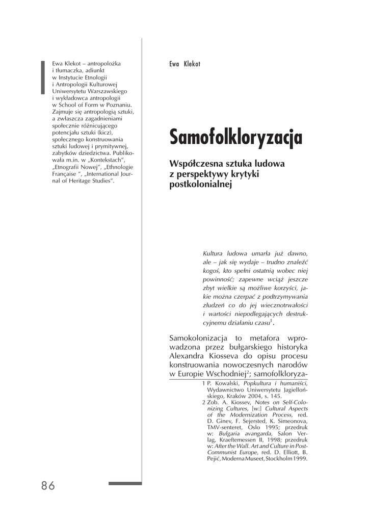 Ewa Klekot – antropolożka i tłumaczka, adiunkt w Instytucie Etnologii i Antropologii Kulturowej Uniwersytetu Warszawskiego i wykładowca antropologii w School of Form w Poznaniu. Zajmuje się antropologią sztuki, a zwłaszcza zagadnieniami społecznie różnicującego potencjału sztuki (kicz), społecznego konstruowania sztuki ludowej i prymitywnej, zabytków dziedzictwa. Publikowała m.in. w „Kontekstach”, „Etnografii Nowej”, „Ethnologie Française ”, „International Journal of Heritage Studies”. (ZD .OHNRW 6DPRIRONORU\]DFMD Współczesna sztuka ludowa z perspektywy krytyki postkolonialnej Kultura ludowa umarła już dawno, ale – jak się wydaje – trudno znaleźć kogoś, kto spełni ostatnią wobec niej powinność; zapewne wciąż jeszcze zbyt wielkie są możliwe korzyści, jakie można czerpać z podtrzymywania złudzeń co do jej wiecznotrwałości i wartości niepodlegających destrukcyjnemu działaniu czasu1. Samokolonizacja to metafora wprowadzona przez bułgarskiego historyka Alexandra Kiosseva do opisu procesu konstruowania nowoczesnych narodów w Europie Wschodniej2; samofolkloryza1 P. Kowalski, Popkultura i humaniści, Wydawnictwo Uniwersytetu Jagiellońskiego, Kraków 2004, s. 145. 2 Zob. A. Kiossev, Notes on Self-Colonizing Cultures, [w:] Cultural Aspects of the Modernization Process, red. D. Ginev, F. Sejersted, K. Simeonova, TMV-senteret, Oslo 1995; przedruk w: Bulgaria avangarda, Salon Verlag, Kraeftemessen II, 1998; przedruk w: After the Wall. Art and Culture in PostCommunist Europe, red. D. Elliott, B. Pejić, Moderna Museet, Stockholm 1999. 86 6$02)2/./25<=$&-$ cja to termin mojego autorstwa. W niniejszym artykule chciałabym zinterpretować społeczne konstruowanie pojęć l u d u i l u d o w o ś c i w obszarze zjawisk nazywanych sztuką l u d o w ą jako element procesów modernizacyjnych powiązanych z samokolonizacją, a następnie zwrócić uwagę na zjawisko samofolkloryzacji współczesnych mieszkańców wsi, które, moim zdaniem, także należy do porządku samokolonizacyjego. Zamierzam wskazać, że pomimo emancypacyjnego programu wpisanego w pojęcie s z t u k i l u d o w e j przez jego inteligenckich twórców, określane tą nazwą zjawiska, poddane reifikacji, esencjalizacji i instrumentalizacji, używane były i są do wytwarzania i utwierdzania nierówności społecznych przy udziale samych podporządkowanych. Podejście określane jako teoria postkolonialna3 daje narzędzia do krytycznej analizy kulturowej sytuacji podporządkowania oraz wytwarzających ją praktyk społecznych, w tym mechanizmów dyskursywnych służących konstruowaniu tego podporządkowania poprzez wytwarzanie znaczeń i sensów legitymizujących, a nawet naturalizujących przemoc tej relacji. Równocześnie, odwołując się do propozycji teoretycznych Pierre’a Bourdieu, można przyjąć, że przemoc za pomocą symboli ma potencjał wytwarzania habitusu, czyli w efekcie może prowadzić do ucieleśniania hierarchii społecznych. Podporządkowani nie tylko nie potrafią mówić w sposób zrozumiały dla ludzi wolnych (czyli niepodporządkowanych), ale też nie potrafią się zachowywać jak wolni na poziomie niewerbalnym. Hierarchia stanów czy później klas, podobnie jak hierarchia płci, wytworzyła podporządkowania, które uległy habitualizacji zarówno na poziomie dyskursu, jak i zachowań. Jak długie trwanie mają takie habitualizacje, świadczyć może chociażby studium stosunków pracy w polskich organizacjach gospodarczych autorstwa Janusza Hryniewicza, w którym autor posługuje się w analizie współczesnych przedsiębiorstw metaforą „folwarczności” stosunków pracy4. Niemal trzydzieści lat temu polski etnolog Ludwik Stomma sporządził statystykę zawartości siedmiu tomów Dzieł Oskara Kolberga poświęconych Mazowszu, analizując ją w oparciu o kategorie tematyczne. Wniosek był następujący: „wesołym zajęciom, związanym przede wszystkim z czasem wolnym (poz. 6, 7, 8, 11, 12 [obrzędy doroczne, obrzędy rodzinne, pieśni i tańce, legendy, gry i zabawy]) poświęcone jest 84% kolbergowego obrazu wsi”5. „Nie podliczamy tego bynajmniej – pisał dalej Stomma – w celu znęcania się nad bezcennym klasykiem. Warto jednak uświadomić sobie, z jakich to przesłanek wyrastała pokaźna większość późniejszych literackich (nie wspominając już o filmowych) wizji wsi; wizji, które dość skutecznie ukształtowały nie tylko inteligencką opinię https://www.academia.edu/3477652/The_Self-Colonization_Cultures; A. Kiossev, Self-Colonizing Metaphor, [w:] Atlas of Transformation, 2011 http://monumenttotransformation. org/atlas-of-transformation/html/s/self-colonization/the-self-colonizing-metaphor-alexander-kiossev.html. 3 L. Gandhi. Teoria postkolonialna, przeł. J. Serwański, Wydawnictwo Poznańskie, Poznań 2008. 4 J.T. Hryniewicz, Stosunki pracy w polskich organizacjach, Scholar, Warszawa 2007, zwł. s. 30–47, 196–202. 5 L. Stomma, Antropologia kultury wsi polskiej XIX w., Instytut Wydawniczy PAX, Warszawa 1986, s. 236. 87 EWA KLEKOT publiczną, ale nawet podświadomość części etnografów...”6. Książka Stommy była i nadal pozostaje ważnym głosem w krytycznej dyskusji nad „ludowością”, „kulturą ludową” oraz ich związkiem z wsią i chłopskością, która cały czas toczy się w polskiej humanistyce, to słabnąc, to przybierając na sile. Stomma z jednej strony kładł nacisk na sugestywność i siłę oddziaływania kolbergowskiej wizji wsi, która zresztą wpisywała się w o wiele starsze od niej toposy istniejące w polskiej kulturze i literaturze7, a z drugiej wskazywał na mechanizmy selekcyjne zastosowane przy konstruowaniu tej reprezentacji; mechanizmy, które folklorysta Piotr Kowalski nazwał dwa dziesięciolecia później „manipulacją obrazami”, dzięki której do potocznej wyobraźni trafiły „niezwykle trwałe obrazy rzeczy ludowych”8. „Kultura ludowa”, a wraz z 