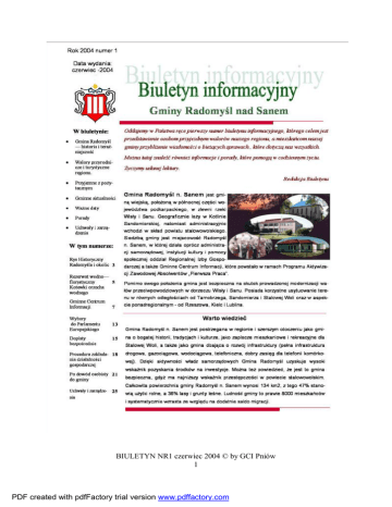 BIULETYN NR1 czerwiec 2004 © by GCI Pniów 1 PDF created with pdfFactory trial version www.pdffactory.com Charakterystyka Gminy Radomyśl n. Sanem. Nasze władze Nasze miejsce na mapie Wójt Gminy: Jan Pyrkosz Sekretarz Gminy:Małgorzata Nowak Przewodniczący Rady Gminy:Marek Pater Skarbnik Gminy:Anna Szeliga Rada Gminy Na 5 695 uprawnionych do głosowania mieszkańców gminy, do lokali wyborczych udało się 2 791 osób ,czyli niespełna 50%. O wybór ubiegało się 63 kandydatów, reprezentujących 12 komitetów wyborczych. W skład nowej Rady Gminy, wybranej 27 października 2002 roku weszli: Marek Bierut Stanisław Brzozowski Elżbieta Drzewi Marzena Garbacz Leopold Haber Zdzisław Koksanowicz Jan Korzybski Stanisław Kosiński Jacek Pamuła Kazimierz Pasztaleniec Marek Pater Piotr Pędrak Zbigniew Ptak Bolesław Puka Edward Wermiński A oto jak w przybliżeniu wyglądają granice administracyjne naszej gminy Obecne władze Gminy Radomyśl nad Sanem niejednokrotnie wykazały się swoją operatywnością i umiejętnością pozyskiwania funduszy, jak również skutecznością w dążeniu do realizacji postawionych celów. Więcej na ten temat w artykule „Radni nie są bezradni” na stronie www.radomysl.pl O tym, że nasze Władze nadal prężnie działają, świadczy fakt zakwalifikowania się Gminy Radomyśl nad Sanem - jako jednej z czterdziestu w kraju - do Programu Inwestycji Komunalnych. Projekt budowy Zakładu Segregacji Odpadów w Radomyślu nad Sanem został BIULETYN NR1 czerwiec 2004 © by GCI Pniów 2 PDF created with pdfFactory trial version www.pdffactory.com wysoko oceniony przez Agencję Rozwoju Komunalnego. Obecnie w gminie zostały zakończone prace, projektowe i uzyskano pozwolenie na budowę, co ułatwi naszemu Samorządowi starania o dofinansowanie z funduszy europejskich i Funduszu Ochrony Środowiska. Mocne strony gminy Lokalizacja i walory turystyczne: Teren Gminy Radomyśl należy do bardzo atrakcyjnych pod względem turystycznym. Z uwagi na wysokie walory przyrodnicze i krajobrazowe znalazł się nieomal w całości w granicach systemu obszarów chronionych: Park Krajobrazowy Lasy Janowskie, projektowany Park Krajobrazowy Środkowej Wisły i projektowany Lipski Obszar Chronionego Krajobrazu. Mocna stroną Gminy jest rozległość terenów i możliwość ich przeznaczenia pod usługi i rzemiosło. Gmina Radomyśl n. Sanem odznacza się również wysokim rozwojem infrastruktury (telefonizacja, wodociągi, gazyfikacja, drogi), Potencjał gospodarczy. Rozwój Gminy Radomyśl n. Sanem wyznaczony został przez przyjętą przez Radę Gminy w 1999 roku Strategię Rozwoju Gminy na lata 2000- 2006. Dotychczasowa realizacja celów Strategii – wykonana w znacznym stopniu – wynikała głównie ze zgłaszanych potrzeb i bazowała w zdecydowanej mierze na inwestycjach infrastrukturalnych. W ostatnich latach wyraźnej poprawie uległ stan infrastruktury technicznej w gminie, zwłaszcza w zakresie ochrony ludności przed powodzią, zaopatrzenia mieszkańców w wodę i poprawy stanu sieci drogowej. Obecnie 16 sołectw wchodzących w skład Gminy Radomyśl n. Sanem posiada sieć gazociągową i praktycznie każde gospodarstwo na terenie gminy ma gaz przewodowy „u drzwi”. Podobnie przedstawia się sprawa telefonizacji. Mieszkańcy korzystają z telefonów w oparciu o 3 centrale automatyczne zlokalizowane w miejscowości Dąbrowa Rzeczycka, Radomyśl n. Sanem i Antoniów, oferujące m.in. stałe łącza SDI i ISDN z dostępem do internetu. Oprócz tego w miejscowości Radomyśl n. Sanem zlokalizowane są stacje bazowe telefonii komórkowej: Era GSM, PTK CENTERTEL oraz niebawem POLKOMTEL S.A. Na terenie gminy wybudowane zostały także 2 stacje uzdatniania wody: jedna w Radomyślu n. Sanem, która w najbliższym czasie zostanie zmodernizowana, druga bardzo nowoczesna w Chwałowicach. Obie stacje obsługują niemalże wszystkich mieszkańców z terenu gminy. W chwili obecnej zwodociągowanych jest 14 miejscowości, kolejna zostanie zaopatrzona w wodę w roku bieżącym Dobrze rozwinięta jest również infrastruktura drogowa. W ciągu ostatnich lat udało się uzyskać taki stan w sieci drogowej, w którym prawie każda miejscowość ma utwardzoną asfaltem drogę dojazdową do głównego szlaku komunikacyjnego. Należy także zwrócić uwagę na fakt, że mimo iż potrzeby w zakresie oświetlenia ulicznego ciągle jeszcze występują, to szczególnie tam, gdzie znajdują się skupiska gospodarstw domowych oraz na głównych ciągach komunikacyjnych - oświetlenie uliczne jest zasadniczo zapewnione. Gmina Radomyśl n. Sanem dysponuje ponadto dużymi uzbrojonymi w infrastrukturę techniczną zasobami terenowymi. Miejscowy plan ogólnego zagospodarowania przestrzennego gminy określa szczegółowo tereny przeznaczone pod działalność produkcyjną i usługową, a także bardzo dużo terenów pod budownictwo jednorodzinne, wyznaczając tym samym dogodne warunki rozwoju działalności gospodarczej i osadnictwa. Część terytorium gminy w jej południowo – wschodniej części obejmuje Park Krajobrazowy Lasy Janowskie. W lasach i nad rzekami występują skupiska zwierząt chronionych i łownych, tworzące wraz z unikalną florą atrakcyjny teren łowiecki dla wędkarzy i myśliwych. Harmonijny krajobraz – obok bogactwa zasobów przyrody, stopnia naturalności oraz stanu środowiska (czystość wód, powietrza) – stanowi jeden z podstawowych elementów decydujących o atrakcyjności turystyczno- wypoczynkowej gminy Radomyśl n. Sanem. Wśród szerokiego wachlarza planów na najbliższe lata przygotowane są również BIULETYN NR1 czerwiec 2004 © by GCI Pniów 3 PDF created with pdfFactory trial version www.pdffactory.com istotne nie tylko dla gminnej społeczności zadania, takie jak na przykład budowa Zakładu Segregacji Odpadów dla Powiatu Stalowowolskiego, mającego na celu zorganizowanie systemu segregacji odpadów komunalnych „u źródeł”, czy też budowa kan