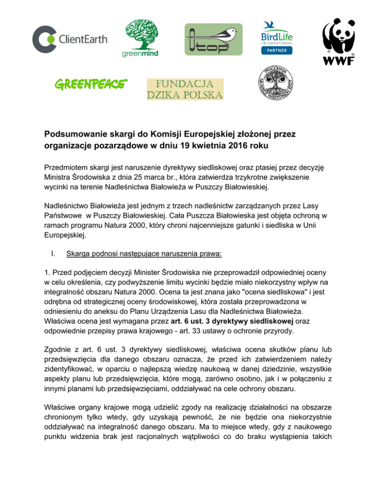Podsumowanie skargi do Komisji Europejskiej złożonej przez organizacje pozarządowe w dniu 19 kwietnia 2016 roku Przedmiotem skargi jest naruszenie dyrektywy siedliskowej oraz ptasiej przez decyzję Ministra Środowiska z dnia 25 marca br., która zatwierdza trzykrotne zwiększenie wycinki na terenie Nadleśnictwa Białowieża w Puszczy Białowieskiej. Nadleśnictwo Białowieża jest jednym z trzech nadleśnictw zarządzanych przez Lasy Państwowe w Puszczy Białowieskiej. Cała Puszcza Białowieska jest objęta ochroną w ramach programu Natura 2000, który chroni najcenniejsze gatunki i siedliska w Unii Europejskiej. I. Skarga podnosi następujące naruszenia prawa: 1. Przed podjęciem decyzji Minister Środowiska nie przeprowadził odpowiedniej oceny w celu określenia, czy podwyższenie limitu wycinki będzie miało niekorzystny wpływ na integralność obszaru Natura 2000. Ocena ta jest znana jako "ocena siedliskowa" i jest odrębna od strategicznej oceny środowiskowej, która została przeprowadzona w odniesieniu do aneksu do Planu Urządzenia Lasu dla Nadleśnictwa Białowieża. Właściwa ocena jest wymagana przez art. 6 ust. 3 dyrektywy siedliskowej oraz odpowiednie przepisy prawa krajowego - art. 33 ustawy o ochronie przyrody. Zgodnie z art. 6 ust. 3 dyrektywy siedliskowej, właściwa ocena skutków planu lub przedsięwzięcia dla danego obszaru oznacza, że przed ich zatwierdzeniem należy zidentyfikować, w oparciu o najlepszą wiedzę naukową w danej dziedzinie, wszystkie aspekty planu lub przedsięwzięcia, które mogą, zarówno osobno, jak i w połączeniu z innymi planami lub przedsięwzięciami, oddziaływać na cele ochrony obszaru. Właściwe organy krajowe mogą udzielić zgody na realizację działalności na obszarze chronionym tylko wtedy, gdy uzyskają pewność, że nie będzie ona niekorzystnie oddziaływać na integralność danego obszaru. Ma to miejsce wtedy, gdy z naukowego punktu widzenia brak jest racjonalnych wątpliwości co do braku wystąpienia takich oddziaływań. Nadto, jeżeli w oparciu o zasadę przezorności nie daje się wykluczyć negatywnych wpływów na integralność obszaru należy przyjąć, że one wystąpią. Prognoza oddziaływania na środowisko przeprowadzona dla pierwotnej wersji aneksu do Planu Urządzenia Lasu dla Nadleśnictwa Białowieża nie jest właściwą oceną odpowiadającą warunkom z dyrektywy siedliskowej. Charakteryzują ją luki i brak całościowych, precyzyjnych i ostatecznych spostrzeżeń i wniosków, które mogłyby rozwiać z naukowego punktu widzenia wszelkie rozsądne wątpliwości w odniesieniu do skutków tego planu dla obszaru Puszcza Białowieska, w szczególności dla siedlisk i gatunków chronionych, których ochrona stanowi jeden z celów tego obszaru. 2. Decyzja ministra narusza również artykuł 6 ust. 2 dyrektywy siedliskowej, ponieważ nie zostały podjęte odpowiednie środki w celu: a. uniknięcia pogorszenia stanu siedlisk przyrodniczych i siedlisk gatunków, dla których teren został objęty ochroną; i b. uniknięcia niepokojenia gatunków, dla których teren został wyznaczony. Aktywność kornika drukarza jest używana przez Ministerstwo Środowiska, jako uzasadnienie do podjęcia "odpowiednich kroków" w celu zapobiegnięcia pogorszeniu stanu siedlisk, jak wynika z artykułu 6 ust. 2 dyrektywy siedliskowej. Jednakże jego występowanie jest wynikiem warunków naturalnych, zjawiskiem, które nie może być interpretowane jako "pogorszenie" w rozumieniu art. 6 ust. 2 dyrektywy. Występowanie kornika stanowi część normalnego funkcjonowania ekosystemu w Puszczy Białowieskiej. Po II wojnie światowej, gradacja kornika wystąpiła tu siedem razy, tworząc cykle co 8-10 lat. Wszystkie te gradacje zmalały po 3-5 latach. Należy podkreślić, że na terenie Białowieskiego Parku Narodowego, gdzie od wielu lat nie prowadzi się gospodarki leśnej, stan ochrony wszystkich leśnych siedlisk przyrodniczych został oceniony jako korzystny. Brak użytkowania rębnego i brak cięć sanitarnych ma więc pozytywny wpływ na stan ochrony siedlisk przyrodniczych. Ponadto, w Puszczy Białowieskiej przeprowadzono wiele badań lokalnych, które udowodniły, że gradacje owadów zwiększają różnorodność biologiczną, wspierając wiele grup organizmów, szczególnie tych, które są zagrożone wyginięciem i stanowią gatunki priorytetowe w sieci Natura 2000. Dlatego zwiększona wycinka drzew doprowadzi do znaczących zakłóceń na skutek usuwania zasiedlonych drzew, co w rezultacie doprowadzi do pogorszenia stanu siedlisk: ○ Usunięcie drzew będzie oznaczało utratę siedlisk, miejsc gniazdowania, źródeł pokarmu dla wielu organizmów. ○ Zostanie utracone siedlisko martwego/rozkładającego się drewna – jest ono istotne dla wielu gatunków, zarówno bezpośrednio, jak i pośrednio. ○ Przerwanie wielu procesów, prowadzące do pogorszenia różnych parametrów stanu ochrony przedmiotowych siedlisk. ○ Zakłócenie funkcjonowania gatunków chronionych przez operacje związane z pozyskiwaniem drewna. ○ Operacje związane z usuwaniem obumierających drzew (zrywka, składowanie, wywózka) zwiększa ryzyko przypadkowego zniszczenia siedliska gatunków chronionych. II. Wniosek o zastosowanie środków tymczasowych Zatwierdzenie aneksu do Planu Urządzenia Lasu przez Ministra Środowiska jest wystarczającą podstawą dla rozpoczęcia pozyskiwania drewna na zwiększonym poziomie. Prawo polskie nie wymaga żadnych dodatkowych pozwoleń, które należy uzyskać przed rozpoczęciem pozyskiwania drewna. Ponieważ okres aktywności kornika na ogół trwa od kwietnia do września, fakt ten będzie najprawdopodobniej wykorzystany jako uzasadnienie dla możliwie jak najwcześniejszego rozpoczęcia wycinki. Z tego powodu zagrożenie nieodwracalną utratą różnorodności biologicznej na obszarze Natura 2000 jest realne, prawdopodobne i nieuchronne. Z tego powodu wystąpiliśmy z wnioskiem o zastoso