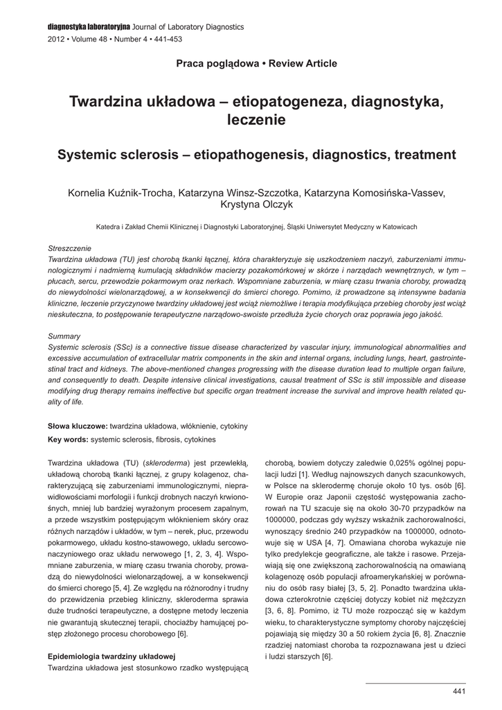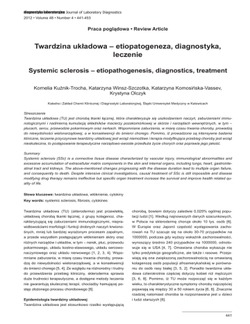 diagnostyka laboratoryjna Journal of Laboratory Diagnostics 2012 • Volume 48 • Number 4 • 441-453 Praca poglądowa • Review Article Twardzina układowa – etiopatogeneza, diagnostyka, leczenie Systemic sclerosis – etiopathogenesis, diagnostics, treatment Kornelia Kuźnik-Trocha, Katarzyna Winsz-Szczotka, Katarzyna Komosińska-Vassev, Krystyna Olczyk Katedra i Zakład Chemii Klinicznej i Diagnostyki Laboratoryjnej, Śląski Uniwersytet Medyczny w Katowicach Streszczenie Twardzina układowa (TU) jest chorobą tkanki łącznej, która charakteryzuje się uszkodzeniem naczyń, zaburzeniami immunologicznymi i nadmierną kumulacją składników macierzy pozakomórkowej w skórze i narządach wewnętrznych, w tym – płucach, sercu, przewodzie pokarmowym oraz nerkach. Wspomniane zaburzenia, w miarę czasu trwania choroby, prowadzą do niewydolności wielonarządowej, a w konsekwencji do śmierci chorego. Pomimo, iż prowadzone są intensywne badania kliniczne, leczenie przyczynowe twardziny układowej jest wciąż niemożliwe i terapia modyfikująca przebieg choroby jest wciąż nieskuteczna, to postępowanie terapeutyczne narządowo-swoiste przedłuża życie chorych oraz poprawia jego jakość. Summary Systemic sclerosis (SSc) is a connective tissue disease characterized by vascular injury, immunological abnormalities and excessive accumulation of extracellular matrix components in the skin and internal organs, including lungs, heart, gastrointestinal tract and kidneys. The above-mentioned changes progressing with the disease duration lead to multiple organ failure, and consequently to death. Despite intensive clinical investigations, causal treatment of SSc is still impossible and disease modifying drug therapy remains ineffective but specific organ treatment increase the survival and improve health related quality of life. Słowa kluczowe:twardzina układowa, włóknienie, cytokiny Key words:systemic sclerosis, fibrosis, cytokines Twardzina układowa (TU) (skleroderma) jest przewlekłą, układową chorobą tkanki łącznej, z grupy kolagenoz, charakteryzującą się zaburzeniami immunologicznymi, nieprawidłowościami morfologii i funkcji drobnych naczyń krwionośnych, mniej lub bardziej wyrażonym procesem zapalnym, a przede wszystkim postępującym włóknieniem skóry oraz różnych narządów i układów, w tym – nerek, płuc, przewodu pokarmowego, układu kostno-stawowego, układu sercowonaczyniowego oraz układu nerwowego [1, 2, 3, 4]. Wspomniane zaburzenia, w miarę czasu trwania choroby, prowadzą do niewydolności wielonarządowej, a w konsekwencji do śmierci chorego [5, 4]. Ze względu na różnorodny i trudny do przewidzenia przebieg kliniczny, skleroderma sprawia duże trudności terapeutyczne, a dostępne metody leczenia nie gwarantują skutecznej terapii, chociażby hamującej postęp złożonego procesu chorobowego [6]. Epidemiologia twardziny układowej Twardzina układowa jest stosunkowo rzadko występującą chorobą, bowiem dotyczy zaledwie 0,025% ogólnej populacji ludzi [1]. Według najnowszych danych szacunkowych, w Polsce na sklerodermę choruje około 10 tys. osób [6]. W Europie oraz Japonii częstość występowania zachorowań na TU szacuje się na około 30-70 przypadków na 1000000, podczas gdy wyższy wskaźnik zachorowalności, wynoszący średnio 240 przypadków na 1000000, odnotowuje się w USA [4, 7]. Omawiana choroba wykazuje nie tylko predylekcje geograficzne, ale także i rasowe. Przejawiają się one zwiększoną zachorowalnością na omawianą kolagenozę osób populacji afroamerykańskiej w porównaniu do osób rasy białej [3, 5, 2]. Ponadto twardzina układowa czterokrotnie częściej dotyczy kobiet niż mężczyzn [3, 6, 8]. Pomimo, iż TU może rozpocząć się w każdym wieku, to charakterystyczne symptomy choroby najczęściej pojawiają się między 30 a 50 rokiem życia [6, 8]. Znacznie rzadziej natomiast choroba ta rozpoznawana jest u dzieci i ludzi starszych [6]. 441 Twardzina układowa – etiopatogeneza, diagnostyka, leczenie Etiologia i patogeneza twardziny układowej Patogeneza twardziny układowej, z uwagi na jej złożoność, wynikającą prawdopodobnie z udziału wielu różnych wzajemnie ze sobą oddziałujących czynników, nie jest do końca wyjaśniona. W etiologii twardziny układowej bierze się bowiem pod uwagę podłoże genetyczne, czynniki środowiskowe, nieprawidłowości w funkcjonowaniu naczyń krwionośnych, utratę tolerancji immunologicznej, zaburzenia procesu biosyntezy i degradacji składników macierzy pozakomórkowej tkanki łącznej oraz czynniki hormonalne [3, 9]. Obecnie przyjmuje się, że występowanie choroby jest wynikiem złożonych interakcji pomiędzy jednym lub kilkoma czynnikami środowiskowymi a predyspozycjami genetycznymi. Te genetyczno-środowiskowe interferencje przejawiają się nieprawidłowościami odczynowości komórkowej i humoralnej, przewlekłym procesem zapalnym z udziałem makrofagów oraz limfocytów T i B, a także nadmiernym uwalnianiem cytokin i czynników wzrostu [3, 10, 11]. Przedstawiona sekwencja zdarzeń osiąga punkt kulminacyjny w biosyntezie swoistych autoprzeciwciał oraz w postępującym procesie włóknienia skóry, tkanek i narządów [10]. O udziale czynnika genetycznego w etiopatogenezie TU może świadczyć ryzyko rodzinnego występowania twardziny (choć nie dziedziczonego według praw Mendla) oraz nierzadkie występowanie tego schorzenia u osób blisko spokrewnionych z chorymi na inne układowe choroby tkanki łącznej [1, 11, 12, 13]. Kolejnych dowodów dostarczają badania wskazujące na zwiększoną częstotliwość występowania antygenów zgodności tkankowej (HLA) klasy II, tj. HLA-DQB1 czy HLA-DRB1, u osób z twardziną układową w porównaniu do osób zdrowych. Występowanie właśnie tych antygenów HLA w sklerodermie wiąże się z obecnością swoistych przeciwciał znamiennych dla tej choroby. I tak allele HLA-DRB1*01, HLA-DQB1*0501, HLA