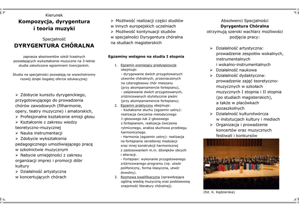 Kierunek Kompozycja, dyrygentura i teoria muzyki Specjalność DYRYGENTURA CHÓRALNA zaprasza absolwentów szkół licealnych posiadających wykształcenie muzyczne na 3-letnie studia zakończone egzaminem licencjackim. Studia na specjalności pozwalają na wszechstronny rozwój dzięki bogatej ofercie edukacyjnej: Zdobycie kunsztu dyrygenckiego, przygotowującego do prowadzenia chórów zawodowych (filharmonie, opery, teatry muzyczne) i amatorskich, Profesjonalne kształcenie emisji głosu Kształcenie z zakresu wiedzy teoretyczno-muzycznej Nauka instrumentacji Zdobycie wykształcenia pedagogicznego umożliwiającego pracę w szkolnictwie muzycznym Nabycie umiejętności z zakresu organizacji imprez i promocji dóbr kultury Działalność artystyczna w koncertujących chórach Możliwość realizacji części studiów w innych europejskich uczelniach Możliwość kontynuacji studiów w specjalności Dyrygentura chóralna na studiach magisterskich Egzaminy wstępne na studia I stopnia 1. Egzamin oceniający predyspozycje obejmuje: - dyrygowanie dwóch przygotowanych utworów chóralnych, przeznaczonych na czterogłosowy chór mieszany (przy akompaniamencie fortepianu), - zaśpiewanie dwóch przygotowanych, zróżnicowanych stylistycznie pieśni (przy akompaniamencie fortepianu). 2. Egzamin praktyczny obejmuje: - Kształcenie słuchu (egzamin ustny): realizacja ćwiczenia melodycznego 1-głosowego lub 2-głosowego z fortepianem, realizacja ćwiczenia rytmicznego, analiza słuchowa przebiegu harmonicznego. - Harmonia (egzamin ustny): realizacja na fortepianie określonej modulacji oraz innej konstrukcji harmonicznej z zastosowaniem m.in. dźwięków obcych i alteracji. - Fortepian: wykonanie przygotowanego zróżnicowanego programu (np. utwór polifoniczny, forma klasyczna, utwór dowolny). 3. Rozmowa kwalifikacyjna (sprawdzająca ogólną wiedzę muzyczną oraz podstawową znajomość literatury chóralnej). Absolwenci Specjalności Dyrygentura Chóralna otrzymują szeroki wachlarz możliwości podjęcia pracy: Działalność artystyczna: prowadzenie zespołów wokalnych, instrumentalnych i wokalno-instrumentalnych Działalność naukowa Działalność dydaktyczna: prowadzenie zajęć teoretycznomuzycznych w szkołach muzycznych I stopnia i II stopnia (po studiach magisterskich), a także w placówkach pozaszkolnych Działalność kulturotwórcza w instytucjach kultury i mediach Organizacja i prowadzenie koncertów oraz muzycznych festiwali i konkursów (fot. K. Kędzierska) Przedmioty realizowane w toku studiów I stopnia: Dyrygentura Czytanie partytur Emisja głosu Zespoły chóralne Instrumentacja Harmonia Kształcenie słuchu Kontrapunkt Historia muzyki powszechnej Literatura muzyczna Analiza form muzycznych (fot. K. Kędzierska) Wydział Kompozycji, Interpretacji, Edukacji i Jazzu Przedmioty realizowane w toku studiów II stopnia: Współczesna literatura chóralna Specjalistyczna literatura muzyczna Partytura współczesna Interpretacja tekstu literackiego z dykcją Wybrane zagadnienia z estetyki i stylistyki muzyki wokalnej XVII i XVIII wieku Propedeutyka dyrygentury symfonicznej Kierunek Kompozycja, dyrygentura i teoria muzyki Specjalność fot. Marek Bebłot Akademia Muzyczna im. Karola Szymanowskiego w Katowicach ul. Zacisze 3 40 – 025 Katowice Tel. /informacja ogólna/ +48 32 779 21 00 www.am.katowice.pl DYRYGENTURA CHÓRALNA