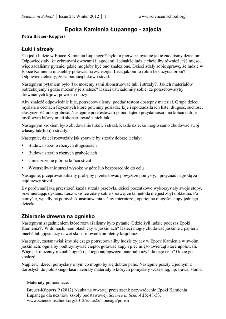 Science in School ⏐ Issue 25: Winter 2012 ⏐ 1 www.scienceinschool.org Epoka Kamienia Łupanego - zajęcia Petra Breuer-Küppers Łuki i strzały 'Co jedli ludzie w Epoce Kamienia Łupanego?' było to pierwsze pytanie jakie zadaliśmy dzieciom. Odpowiedziały, że zebranymi owocami i jagodami. Jednakże ludzie chcieliby również jeść mięso, więc zadaliśmy pytanie, gdzie mogłoby być ono znalezione. Dzieci zdały sobie sprawę, że ludzie w Epoce Kamienia musieliby polować na zwierzęta. Lecz jak oni to robili bez użycia broni? Odpowiedzieliśmy, że za pomocą łuków i strzał. Następnym pytaniem było 'Jak możemy sami skonstruować łuki i strzały?'. Jakich materiałów potrzebujemy i gdzie możemy je znaleźć? Dzieci uświadomiły sobie, że potrzebowałyby drewnianych kijów, powrozu i noży. Aby znaleźć odpowiednie kije, potrzebowaliśmy poddać testom dostępny materiał. Grupa dzieci myślała o cechach fizycznych które powinny posiadać kije i sporządziła ich listę: długość, suchość, elastyczność oraz grubość. Następnie przetestowali je pod kątem przydatności i na końcu dali je myśliwym którzy mieli skonstruować z nich łuki. Następnym krokiem było zbudowanie łuków i strzał. Każde dziecko mogło samo zbudować swój własny łuk(łuki) i strzały. Następnie, dzieci rozważały jak sprawić by strzały dobrze leciały: • Budowa strzał o róznych długościach • Budowa strzał o różnych grubościach • Umieszczenie piór na końcu strzał • Wystrzeliwanie strzał wysoko w górę lub bezpośrednio do celu Następnie, przeprowadziliśmy próbę by przetestować powyższe pomysły, i przyznać nagrodę za najdłuższy strzał. By porównać jaką przestrzeń każda strzała przebyła, dzieci początkowo wykorzystały swoje stopy, przemierzając dystans. Lecz wkrótce zdały sobie sprawę, że ta metoda nie jest zbyt dokładna. Po namyśle, wpadły na pomysł skonstruowania taśmy mierniczej, opartej na długości stopy jednego dziecka. Zbieranie drewna na ognisko Następnym zagadnieniem które rozważaliśmy było pytanie 'Gdzie żyli ludzie podczas Epoki Kamienia?'. W domach, namiotach czy w jaskiniach? Dzieci mogły zbudować jaskinie z papieru maché lub gipsu, czy nawet skonstruować kompletny krajobraz. Następnie, zastanawialiśmy się czego potrzebowaliby ludzie żyjący w Epoce Kamienia w swoim jaskiniach: ognia by podtrzymywać ciepło, gotować zupy i piec mięso zwierząt które upolowali. Więc jak możemy rozpalić ogień i jakiego najlepszego materiału użyć do tego celu? Gdzie go znaleźć. Najpierw, dzieci pomyślały o tym co mogło by się dobrze palić. Następnie poszły z jednym z dorosłych do pobliskiego lasu i zebrały materiały o których pomyślały wcześniej, np: trawa, słoma, Materiały pomocnicze: Breuer-Küppers P (2012) Nauka na otwartej przestrzeni: przywrócenie Epoki Kamienia Łupanego dla uczniów szkoły podstawowej. Science in School 25: 48-53. www.scienceinschool.org/2012/issue25/stoneage/polish Science in School ⏐ Issue 25: Winter 2012 ⏐ 2 www.scienceinschool.org świeże i suche liście, gałązki i konary. Następnie sklasyfikowaliśmy i nazwaliśmy zebrane materiały. Potem, dzieci dyskutowały o kryteriach jakie powinny być spełnione by rozpalić dobre ognisko. Czy surowiec łatwo zajmuje się od ognia? Czy dzięki niemu uzyskujemy dobry ogień czy tylko żar? Czy podczas palenia wytwarza dużo dymu? W końcu, rozpaliliśmy ognisko z materiałów które palą się najlepiej: suchych gałązek i konarów. W razie potrzeby, mogliśmy skorzystać z pomocy strażaków przy rozpalaniu ogniska. Ustanowiliśmy kilka zasad bezpieczeństwa dla uczniów: • Dzieci nie moga być dopuszczone do pracy i zabawy z ogniem bez nadzoru osoby dorosłej. • Używając małych gałązek, stworzyliśmy krąg otaczający ognisko – dzieciom nie wolno było przebywać wewnątrz tego kręgu. • Żadne dziecko nie mogło wyciągać płonącego patyka z ogniska. • Gdy pod koniec dnai opuszczaliśmy łąkę, ogień musiał zostać ugaszony. Budowanie latryny Ludzie w Epoce Kamienia Łupanego również potrzebowali używać toalet. Musieli mieć coś, co je zastępowało. Poprosiliśmy dzieci by rozważyły czego potrzebowały by do zbudowania prymitywnej latryny. Dzieci po namyśle przedstawiły propozycje: dziura w ziemi i parawan zapewniający prywatność. Do zbudowania przesłony zdecydowały się użyć konarów i małych patyków. Zaletą dziury w ziemi jest to, że idąc do domu mogłiśmy użyć gleby by zakryć nieczystości. Jedna grupa uczniów zebrała drewniane patyki by zbudować parawan. Inne dzieci wykopały dziurę w ziemi. Użyliśmy do tego celu łopaty, ale można było użyć również kamieni i własnych rąk, chociaż ten sposób byłby cięższy i wolniejszy. Następnie, dzieci użyły metody prób i błędów by znaleźć właściwy sposób na zbudowanie przesłony. Potem, zastosowaliśmy bardziej systematyczne i planowane podejście: najpierw skonstruowaliśmy sam płot używając wielkich patyków a na końcu wypełniliśmy luki liśćmi i mchem. Oczywiście, istnieją alternatywy – na przykład, mógłbyś użyć plandeki zamiast parawanu. W jednym roku, kiedy budowaliśmy latrynę, jako zastępnik dla deski klozetowej użyliśmy wielkiej gałęzi. Możliwe było również zabranie toalety przenośnej. Każde dnia, przed wyjściem na łąke, mówiliśmy wszystkim naszym uczniom by skorzystali ze szkolnej toalety. Podczas dnia, żadne dziecko nie mogło skorzystać z latryny bez uprzedniego zapytania nauczyciela. W końcu, postawiliśmy pytanie dotyczące oznakowania zajętej toalety. Uczniowie zdecydowali się użyć galążki z dołączonym kawałkiem skóry, jako wskaźnikiem gdy ktoś używał latryny, umieszczając go na widoku. Gotowanie zupy Czym żywili się ludzie w Epoce Kamienia? Jakie rośliny były dostępne? Nim wyruszyliśmy na łąkę, dzieci znalazły od