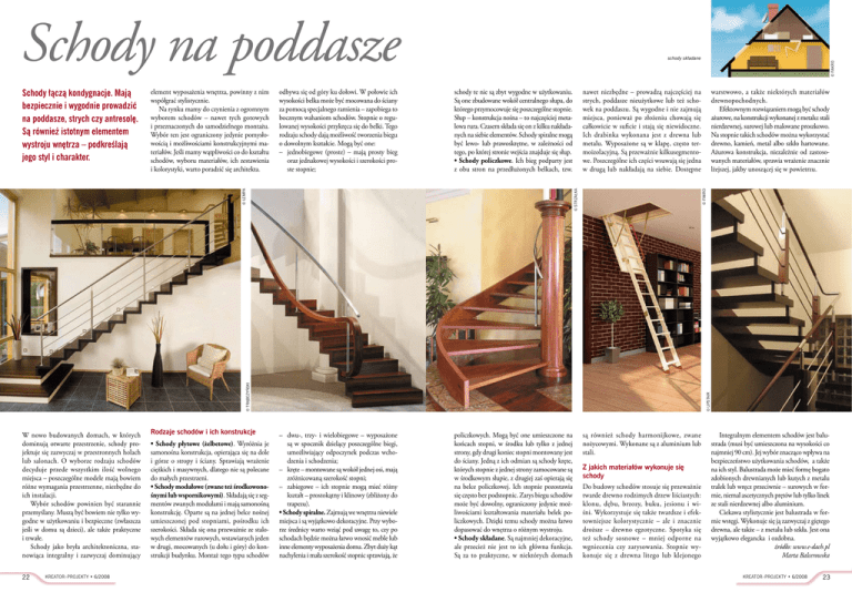 Schody na poddasze odbywa się od góry ku dołowi. W połowie ich wysokości belka może być mocowana do ściany za pomocą specjalnego ramienia – zapobiega to bocznym wahaniom schodów. Stopnie o regulowanej wysokości przykręca się do belki. Tego rodzaju schody dają możliwość tworzenia biegu o dowolnym kształcie. Mogą być one: – jednobiegowe (proste) – mają prosty bieg oraz jednakowej wysokości i szerokości proste stopnie; schody te nie są zbyt wygodne w użytkowaniu. Są one zbudowane wokół centralnego słupa, do którego przymocowuje się poszczególne stopnie. Słup – konstrukcja nośna – to najczęściej metalowa rura. Czasem składa się on z kilku nakładanych na siebie elementów. Schody spiralne mogą być lewo- lub prawoskrętne, w zależności od tego, po której stronie wejścia znajduje się słup. • Schody policzkowe. Ich bieg podparty jest z obu stron na przedłużonych belkach, tzw. – dwu-, trzy- i wielobiegowe – wyposażone są w spocznik dzielący poszczególne biegi, umożliwiający odpoczynek podczas wchodzenia i schodzenia; – kręte – montowane są wokół jednej osi, mają zróżnicowaną szerokość stopni; – zabiegowe – ich stopnie mogą mieć różny kształt – prostokątny i klinowy (zbliżony do trapezu). • Schody spiralne. Zajmują we wnętrzu niewiele miejsca i są wyjątkowo dekoracyjne. Przy wyborze średnicy warto wziąć pod uwagę to, czy po schodach będzie można łatwo wnosić meble lub inne elementy wyposażenia domu. Zbyt duży kąt nachylenia i mała szerokość stopnic sprawiają, że policzkowych. Mogą być one umieszczone na końcach stopni, w środku lub tylko z jednej strony, gdy drugi koniec stopni montowany jest do ściany. Jedną z ich odmian są schody kręte, których stopnie z jednej strony zamocowane są w środkowym słupie, z drugiej zaś opierają się na belce policzkowej. Ich stopnie pozostawia się często bez podstopnic. Zarys biegu schodów może być dowolny, ograniczony jedynie możliwościami kształtowania materiału belek policzkowych. Dzięki temu schody można łatwo dopasować do wnętrza o różnym wystroju. • Schody składane. Są najmniej dekoracyjne, ale przecież nie jest to ich główna funkcja. Są za to praktyczne, w niektórych domach © strzałka 22 KREATOR–PROJEKTY • 6/2008 Rodzaje schodów i ich konstrukcje • Schody płytowe (żelbetowe). Wyróżnia je samonośna konstrukcja, opierająca się na dole i górze o stropy i ściany. Sprawiają wrażenie ciężkich i masywnych, dlatego nie są polecane do małych przestrzeni. • Schody modułowe (zwane też środkowonośnymi lub wspornikowymi). Składają się z segmentów zwanych modułami i mają samonośną konstrukcję. Oparte są na jednej belce nośnej umieszczonej pod stopniami, pośrodku ich szerokości. Składa się ona przeważnie ze stalowych elementów rurowych, wstawianych jeden w drugi, mocowanych (u dołu i góry) do konstrukcji budynku. Montaż tego typu schodów © fakro © upstair © trąbczyński W nowo budowanych domach, w których dominują otwarte przestrzenie, schody projektuje się zazwyczaj w przestronnych holach lub salonach. O wyborze rodzaju schodów decyduje przede wszystkim ilość wolnego miejsca – poszczególne modele mają bowiem różne wymagania przestrzenne, niezbędne do ich instalacji. Wybór schodów powinien być starannie przemyślany. Muszą być bowiem nie tylko wygodne w użytkowaniu i bezpieczne (zwłaszcza jeśli w domu są dzieci), ale także praktyczne i trwałe. Schody jako bryła architektoniczna, stanowiąca integralny i zazwyczaj dominujący warstwowo, a także niektórych materiałów drewnopochodnych. Efektownym rozwiązaniem mogą być schody ażurowe, na konstrukcji wykonanej z metalu: stali nierdzewnej, surowej lub malowane proszkowo. Na stopnie takich schodów można wykorzystać drewno, kamień, metal albo szkło hartowane. Ażurowa konstrukcja, niezależnie od zastosowanych materiałów, sprawia wrażenie znacznie lżejszej, jakby unoszącej się w powietrzu. nawet niezbędne – prowadzą najczęściej na strych, poddasze nieużytkowe lub też schowek na poddaszu. Są wygodne i nie zajmują miejsca, ponieważ po złożeniu chowają się całkowicie w suficie i stają się niewidoczne. Ich drabinka wykonana jest z drewna lub metalu. Wyposażone są w klapę, często termoizolacyjną. Są przeważnie kilkusegmentowe. Poszczególne ich części wsuwają się jedna w drugą lub nakładają na siebie. Dostępne © fakro element wyposażenia wnętrza, powinny z nim współgrać stylistycznie. Na rynku mamy do czynienia z ogromnym wyborem schodów – nawet tych gotowych i przeznaczonych do samodzielnego montażu. Wybór ten jest ograniczony jedynie pomysłowością i możliwościami konstrukcyjnymi materiałów. Jeśli mamy wątpliwości co do kształtu schodów, wyboru materiałów, ich zestawienia i kolorystyki, warto poradzić się architekta. © lempa Schody łączą kondygnacje. Mają bezpiecznie i wygodnie prowadzić na poddasze, strych czy antresolę. Są również istotnym elementem wystroju wnętrza – podkreślają jego styl i charakter. schody składane są również schody harmonijkowe, zwane nożycowymi. Wykonane są z aluminium lub stali. Z jakich materiałów wykonuje się schody Do budowy schodów stosuje się przeważnie twarde drewno rodzimych drzew liściastych: klonu, dębu, brzozy, buku, jesionu i wiśni. Wykorzystuje się także twardsze i efektowniejsze kolorystycznie – ale i znacznie droższe – drewno egzotyczne. Spotyka się też schody sosnowe – mniej odporne na wgniecenia czy zarysowania. Stopnie wykonuje się z drewna litego lub klejonego Integralnym elementem schodów jest balustrada (musi być umieszczona na wysokości co najmniej 90 cm). Jej wybór znacząco wpływa na bezpieczeństwo użytkowania schodów, a także na ich styl. Balustrada może mieć formę bogato zdobionych drewnianych lub kutych z metalu tralek l